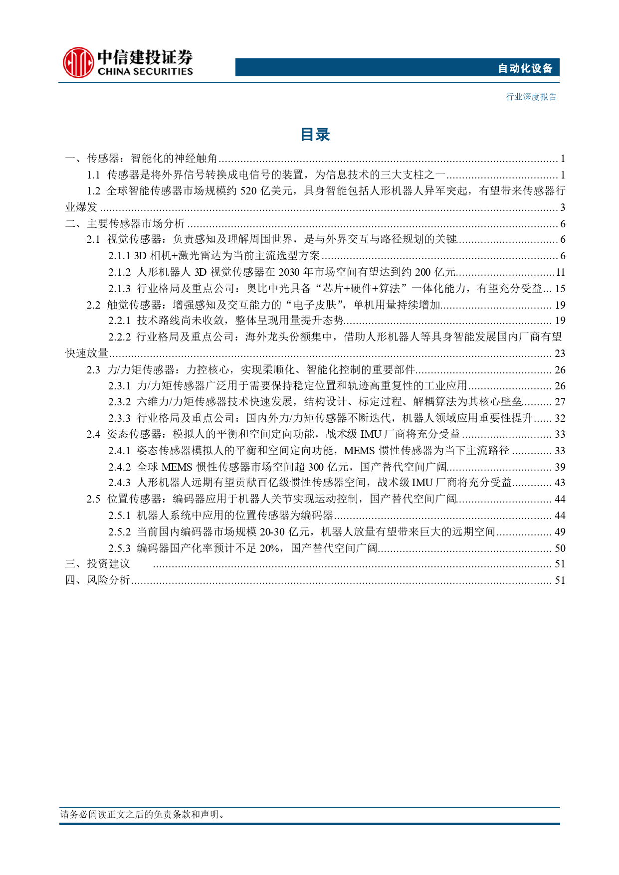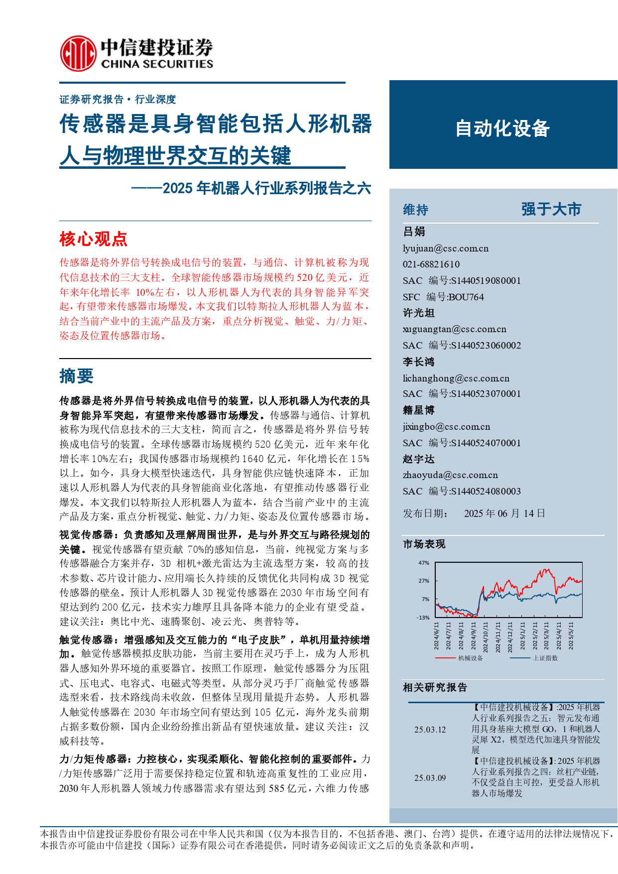 证券研究报告·行业深度自动化设备传感器是具身智能包括人形机器维持强于大市人与物理世界交互的关键吕娟——2025年机器人行业系列报告之六lyujuan@csc.com.cn核心观点021-68821610SAC编号:S1440519080001传感器是将外界信号转换成电信号的装置,与通信、计算机被称为现SFC编号:BOU764代信息技术的三大支柱。全球智能传感器市场规模约520亿美元,近许光坦年来年化增长率10%左右,以人形机器人为代表的具身智能异军突起,有望带来传感器市场爆发。本文我们以特斯拉人形机器人为蓝本,xuguangtan@csc.com.cn结合当前产业中的主流产品及方案,重点分析视觉、触觉、力/力矩、SAC编号:S1440523060002姿态及位置传感器市场。李长鸿摘要lichanghong@csc.com.cnSAC编号:S1440523070001传感器是将外界信号转换成电信号的装...