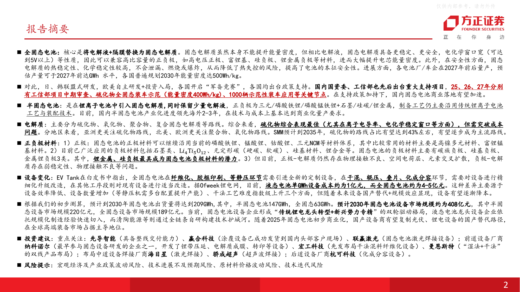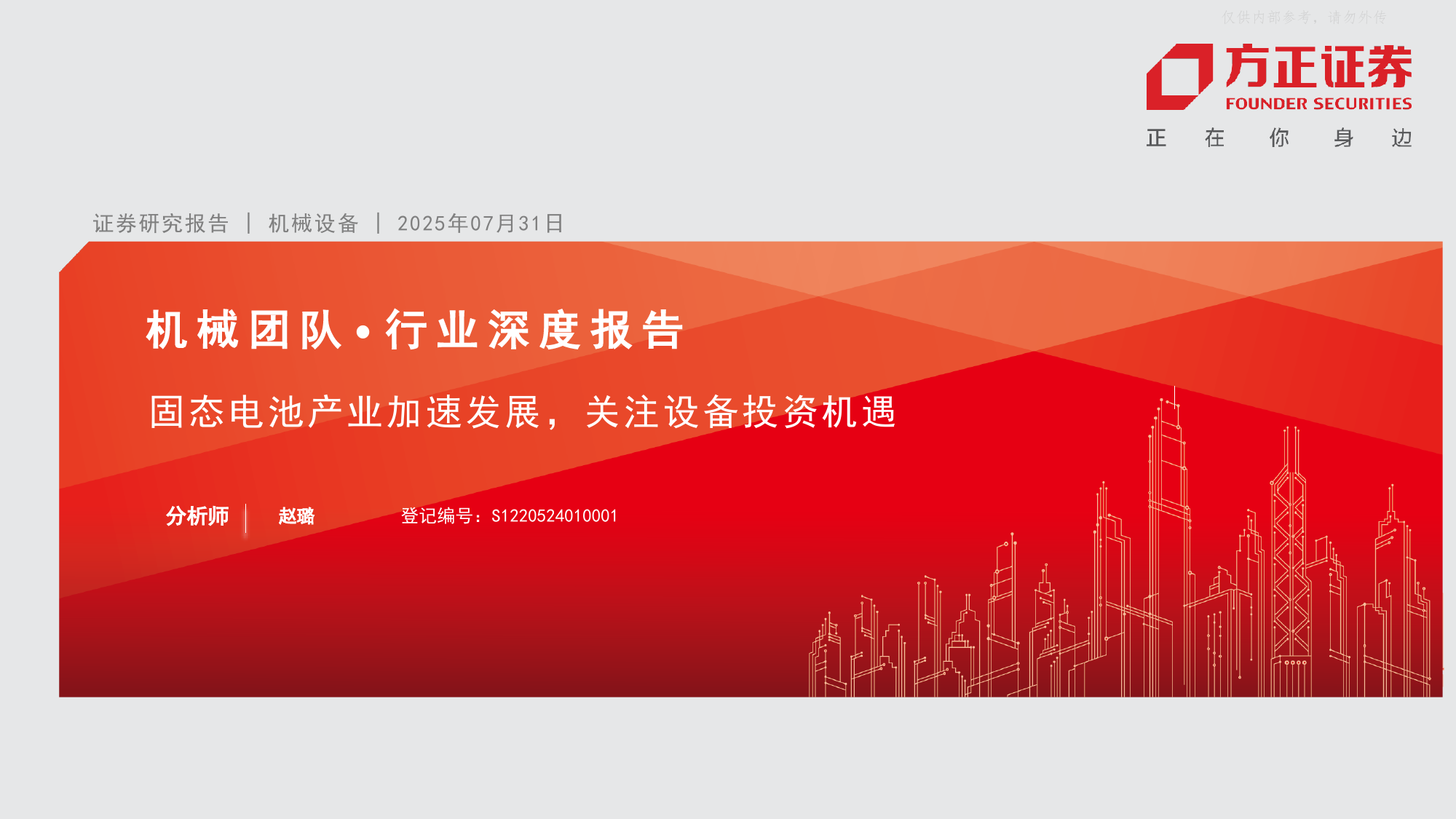 仅供内部参考,请勿外传证券研究报告机械设备2025年07月31日机械团队•行业深度报告固态电池产业加速发展,关注设备投资机遇分析师赵璐登记编号:S1220524010001仅供内部参考,请勿外传报告摘要◼全固态电池:核心是将电解液+隔膜替换为固态电解质。固态电解质虽然本身不能提升能量密度,但相比电解液,固态电解质具备更稳定、更安全,电化学窗口宽(可达到5V以上)等性质,因此可以兼容高比容量的正负极,如高电压正极、富锂基、硅负极、锂金属负极等材料,进而大幅提升电芯能量密度。此外,在安全性方面,固态电解质的热稳定性、化学稳定性较高,不会泄漏、燃烧或爆炸,从而降低了热失控的风险,提高了电池的本征安全性。进展方面,各电池厂/车企在2027年前后量产,预估产量可于2027年前达GWh水平,各国普遍规划...