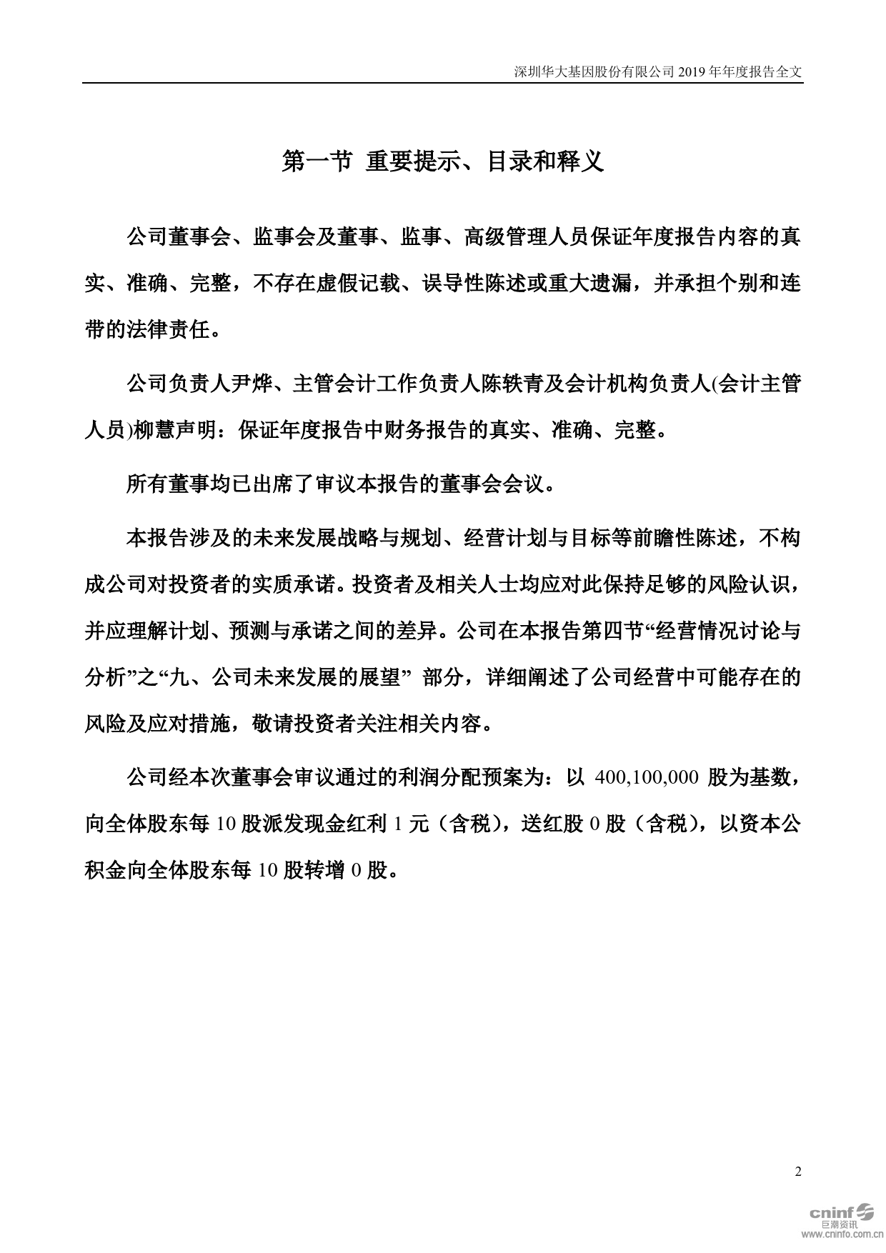 深圳华大基因股份有限公司2019年年度报告全文深圳华大基因股份有限公司2019年年度报告2020年04月1深圳华大基因股份有限公司2019年年度报告全文第一节重要提示、目录和释义公司董事会、监事会及董事、监事、高级管理人员保证年度报告内容的真实、准确、完整,不存在虚假记载、误导性陈述或重大遗漏,并承担个别和连带的法律责任。公司负责人尹烨、主管会计工作负责人陈轶青及会计机构负责人(会计主管人员)柳慧声明:保证年度报告中财务报告的真实、准确、完整。所有董事均已出席了审议本报告的董事会会议。本报告涉及的未来发展战略与规划、经营计划与目标等前瞻性陈述,不构成公司对投资者的实质承诺。投资者及相关人士均应对此保持足够的风险认识,并应理解计划、预测与承诺之间的差异。公司在本报告第四节“经营...