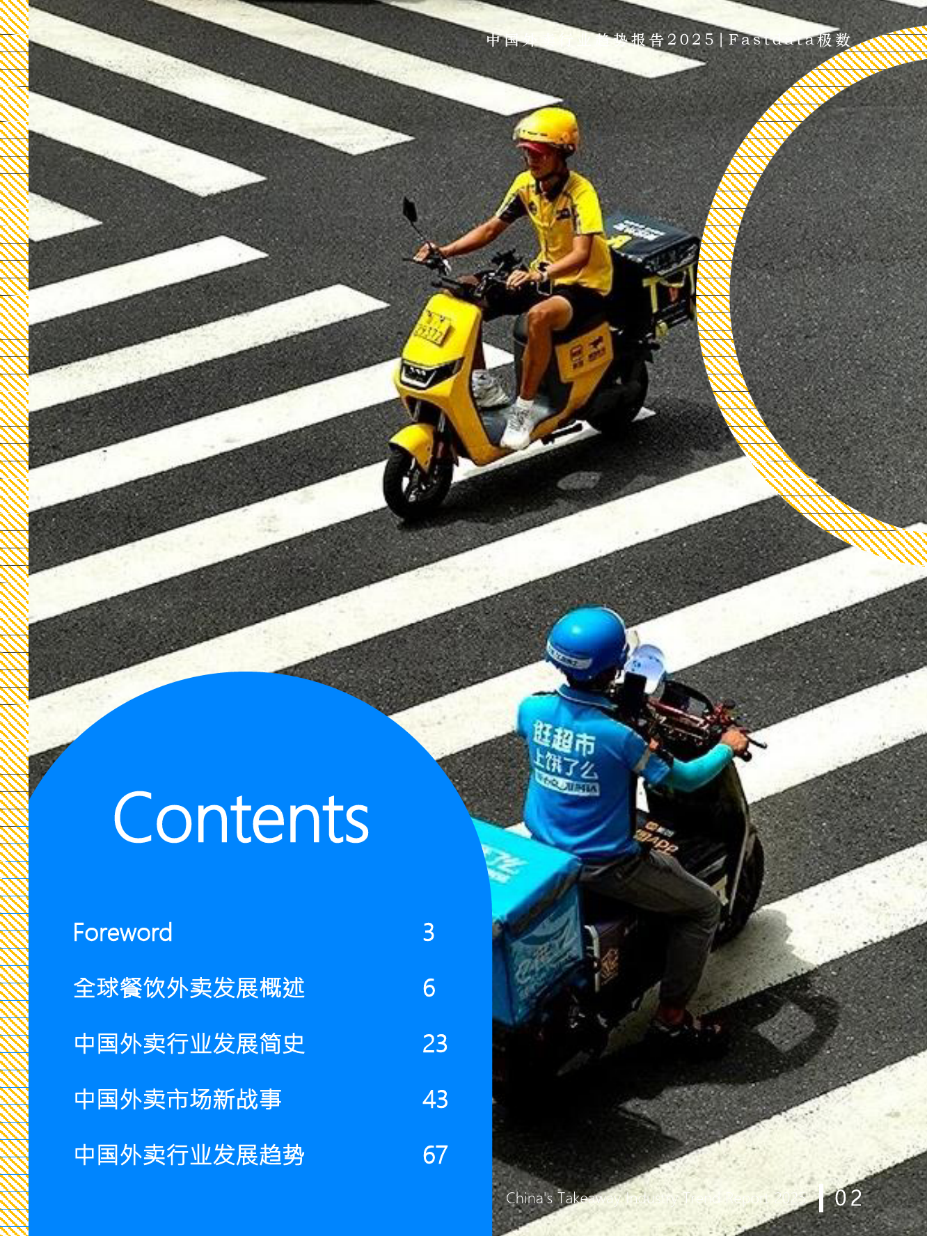 中国外卖行业趋势报告中国外卖行业趋势报告2025Fastdata极数ContentsForeword3全球餐饮外卖发展概述6中国外卖行业发展简史23中国外卖市场新战事43中国外卖行业发展趋势67China'sTakeawayIndustryTrendReport202502Foreword中国外卖行业趋势报告2025Fastdata极数前言2025年2月京东外卖的强势入局,打破了原有的格局,中国外卖行业再次迎来新的大战。京东外卖深刻的了解了之前外卖市场消费者、餐饮商家、外卖骑手的痛点,从食品质量切入,提高外卖骑手待遇、降低商家抽佣比例,重点布局高客单价订单及生鲜、医药等细分品类,与美团、饿了么形成差异化竞争。同时期阿里迅速跟进,推出淘宝闪购,在阿里强力的补贴下,用户规模和订单量快速飙升。在短短的几个月的大战中,中国外卖市场格局已经改写,原有的美团一家独大...