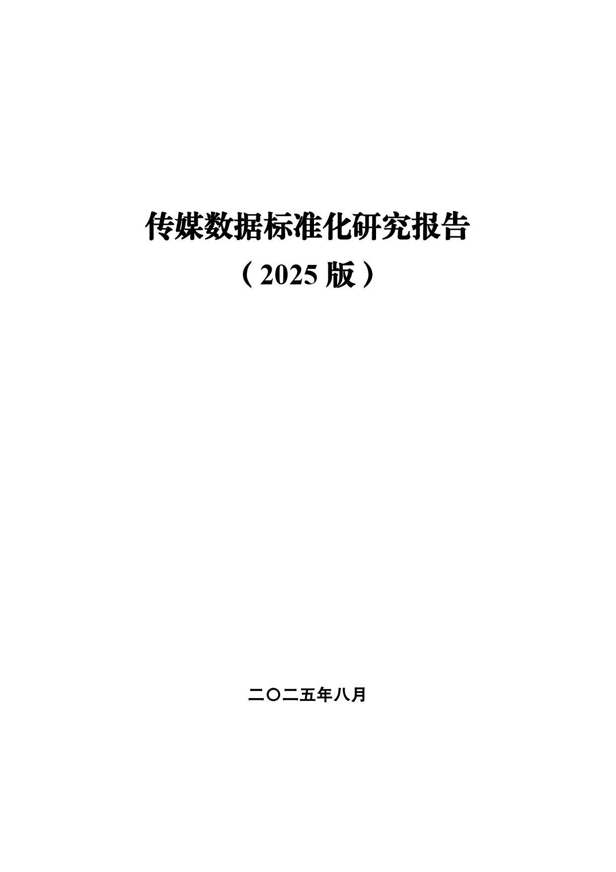 传媒数据标准化研究报告(2025版)二〇二五年八月免责申明:行业报告资源群1.本资料来源于网络公开渠1.进群福利:进群即领万份行业研究、管理方案及其他道,版权归属版权方;学习资源,直接打包下载2.本资料仅限会员学习使用,2.每日分享:6+份行研精选、3个行业主题如他用请联系版权方;3.报告查找:群里直接咨询,免费协助查找4.严禁广告:仅限行业报告交流,禁止一切无关信息3.会员费用作为信息收集整理及运营之必须费用;4.如侵犯您的合法权益,请联系客服微信将及时删除。微信扫码长期有效微信扫码行研无忧知识星球行业与管理资源专业知识社群:每月分享10000+份行业研究报告、市场研究、企业运营及咨询管理方案等,涵盖科技、金融、教育、互联网、房地产、生物制药、医疗健康等全领域;是全网分享数量最多、...