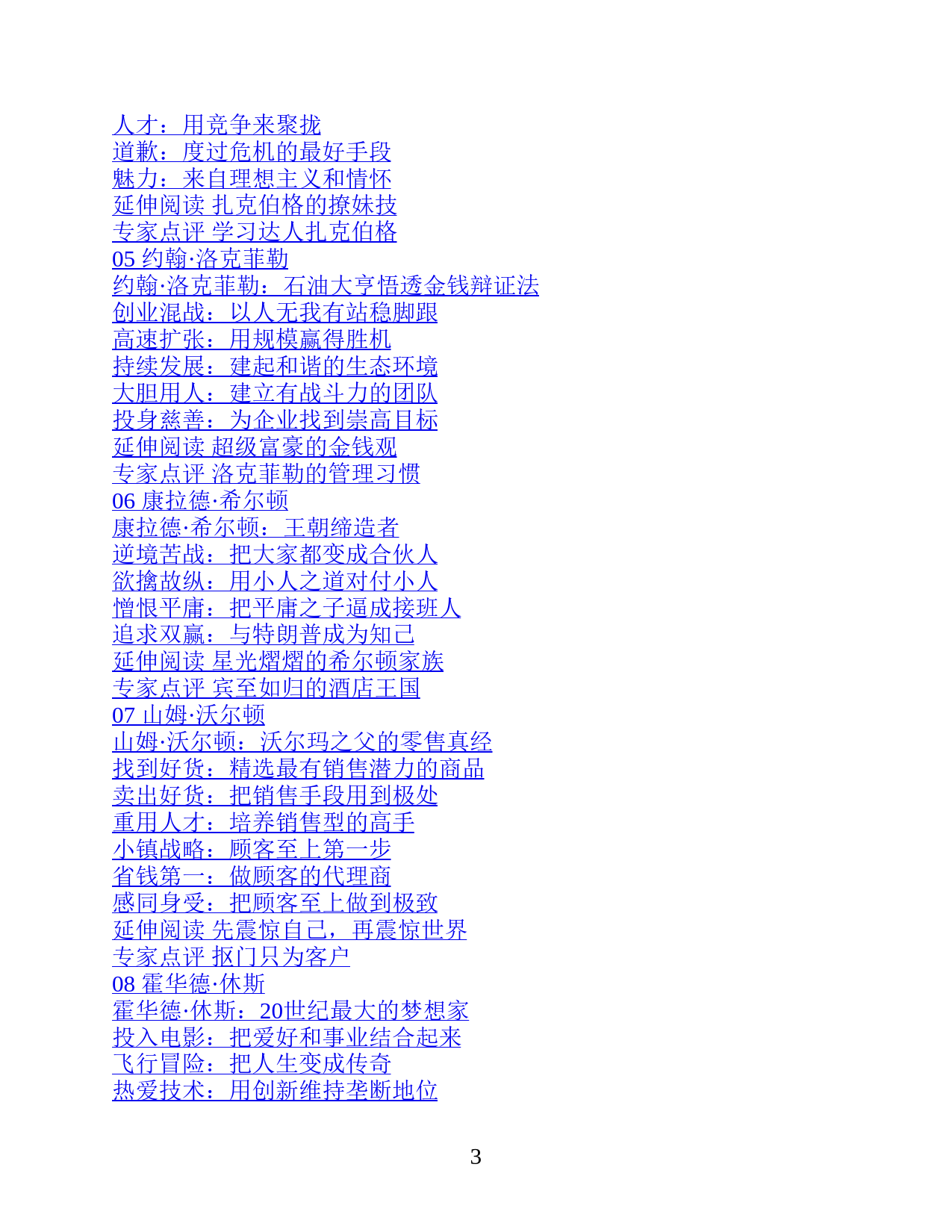 目录序言01杰夫·贝索斯杰夫·贝索斯:全球首富的创新魔力面对起步:从“小一号”的理想开始面对创新:打开通往“是”的大门面对失败:关键是研究“为什么不行”面对强敌:做自己的未来之敌赢得客户:把服务做到极致控制成本:减少利润让客户得实惠留住客户:不断提供增值服务延伸阅读怪咖贝索斯专家点评贝索斯的“用户中心主义”02史蒂夫·乔布斯史蒂夫·乔布斯:改变了世界的疯子团队:让顶级的人才在一起合作营销:把优质的形象灌输到顾客的思想中失误:关键岗位用错了人反击:用人才和产品再创奇迹延伸阅读乔布斯与盖茨专家点评留给这个世界的遗产就是“改变”03埃隆·马斯克钢铁侠马斯克:用疯狂开拓人生思考方式:关注本质的问题行动方式:看到风口趁人少赶快下手做事态度:为事业奉献最投入的自我面对成功...