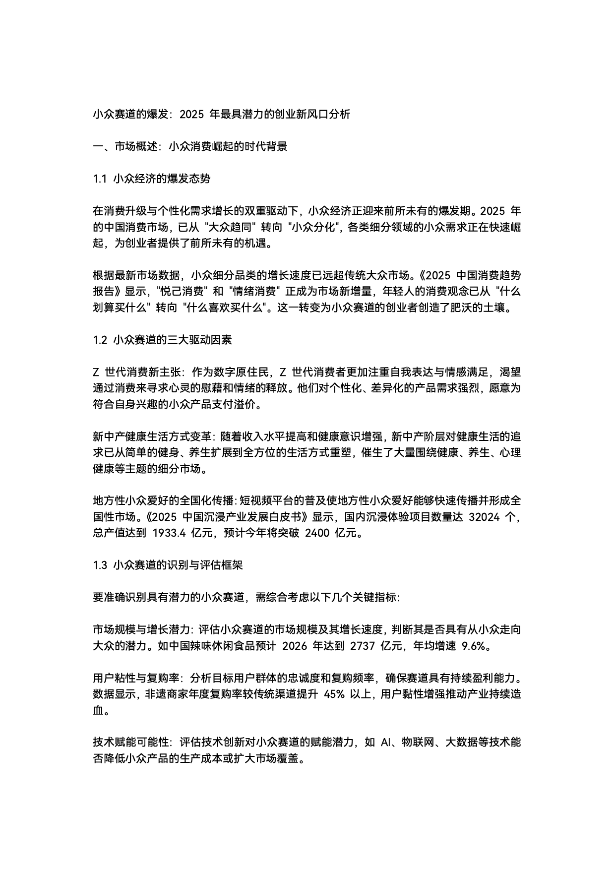 小众赛道的爆发2025年最具潜力的创业新风口分析一市场概述小众消费崛起的时代背景1.1小众经济的爆发态势在消费升级与个性化需求增长的双重驱动下小众经济正迎来前所未有的爆发期2025年的中国消费市场已从"大众趋同"转向"小众分化"各类细分领域的小众需求正在快速崛起为创业者提供了前所未有的机遇根据最新市场数据小众细分品类的增长速度已远超传统大众市场2025中国消费趋势报告显示"悦己消费"和"情绪消费"正成为市场新增量年轻人的消费观念已从"什么划算买什么"转向"什么喜欢买什么"这一转变为小众赛道的创业者创造了肥沃的土壤1.2小众赛道的三大驱动因素Z世代消费新主张作为数字原住民Z世代消费者更加注重自我表达与情感满足渴望通过消费来寻求心灵的慰藉和情绪的释放他们对个性化差异化的产品需求强烈愿意为符...