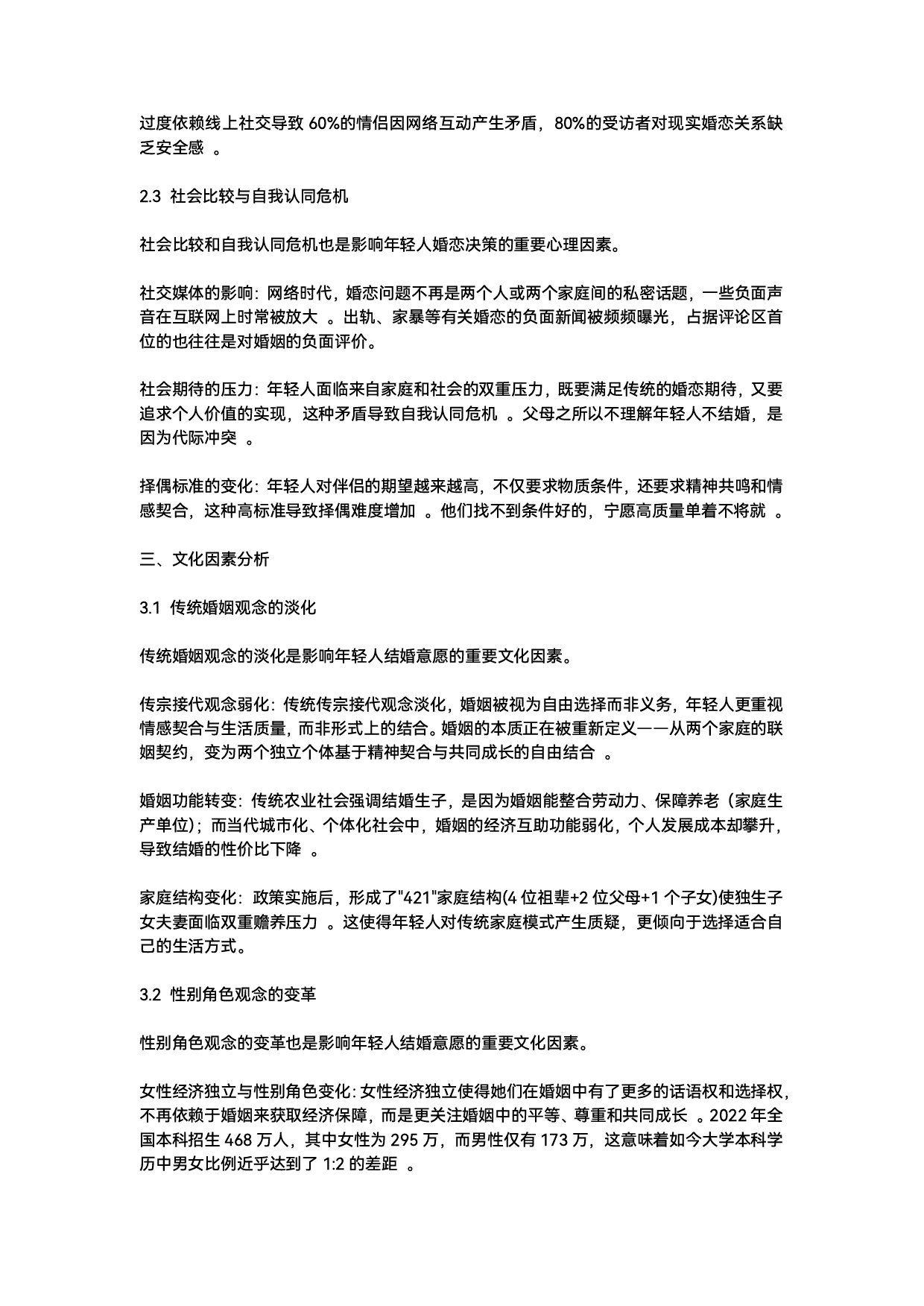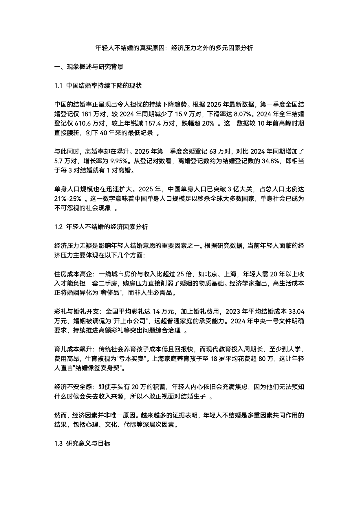 年轻人不结婚的真实原因经济压力之外的多元因素分析一现象概述与研究背景1.1中国结婚率持续下降的现状中国的结婚率正呈现出令人担忧的持续下降趋势根据2025年最新数据第一季度全国结婚登记仅181万对较2024年同期减少了15.9万对下滑率达8.07%2024年全年结婚登记仅610.6万对较上年锐减157.4万对跌幅超20%这一数据较10年前高峰时期直接腰斩创下40年来的最低纪录与此同时离婚率却在攀升2025年第一季度离婚登记63万对对比2024年同期增加了5.7万对增长率为9.95%从登记对数看离婚登记数约为结婚登记数的34.8%即相当于每3对结婚就有1对离婚单身人口规模也在迅速扩大2025年中国单身人口已突破3亿大关占总人口比例达21%-25%这一数字意味着中国单身人口规模足以秒杀全球大多数国家单身社会已成为不可忽视的社会现象1.2年轻人...