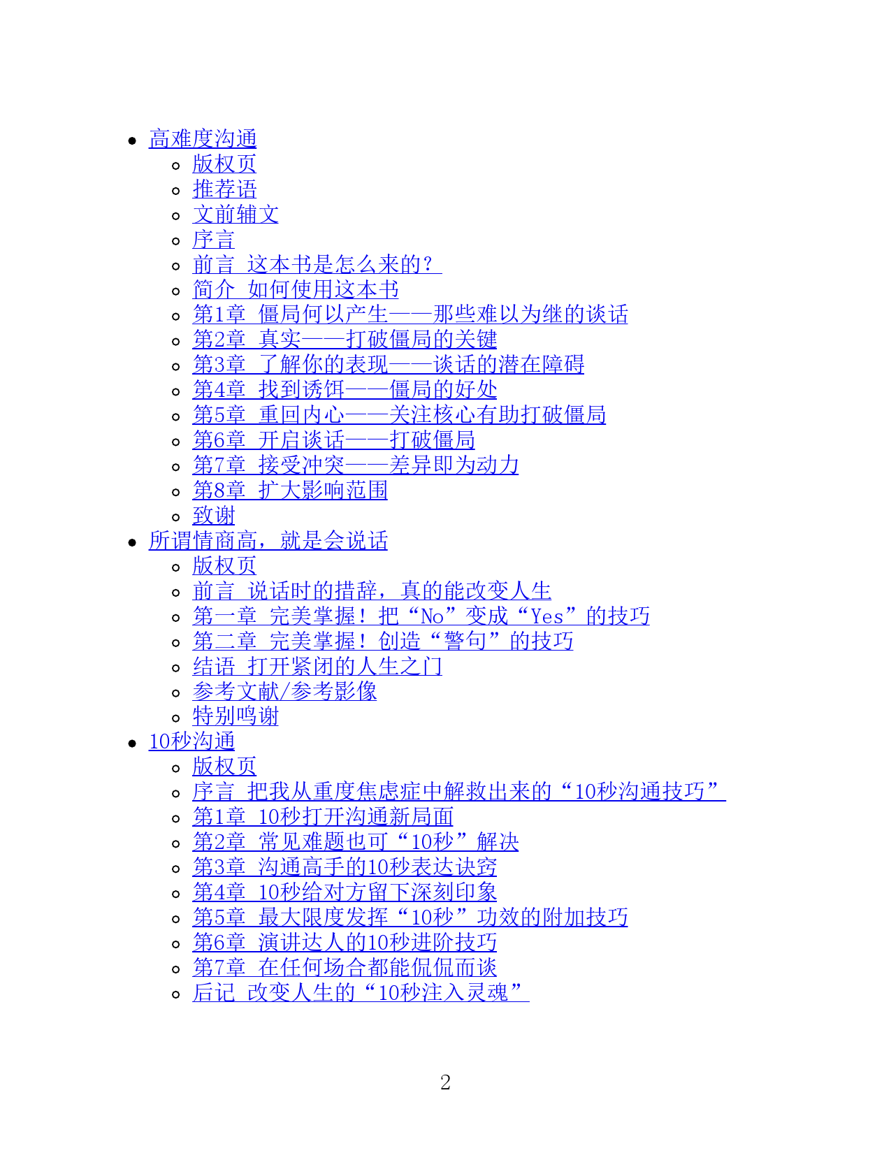 高难度沟通版权页推荐语文前辅文序言前言这本书是怎么来的?简介如何使用这本书第1章僵局何以产生——那些难以为继的谈话第2章真实——打破僵局的关键第3章了解你的表现——谈话的潜在障碍第4章找到诱饵——僵局的好处第5章重回内心——关注核心有助打破僵局第6章开启谈话——打破僵局第7章接受冲突——差异即为动力第8章扩大影响范围致谢所谓情商高,就是会说话版权页前言说话时的措辞,真的能改变人生第一章完美掌握!把“No”变成“Yes”的技巧第二章完美掌握!创造“警句”的技巧结语打开紧闭的人生之门参考文献/参考影像特别鸣谢10秒沟通版权页序言把我从重度焦虑症中解救出来的“10秒沟通技巧”第1章10秒打开沟通新局面第2章常见难题也可“10秒”解决第3章沟通高手的10秒表达诀窍第4章10秒给对方留下深刻印...