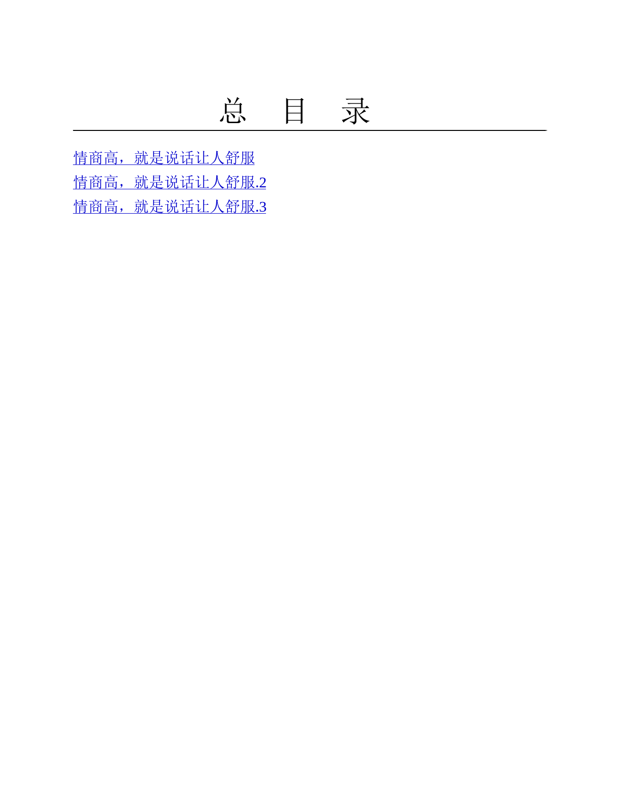 总目录情商高,就是说话让人舒服情商高,就是说话让人舒服.2情商高,就是说话让人舒服.3图书在版编目(CIP)数据情商高,就是说话让人舒服/朱凌,常清著.—延吉:延边大学出版社,2016.9ISBN978-7-5688-1248-1Ⅰ.①情…Ⅱ.①朱…②常…Ⅲ.①口才学—通俗读物Ⅳ.①H019-49中国版本图书馆CIP数据核字(2016)第232027号情商高,就是说话让人舒服作者:朱凌常清责任编辑:于衍来封面设计:仙境出版发行:延边大学出版社社址:吉林省延吉市公园路977号邮编:133002网址:http://www.ydcbs.comE-mail:ydcbs@ydcbs.com电话:0433-2732435传真:0433-2732434发行部电话:0433-2732442传真:0433-2733056印刷:北京嘉业印刷厂开本:170×240毫米1/16印张:14.5字数:220千字印数:2000册版次:2016年10月第1版印次...
