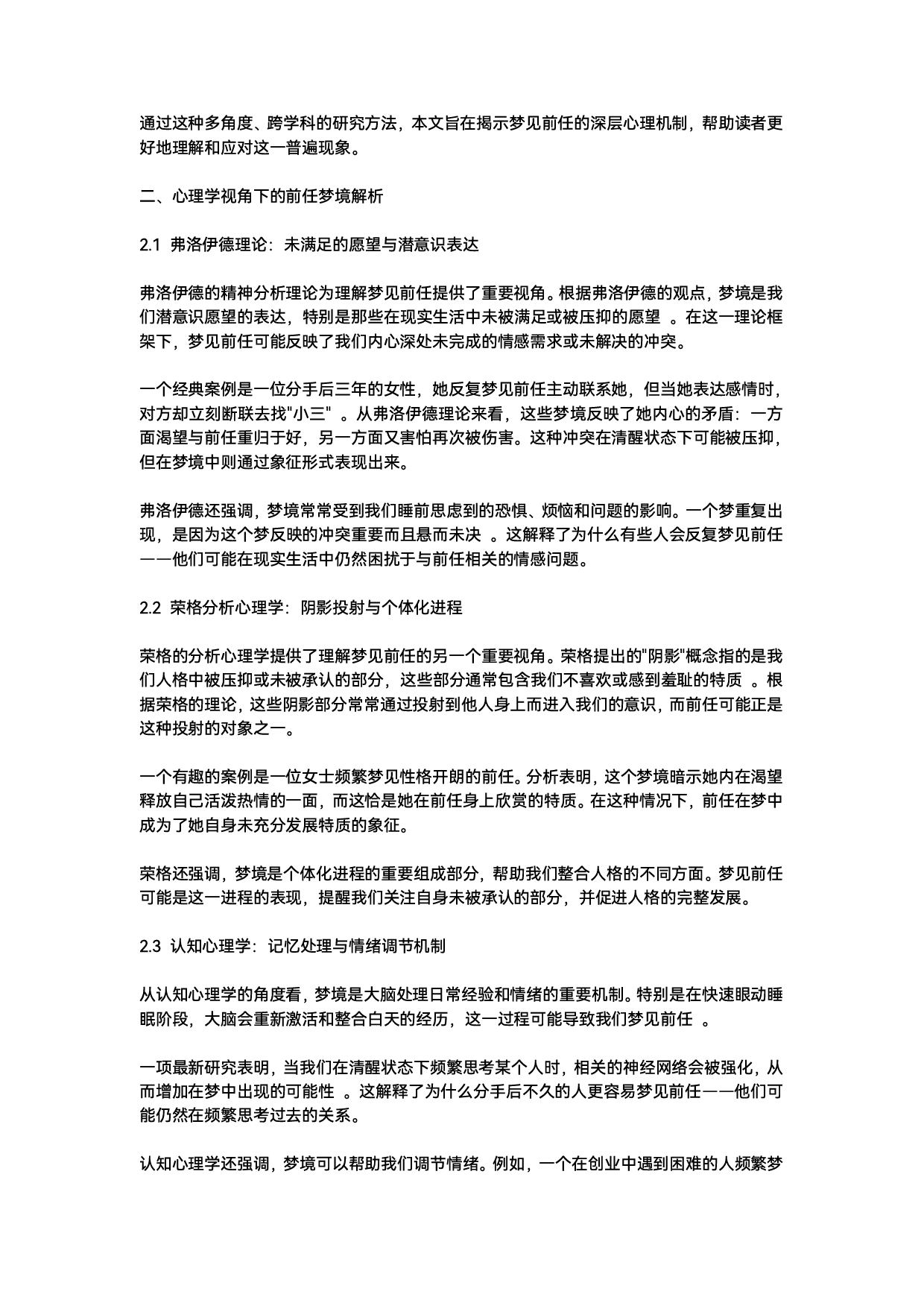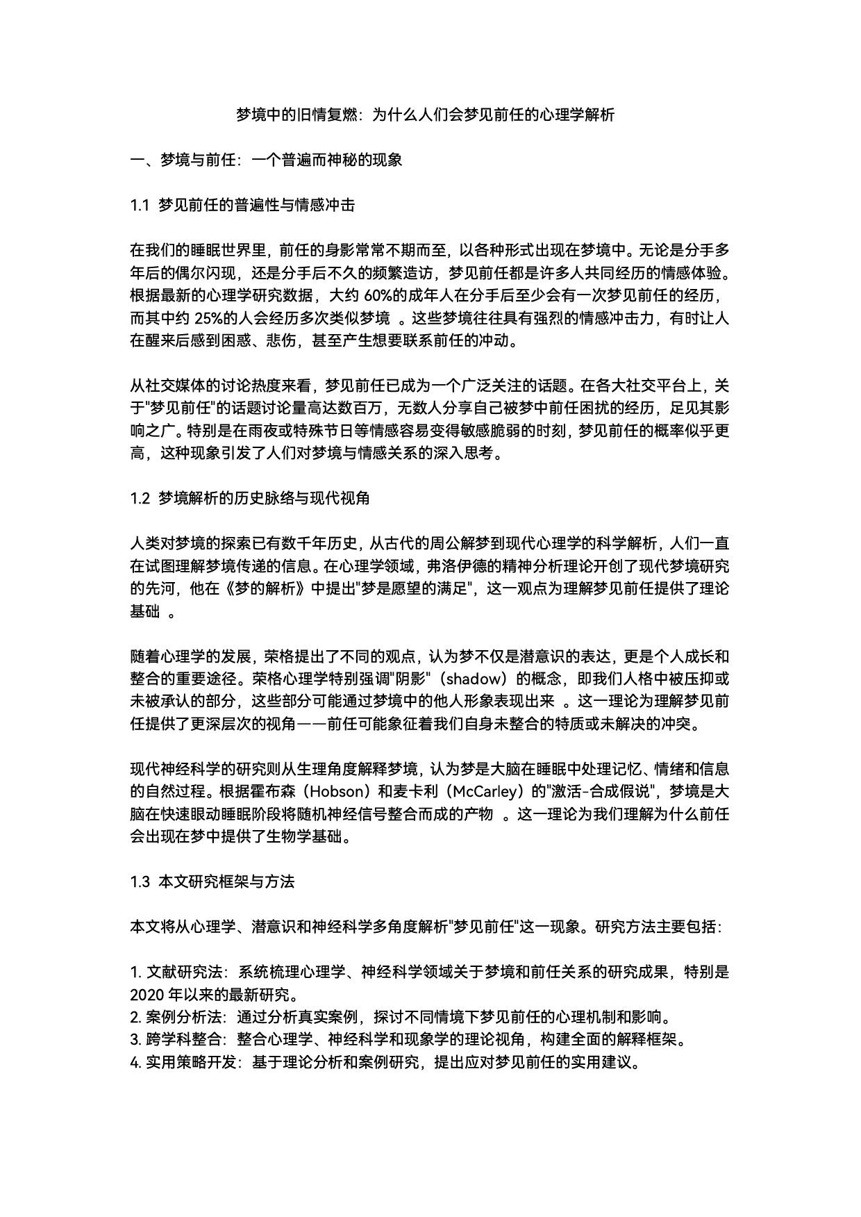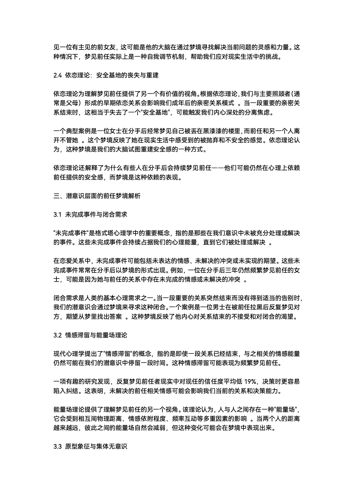 梦境中的旧情复燃为什么人们会梦见前任的心理学解析一梦境与前任一个普遍而神秘的现象1.1梦见前任的普遍性与情感冲击在我们的睡眠世界里前任的身影常常不期而至以各种形式出现在梦境中无论是分手多年后的偶尔闪现还是分手后不久的频繁造访梦见前任都是许多人共同经历的情感体验根据最新的心理学研究数据大约60%的成年人在分手后至少会有一次梦见前任的经历而其中约25%的人会经历多次类似梦境这些梦境往往具有强烈的情感冲击力有时让人在醒来后感到困惑悲伤甚至产生想要联系前任的冲动从社交媒体的讨论热度来看梦见前任已成为一个广泛关注的话题在各大社交平台上关于"梦见前任"的话题讨论量高达数百万无数人分享自己被梦中前任困扰的经历足见其影响之广特别是在雨夜或特殊节日等情感容易变得敏感脆弱的时刻梦见前任...