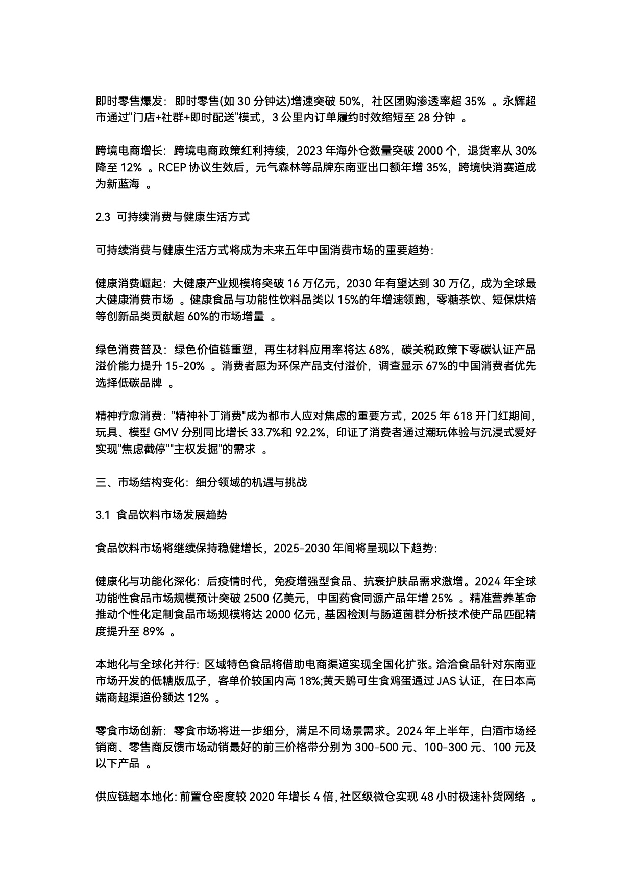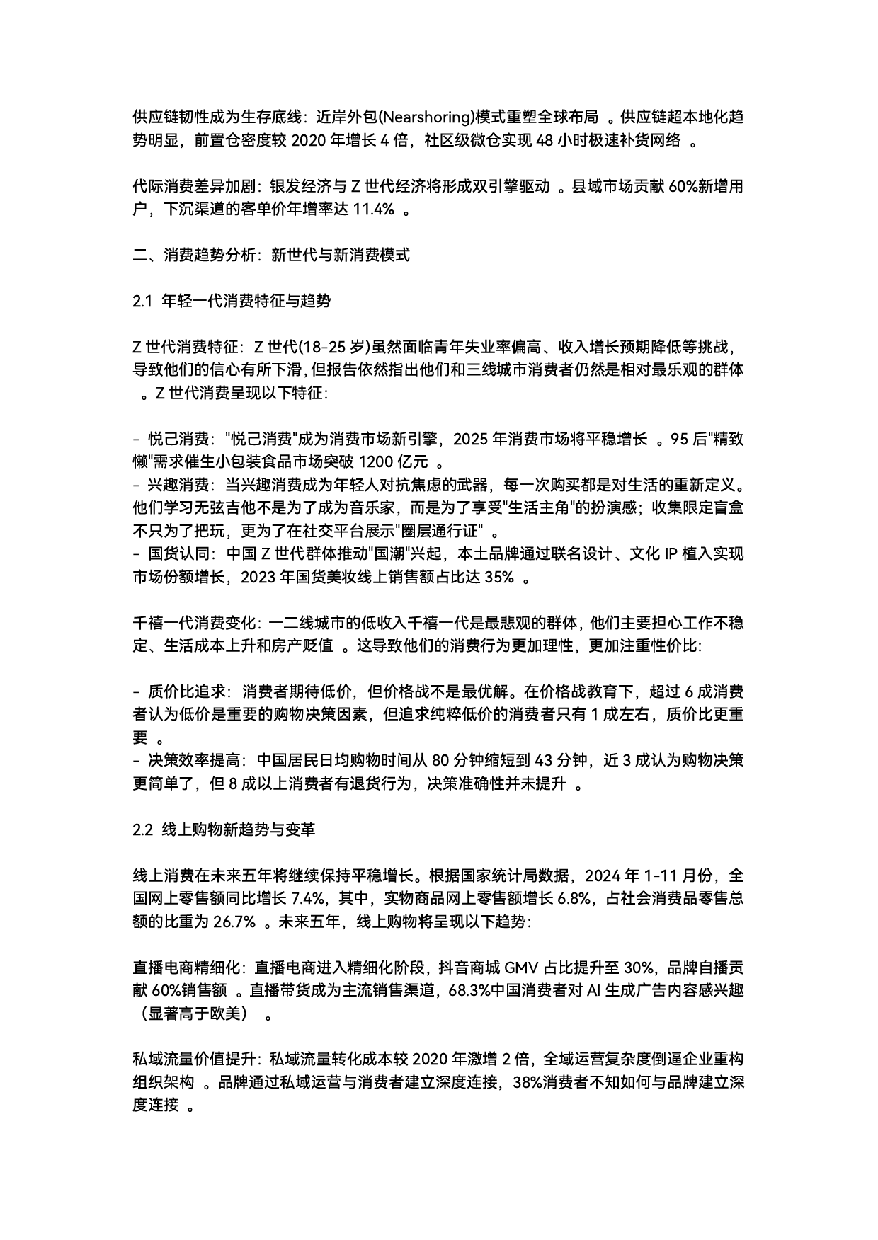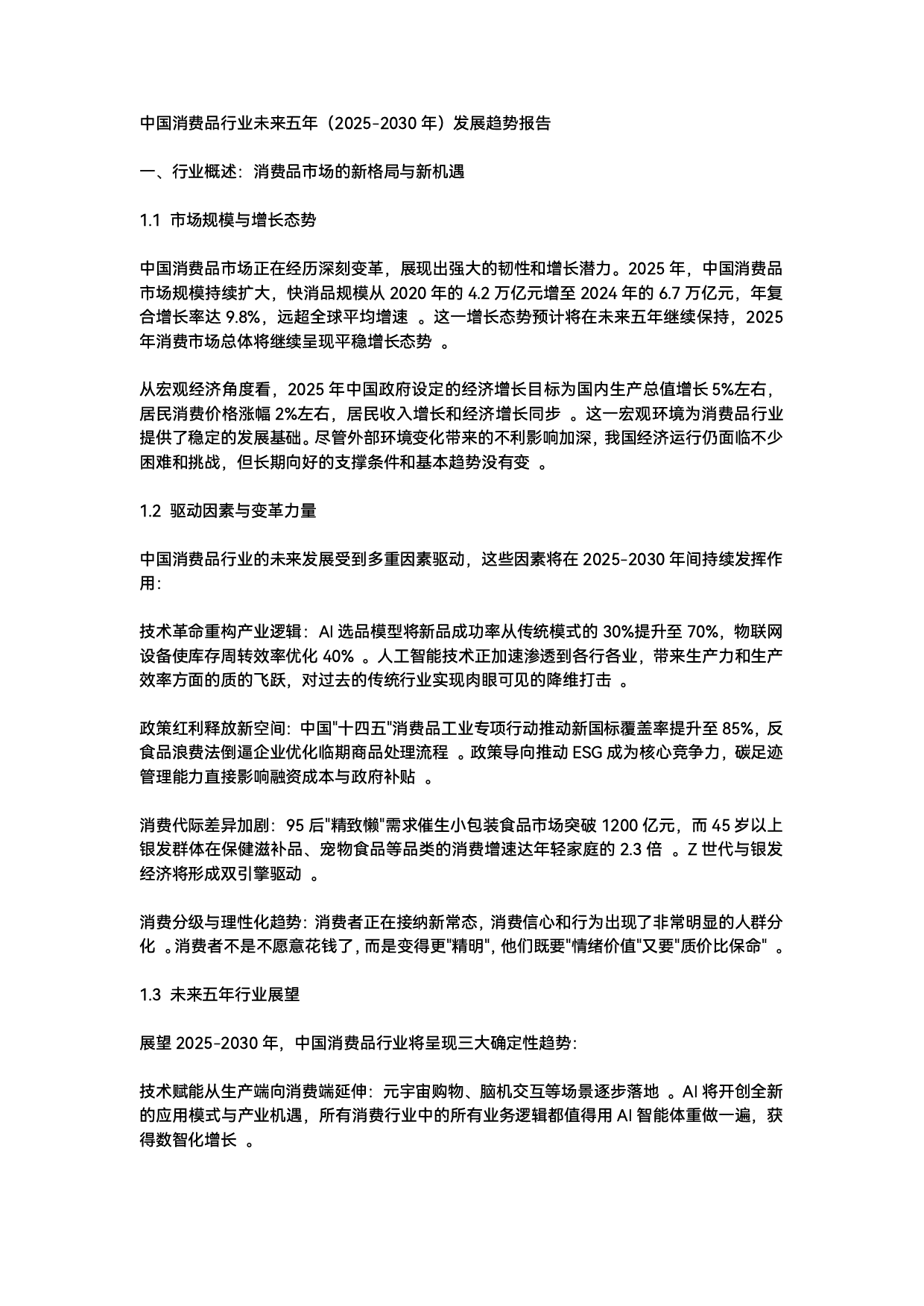中国消费品行业未来五年2025-2030年发展趋势报告一行业概述消费品市场的新格局与新机遇1.1市场规模与增长态势中国消费品市场正在经历深刻变革展现出强大的韧性和增长潜力2025年中国消费品市场规模持续扩大快消品规模从2020年的4.2万亿元增至2024年的6.7万亿元年复合增长率达9.8%远超全球平均增速这一增长态势预计将在未来五年继续保持2025年消费市场总体将继续呈现平稳增长态势从宏观经济角度看2025年中国政府设定的经济增长目标为国内生产总值增长5%左右居民消费价格涨幅2%左右居民收入增长和经济增长同步这一宏观环境为消费品行业提供了稳定的发展基础尽管外部环境变化带来的不利影响加深我国经济运行仍面临不少困难和挑战但长期向好的支撑条件和基本趋势没有变1.2驱动因素与变革力量中国消费品行业的未来发展受...