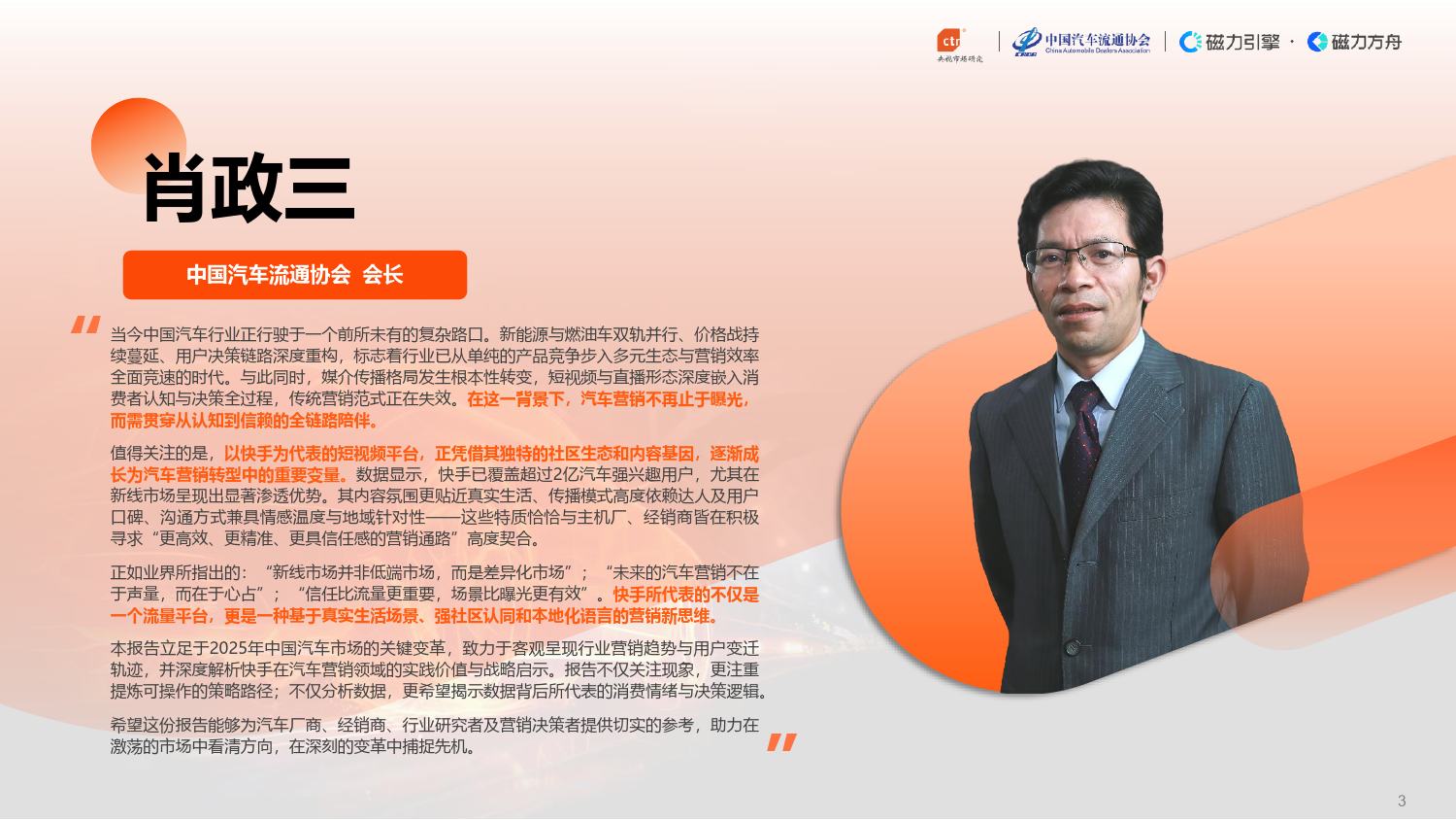快意驰骋驶向汽车营销新未来2025年快手汽车行业报告CONTENTS序言大咖说目录01新线市场成增长核心,社媒达人重塑营销格局02坐拥新线市场与亿级汽车强兴趣用户,快手成车企营销增量场03多元达人与丰富内容生态,释放品效协同增长新势能04经典款燃油车及新能源小型车是快手的优势区间肖政三“中国汽车流通协会会长“当今中国汽车行业正行驶于一个前所未有的复杂路口。新能源与燃油车双轨并行、价格战持续蔓延、用户决策链路深度重构,标志着行业已从单纯的产品竞争步入多元生态与营销效率全面竞速的时代。与此同时,媒介传播格局发生根本性转变,短视频与直播形态深度嵌入消费者认知与决策全过程,传统营销范式正在失效。在这一背景下,汽车营销不再止于曝光,而需贯穿从认知到信赖的全链路陪伴。值得关注的是,以快...