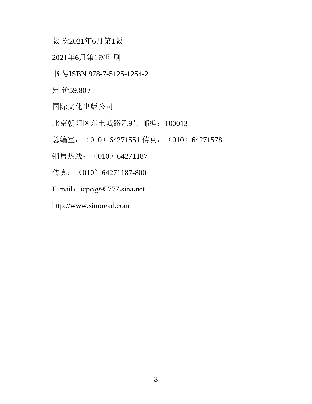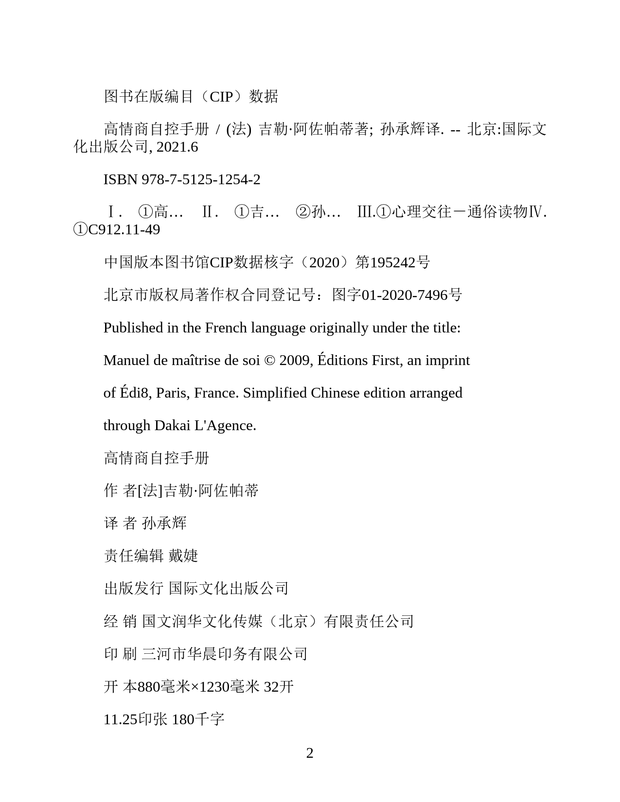 图书在版编目(CIP)数据高情商自控手册/(法)吉勒·阿佐帕蒂著;孙承辉译.--北京:国际文化出版公司,2021.6ISBN978-7-5125-1254-2Ⅰ.①高…Ⅱ.①吉…②孙…Ⅲ.①心理交往-通俗读物Ⅳ.①C912.11-49中国版本图书馆CIP数据核字(2020)第195242号北京市版权局著作权合同登记号:图字01-2020-7496号PublishedintheFrenchlanguageoriginallyunderthetitle:Manueldemaîtrisedesoi©2009,ÉditionsFirst,animprintofÉdi8,Paris,France.SimplifiedChineseeditionarrangedthroughDakaiL'Agence.高情商自控手册作者[法]吉勒·阿佐帕蒂译者孙承辉责任编辑戴婕出版发行国际文化出版公司经销国文润华文化传媒(北京)有限责任公司印刷三河市华晨印务有限公司开本880毫米×1230毫米32开11.25印张180千字2版次2021年6月第1版2021...