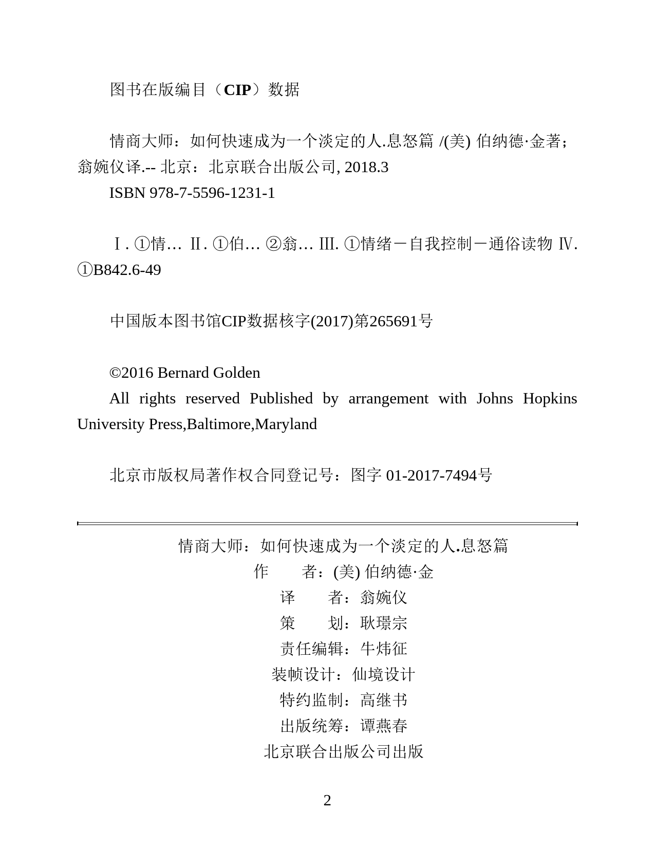 图书在版编目(CIP)数据情商大师:如何快速成为一个淡定的人.息怒篇/(美)伯纳德·金著;翁婉仪译.--北京:北京联合出版公司,2018.3ISBN978-7-5596-1231-1Ⅰ.①情…Ⅱ.①伯…②翁…Ⅲ.①情绪-自我控制-通俗读物Ⅳ.①B842.6-49中国版本图书馆CIP数据核字(2017)第265691号©2016BernardGoldenAllrightsreservedPublishedbyarrangementwithJohnsHopkinsUniversityPress,Baltimore,Maryland北京市版权局著作权合同登记号:图字01-2017-7494号情商大师:如何快速成为一个淡定的人.息怒篇作者:(美)伯纳德·金译者:翁婉仪策划:耿璟宗责任编辑:牛炜征装帧设计:仙境设计特约监制:高继书出版统筹:谭燕春北京联合出版公司出版2(北京市西城区德外大街83号楼9层100088)北京联合天畅发行公司发行北京美图印务有限公司...