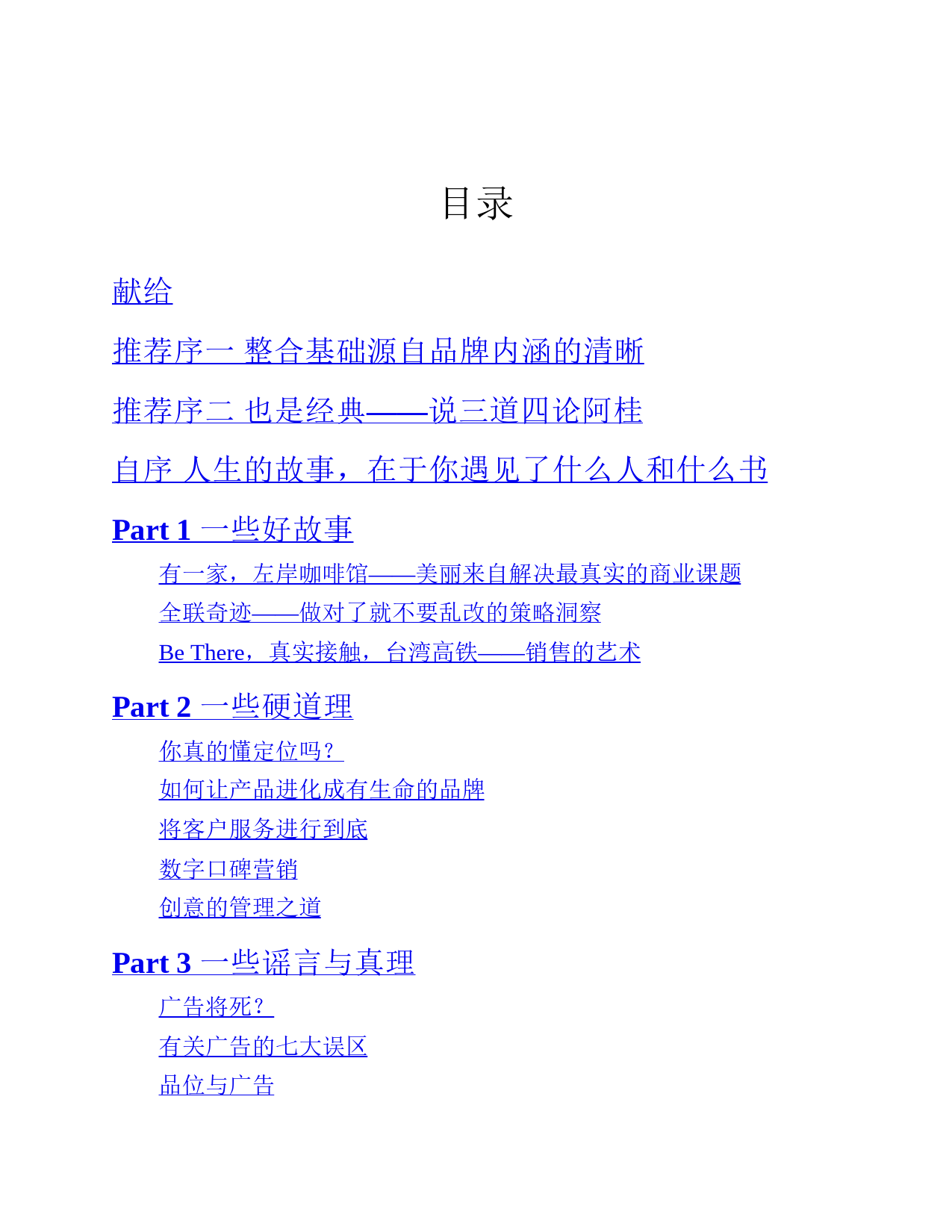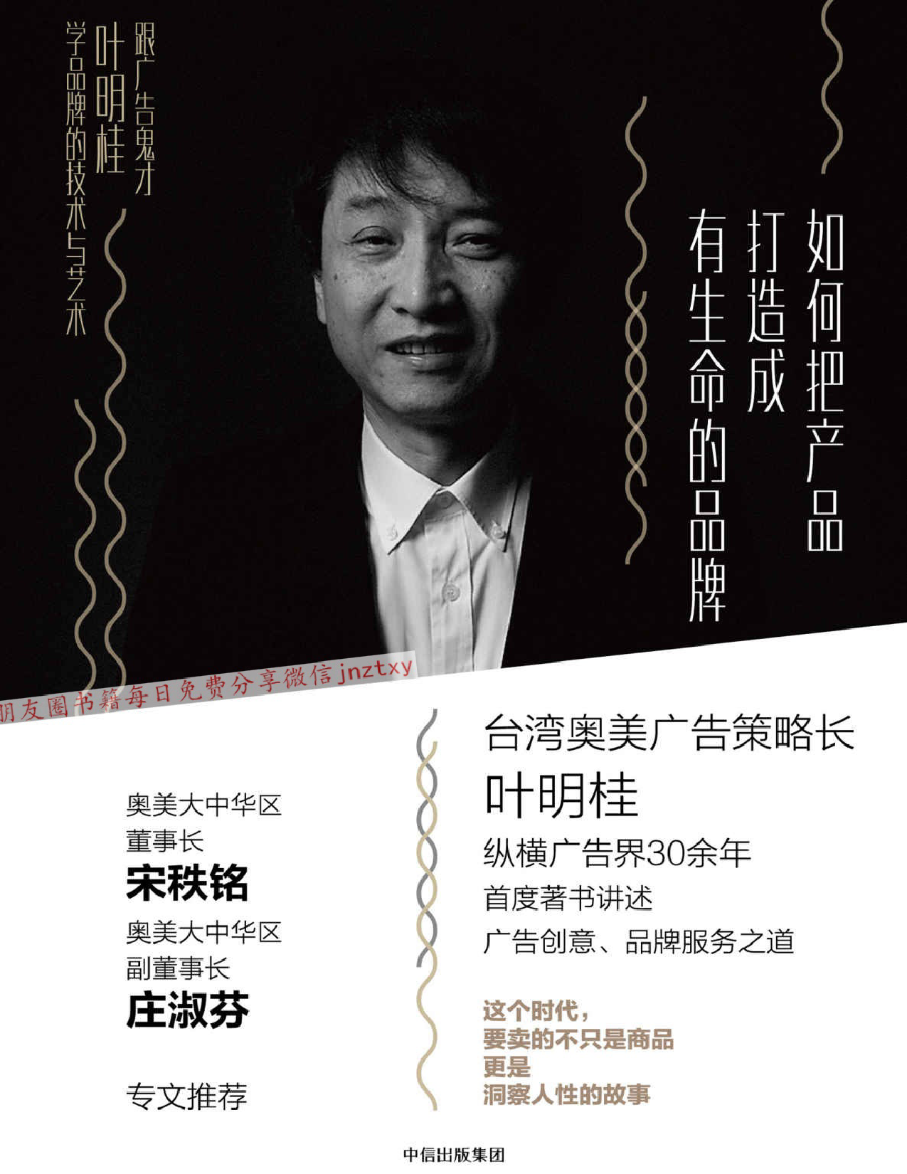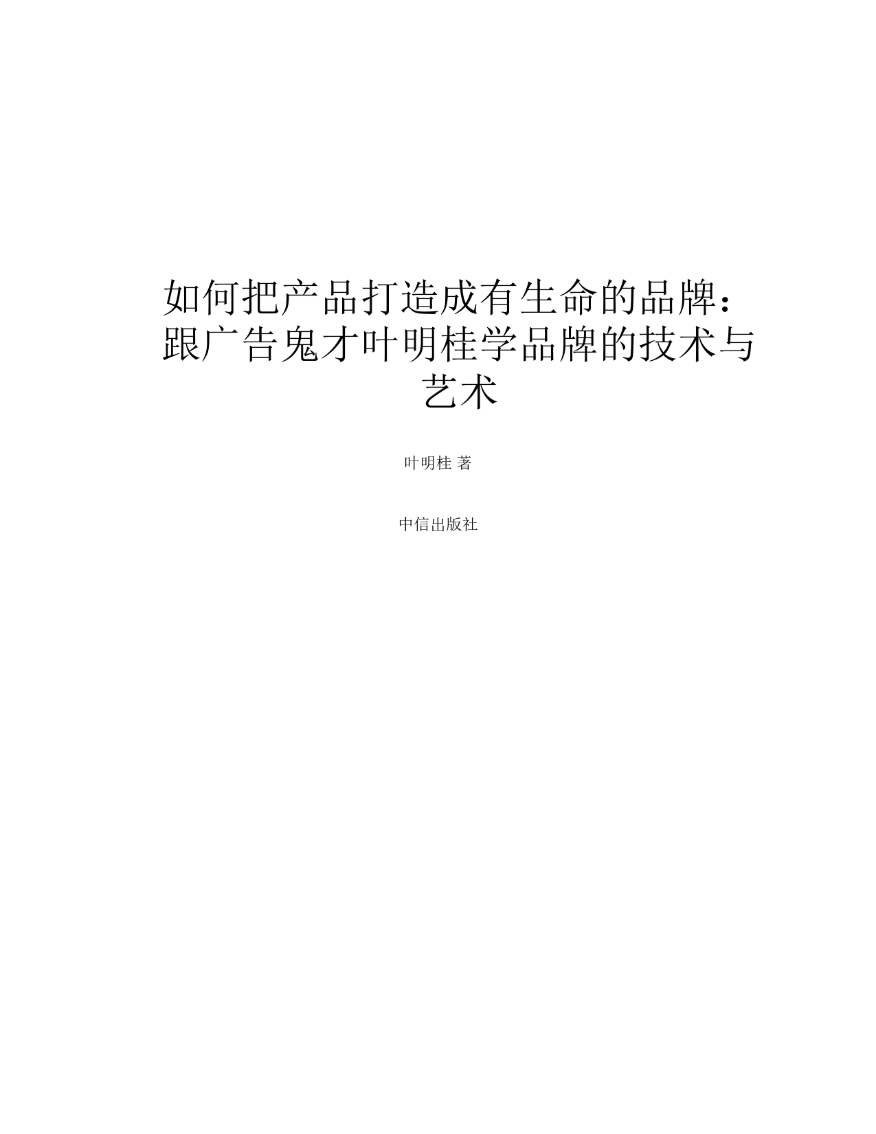 如何把产品打造成有生命的品牌:跟广告鬼才叶明桂学品牌的技术与艺术叶明桂著中信出版社目录献给推荐序一整合基础源自品牌内涵的清晰推荐序二也是经典——说三道四论阿桂自序人生的故事,在于你遇见了什么人和什么书Part1一些好故事有一家,左岸咖啡馆——美丽来自解决最真实的商业课题全联奇迹——做对了就不要乱改的策略洞察BeThere,真实接触,台湾高铁——销售的艺术Part2一些硬道理你真的懂定位吗?如何让产品进化成有生命的品牌将客户服务进行到底数字口碑营销创意的管理之道Part3一些谣言与真理广告将死?有关广告的七大误区品位与广告明星代言Part4一些工作既快乐又成功如何开会商业写作的要素如何在工作上既快乐又成功Part5一些领导之道广告的纪律我会提拔什么样的人为什么人才留不住生存之道附录如何做...