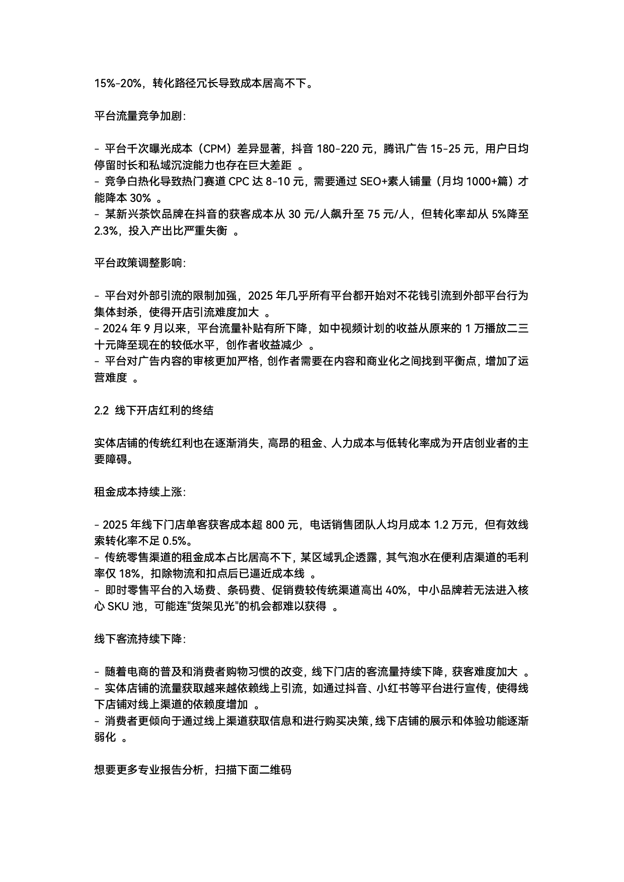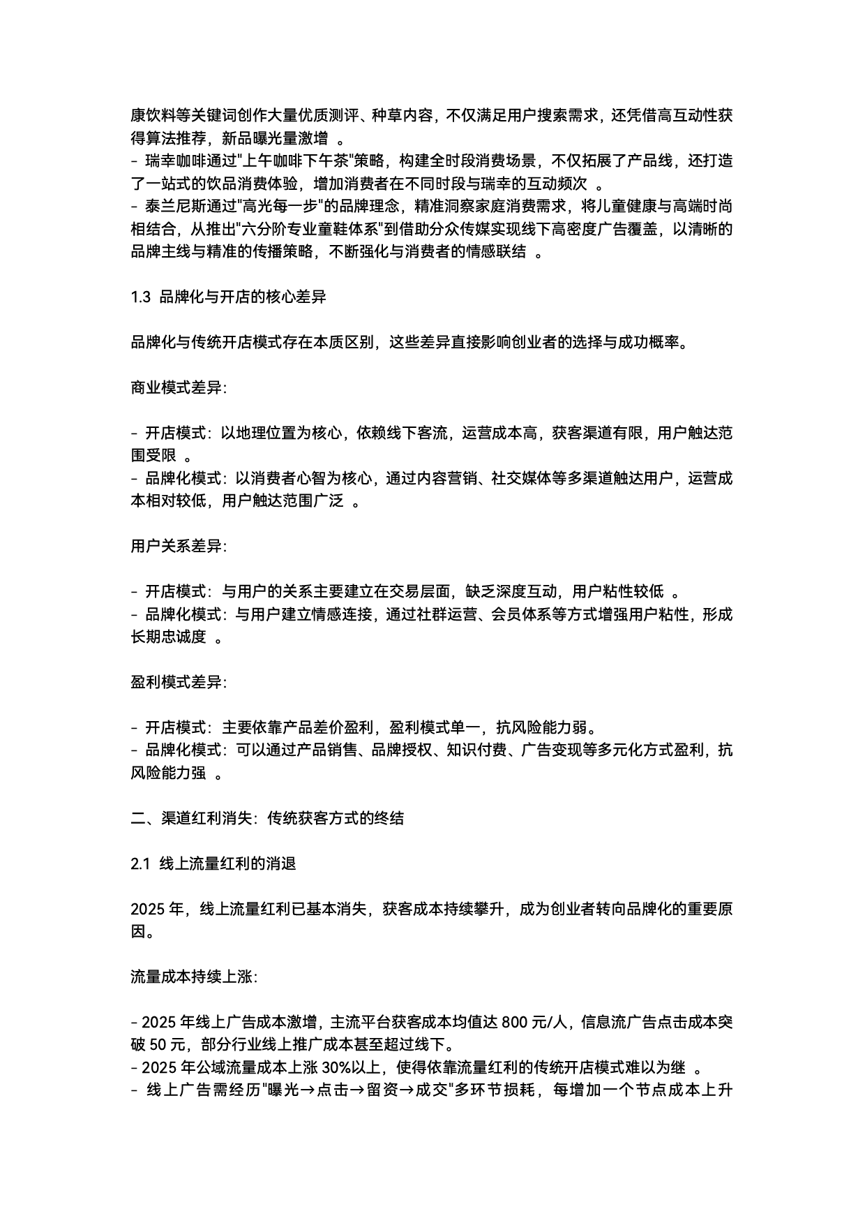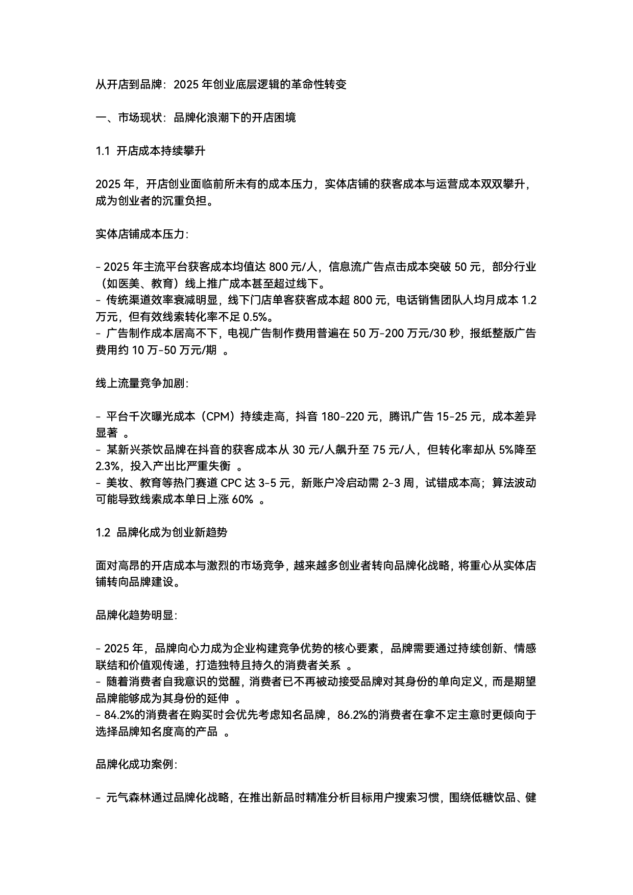从开店到品牌2025年创业底层逻辑的革命性转变一市场现状品牌化浪潮下的开店困境1.1开店成本持续攀升2025年开店创业面临前所未有的成本压力实体店铺的获客成本与运营成本双双攀升成为创业者的沉重负担实体店铺成本压力-2025年主流平台获客成本均值达800元/人信息流广告点击成本突破50元部分行业如医美教育线上推广成本甚至超过线下-传统渠道效率衰减明显线下门店单客获客成本超800元电话销售团队人均月成本1.2万元但有效线索转化率不足0.5%-广告制作成本居高不下电视广告制作费用普遍在50万-200万元/30秒报纸整版广告费用约10万-50万元/期线上流量竞争加剧-平台千次曝光成本CPM持续走高抖音180-220元腾讯广告15-25元成本差异显著-某新兴茶饮品牌在抖音的获客成本从30元/人飙升至75元/人但转化率却从5%降至2.3%投入...
