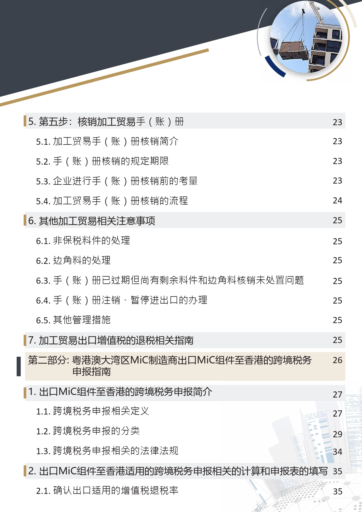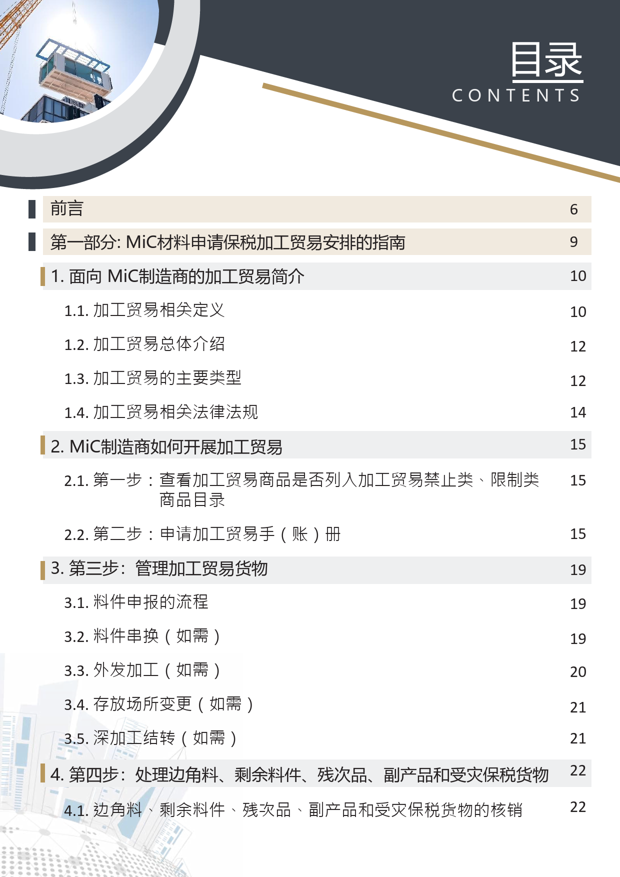 粤港「组装合成」模块化建筑跨境贸易指南咨询单位2025年6月广东省住房和城乡建设厅海关总署广东分署国家税务总局广东省税务局目录CONTENTS前言6第一部分:MiC材料申请保税加工贸易安排的指南91.面向MiC制造商的加工贸易简介101.1.加工贸易相关定义101.2.加工贸易总体介绍121.3.加工贸易的主要类型121.4.加工贸易相关法律法规142.MiC制造商如何开展加工贸易152.1.第一步:查看加工贸易商品是否列入加工贸易禁止类、限制类15第一步:商品目录2.2.第二步:申请加工贸易手(账)册153.第三步:管理加工贸易货物193.1.料件申报的流程193.2.料件串换(如需)193.3.外发加工(如需)203.4.存放场所变更(如需)213.5.深加工结转(如需)214.第四步:处理边角料、剩余料件、残次品、副产品和受灾保税货物224.1.边角料、剩余...
