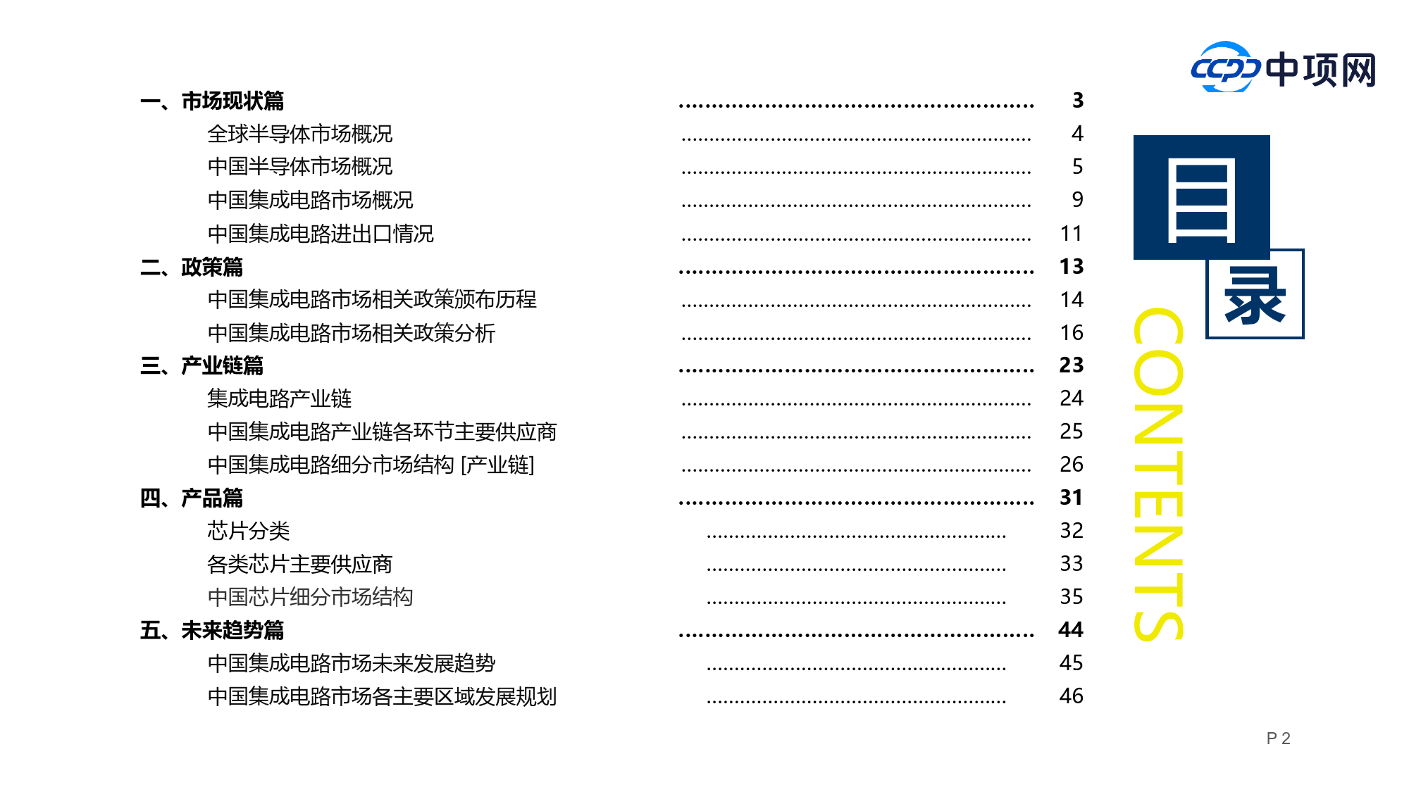 2024年中国集成电路市场简析时间:2025年8月一、市场现状篇………………………………………………3全球半导体市场概况中国半导体市场概况………………………………………………………4中国集成电路市场概况中国集成电路进出口情况………………………………………………………5目二、政策篇………………………………………………………9录中国集成电路市场相关政策颁布历程中国集成电路市场相关政策分析………………………………………………………11P2三、产业链篇………………………………………………13集成电路产业链中国集成电路产业链各环节主要供应商………………………………………………………14CONTENTS中国集成电路细分市场结构[产业链]………………………………………………………16四、产品篇芯片分类...