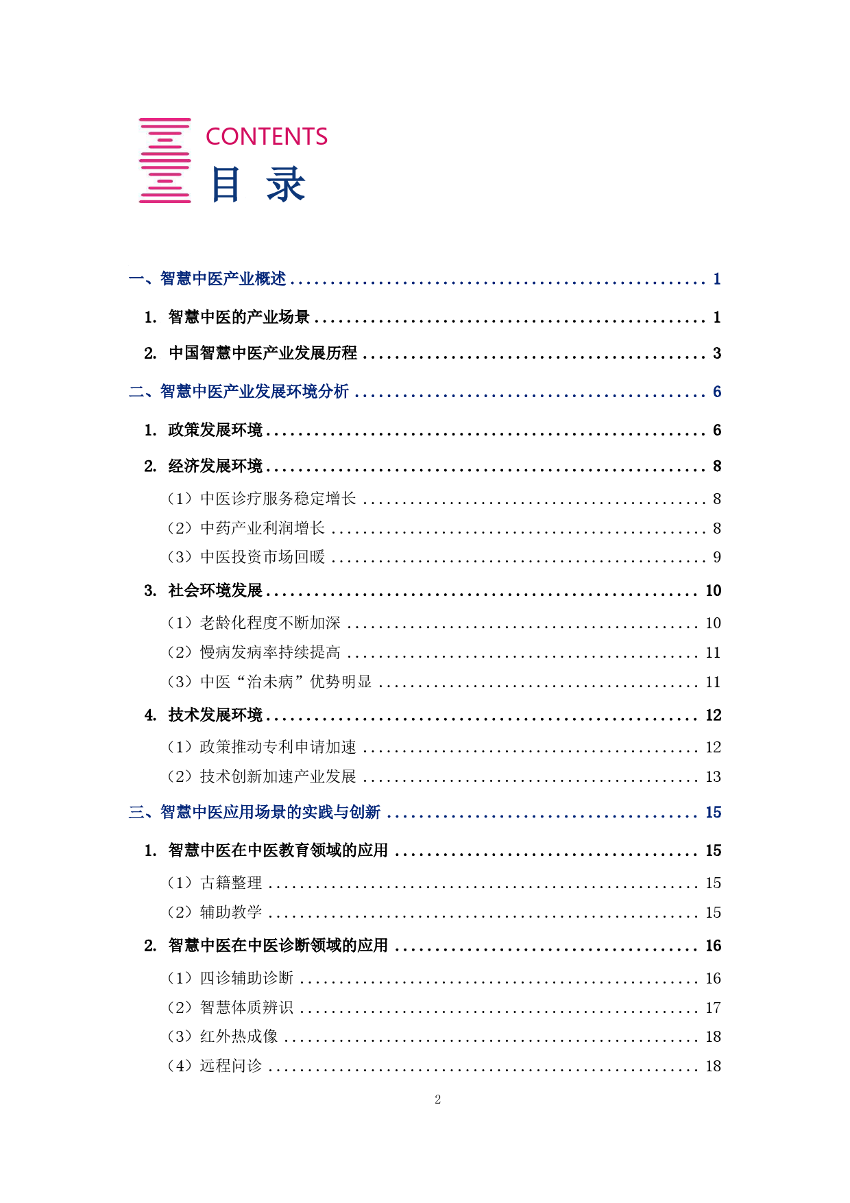 1CONTENTS目录一、智慧中医产业概述....................................................11.智慧中医的产业场景.................................................12.中国智慧中医产业发展历程...........................................3二、智慧中医产业发展环境分析............................................61.政策发展环境.......................................................62.经济发展环境.......................................................8(1)中医诊疗服务稳定增长............................................8(2)中药产业利润增长................................................8(3)中医投资市场回暖................................................93.社会环境发展...