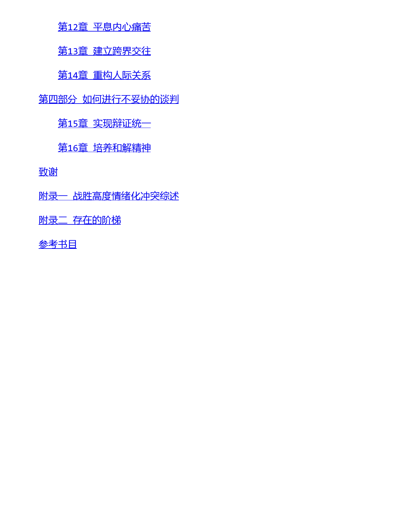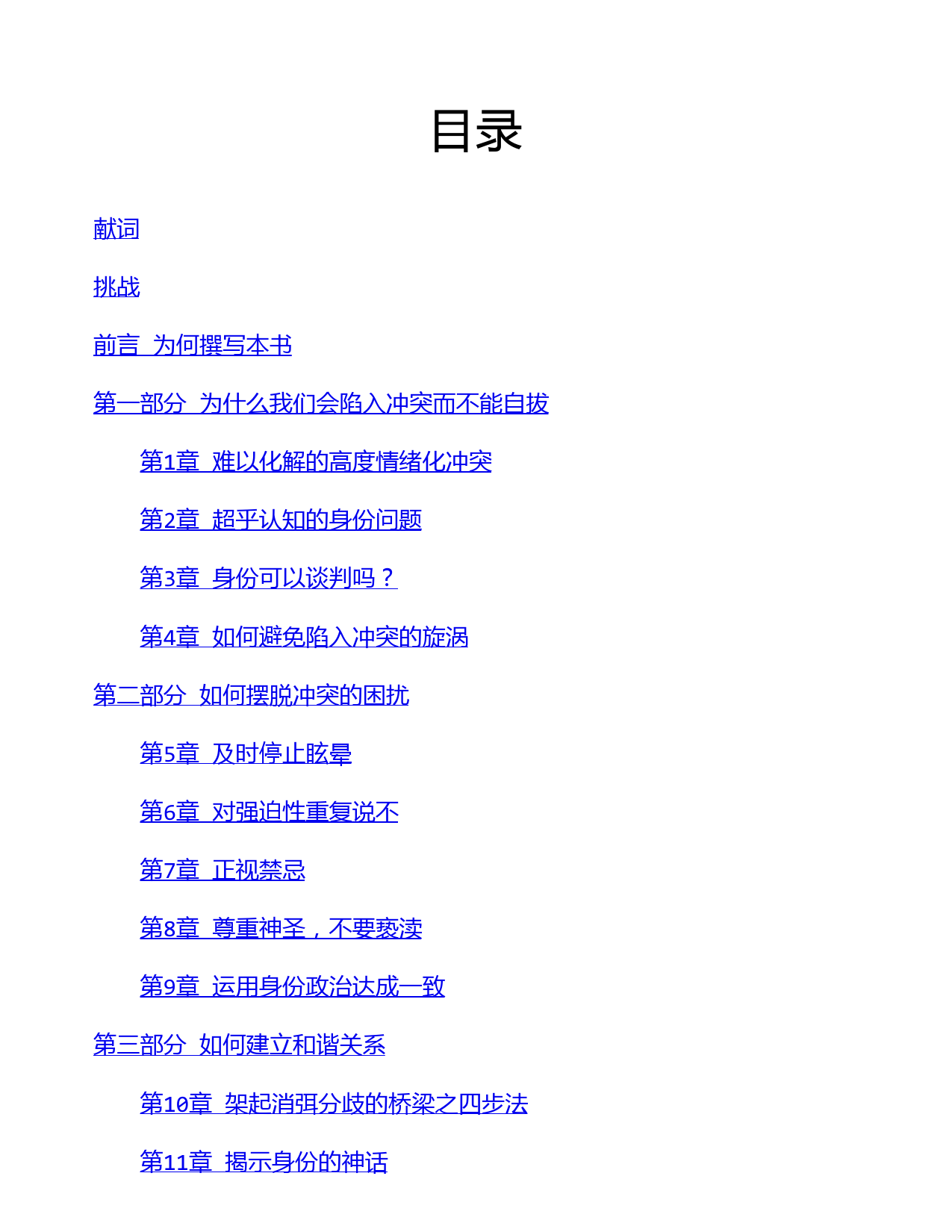 目录献词挑战前言为何撰写本书第一部分为什么我们会陷入冲突而不能自拔第1章难以化解的高度情绪化冲突第2章超乎认知的身份问题第3章身份可以谈判吗?第4章如何避免陷入冲突的旋涡第二部分如何摆脱冲突的困扰第5章及时停止眩晕第6章对强迫性重复说不第7章正视禁忌第8章尊重神圣,不要亵渎第9章运用身份政治达成一致第三部分如何建立和谐关系第10章架起消弭分歧的桥梁之四步法第11章揭示身份的神话第12章平息内心痛苦第13章建立跨界交往第14章重构人际关系第四部分如何进行不妥协的谈判第15章实现辩证统一第16章培养和解精神致谢附录一战胜高度情绪化冲突综述附录二存在的阶梯参考书目献词送给米娅、诺厄、扎卡里、利亚姆、妈妈、爸爸、麦迪、迈克、史蒂夫、希拉、玛格丽特、贝齐、彼得和苏珊,感谢你们教会我生命之...