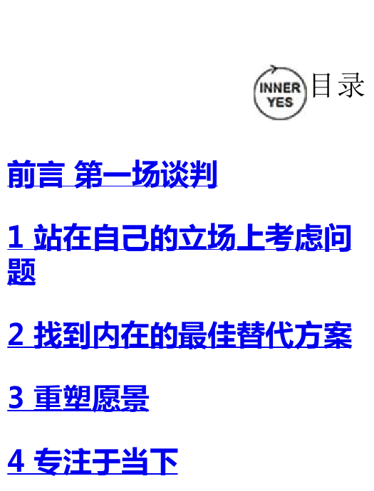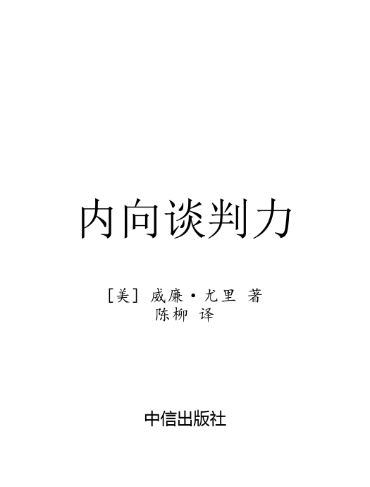 内向谈判力[美]威廉·尤里著陈柳译中信出版社目录前言第一场谈判1站在自己的立场上考虑问题2找到内在的最佳替代方案3重塑愿景4专注于当下5尊重对方6付出与收获结语三种胜利致谢前言第一场谈判要改变世界,先改变自己。——苏格拉底我们如何才能与他人达成一致?如何才能解决与同事及老板、配偶或伴侣、客户或顾客、孩子及家人,也就是与我们打交道的每个人自然产生的矛盾?我们怎样才能在得到自己真正想要的东西的同时,又能对生命中其他人的需求加以考虑?或许这是人类所面临的最常见、最具挑战性的困境。我的整个职业生涯都在处理这种困境。30多年前,我很荣幸地与我现已过世的导师和同事罗杰·费希尔(RogerFisher)合写了《谈判力》(GettingtoYes:NegotiatingAgreementWithoutGivingIn)一书。在这本书的帮助...