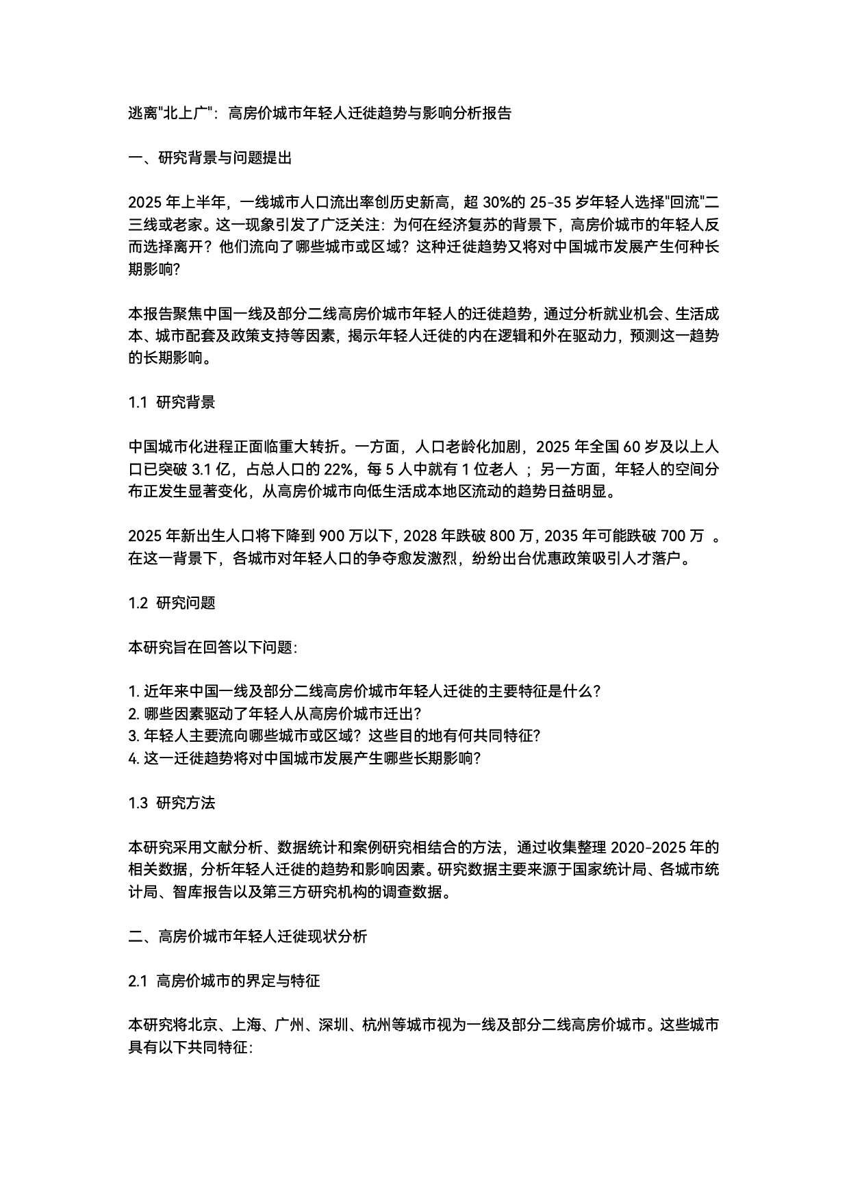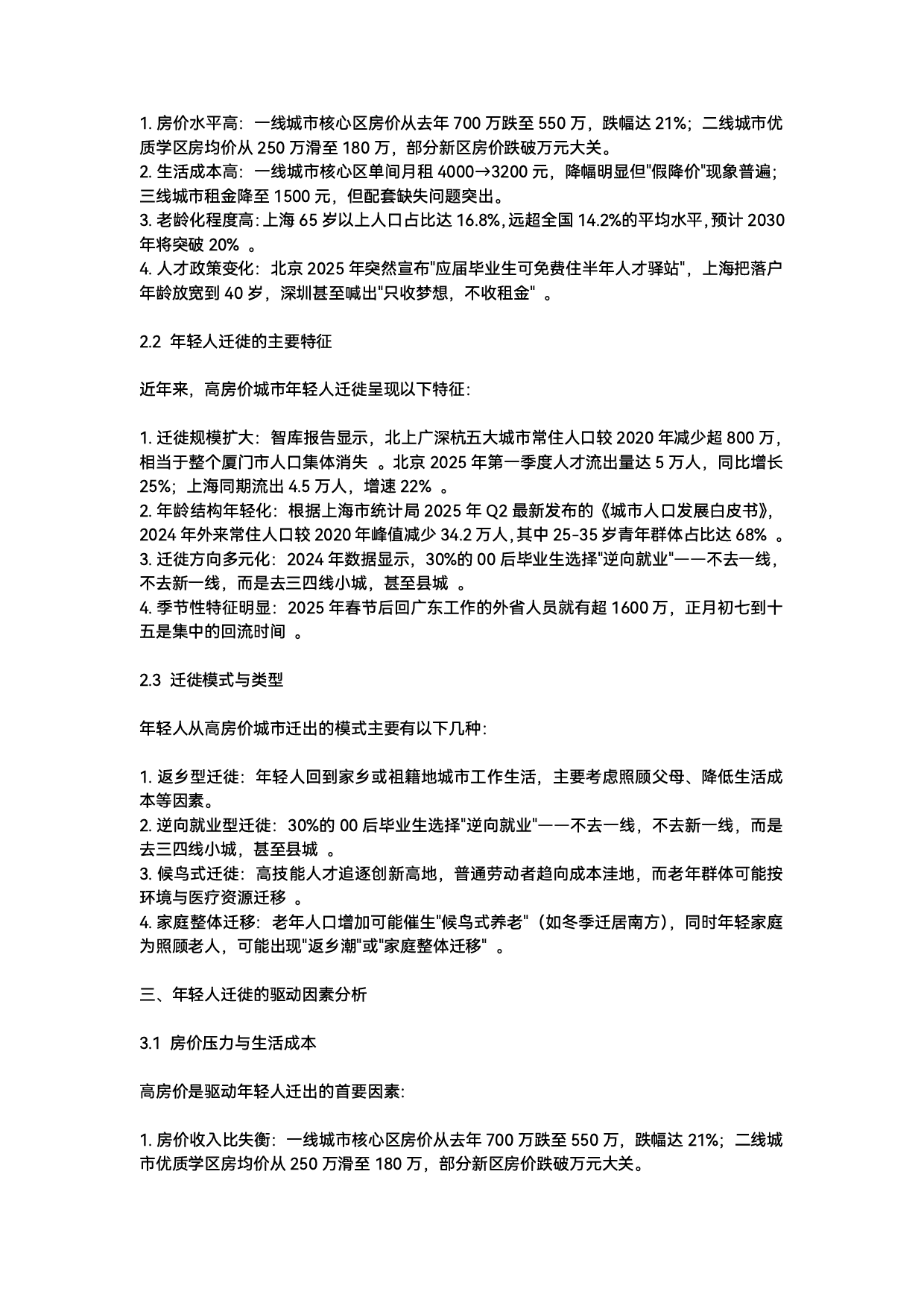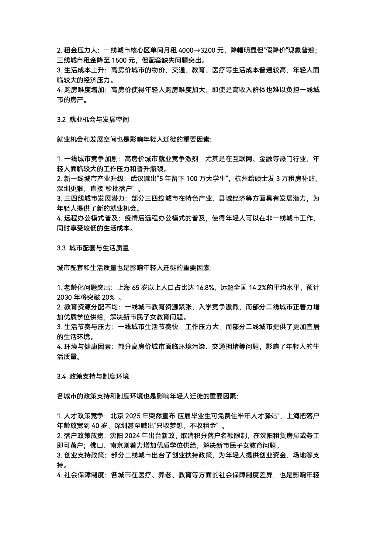 逃离"北上广"高房价城市年轻人迁徙趋势与影响分析报告一研究背景与问题提出2025年上半年一线城市人口流出率创历史新高超30%的25-35岁年轻人选择"回流"二三线或老家这一现象引发了广泛关注为何在经济复苏的背景下高房价城市的年轻人反而选择离开他们流向了哪些城市或区域这种迁徙趋势又将对中国城市发展产生何种长期影响本报告聚焦中国一线及部分二线高房价城市年轻人的迁徙趋势通过分析就业机会生活成本城市配套及政策支持等因素揭示年轻人迁徙的内在逻辑和外在驱动力预测这一趋势的长期影响1.1研究背景中国城市化进程正面临重大转折一方面人口老龄化加剧2025年全国60岁及以上人口已突破3.1亿占总人口的22%每5人中就有1位老人另一方面年轻人的空间分布正发生显著变化从高房价城市向低生活成本地区流动的趋势日益明...