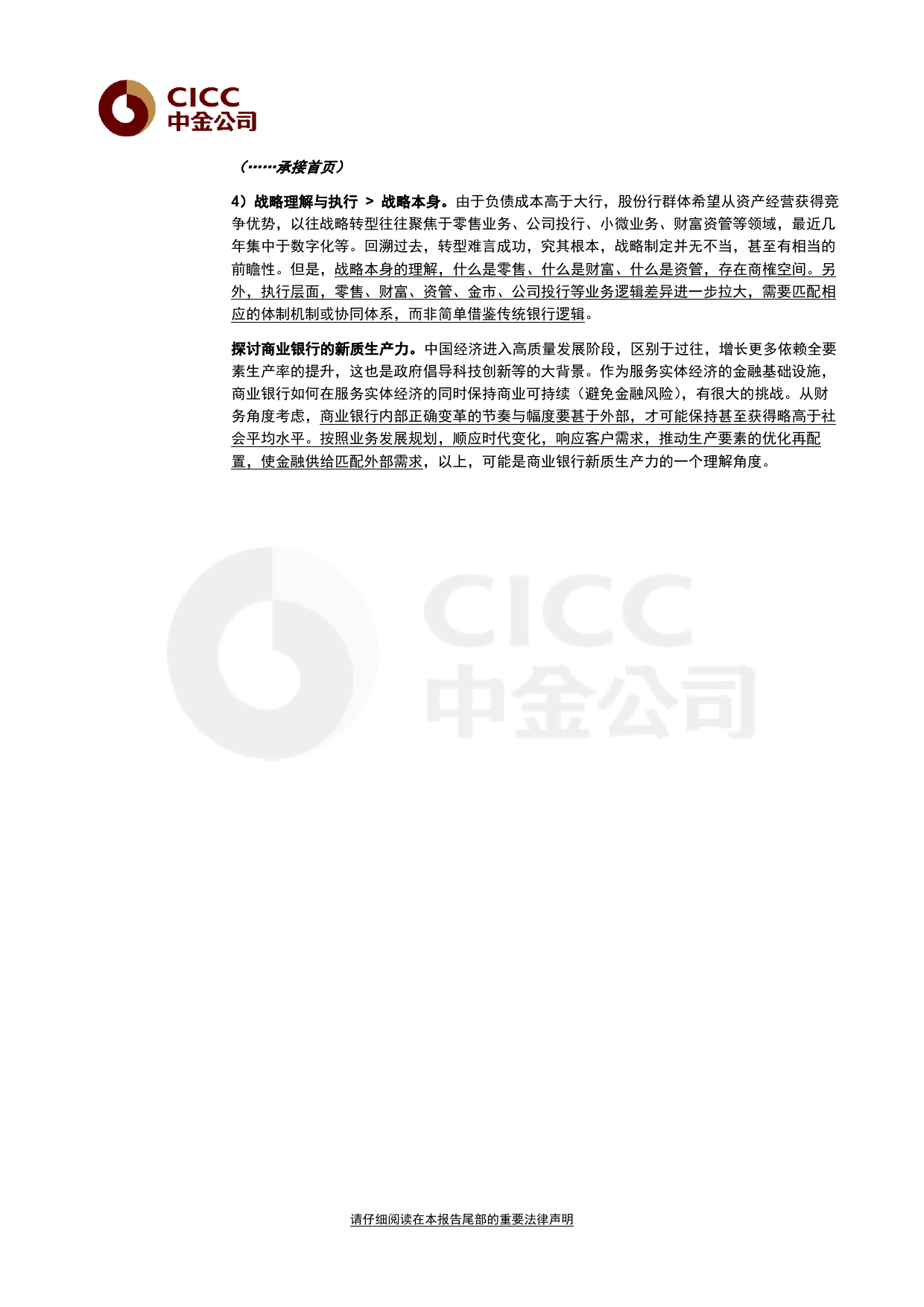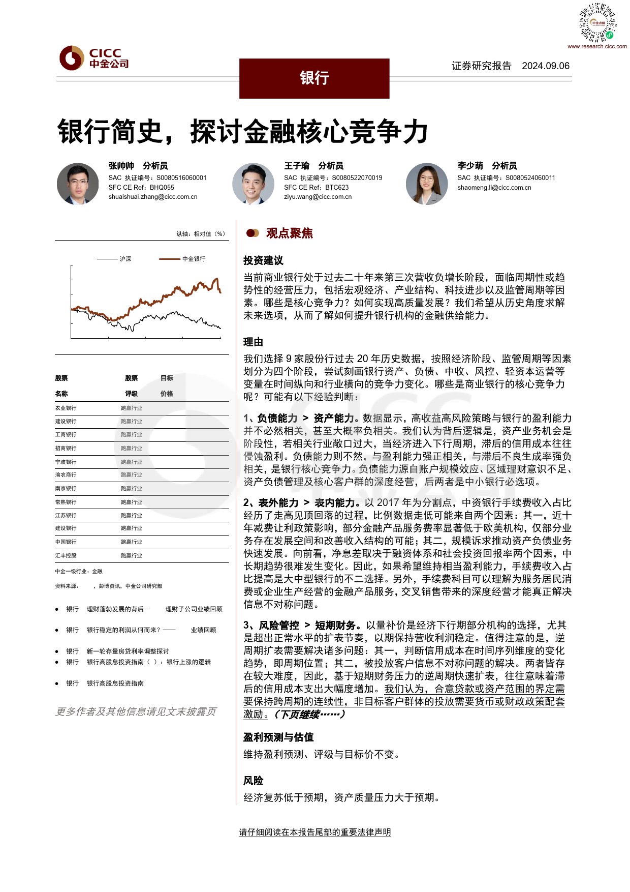 银行证券研究报告2024.09.06银行简史,探讨金融核心竞争力张帅帅分析员王子瑜分析员李少萌分析员SAC执证编号:S0080516060001SAC执证编号:S0080522070019SAC执证编号:S0080524060011SFCCERef:BHQ055SFCCERef:BTC623shaomeng.li@cicc.com.cnshuaishuai.zhang@cicc.com.cnziyu.wang@cicc.com.cn纵轴:相对值(%)观点聚焦沪深300中金银行投资建议1302023-122024-032024-062024-09当前商业银行处于过去二十年来第三次营收负增长阶段,面临周期性或趋120势性的经营压力,包括宏观经济、产业结构、科技进步以及监管周期等因110素。哪些是核心竞争力?如何实现高质量发展?我们希望从历史角度求解100未来选项,从而了解如何提升银行机构的金融供给能力。90理由80我们选择9家股份行过去20年历史数据,按照经济阶段、...