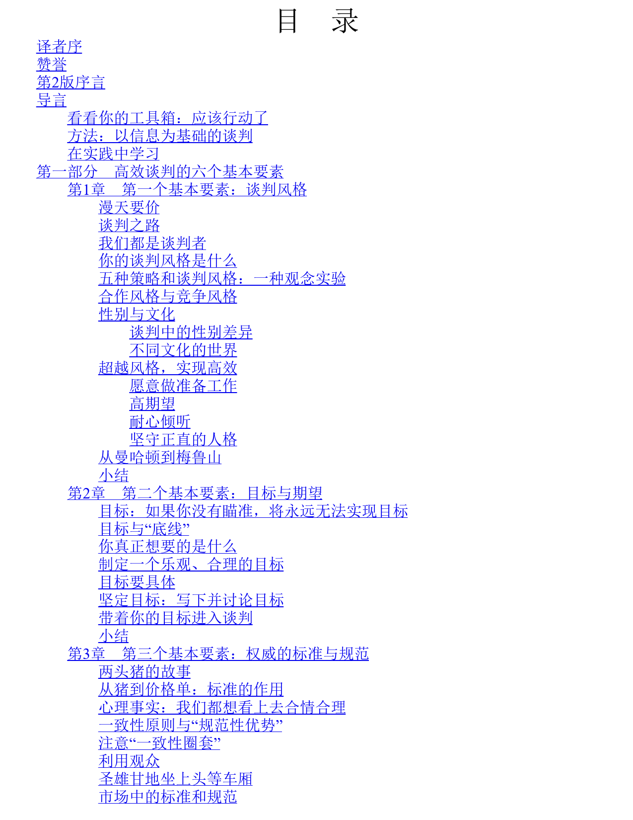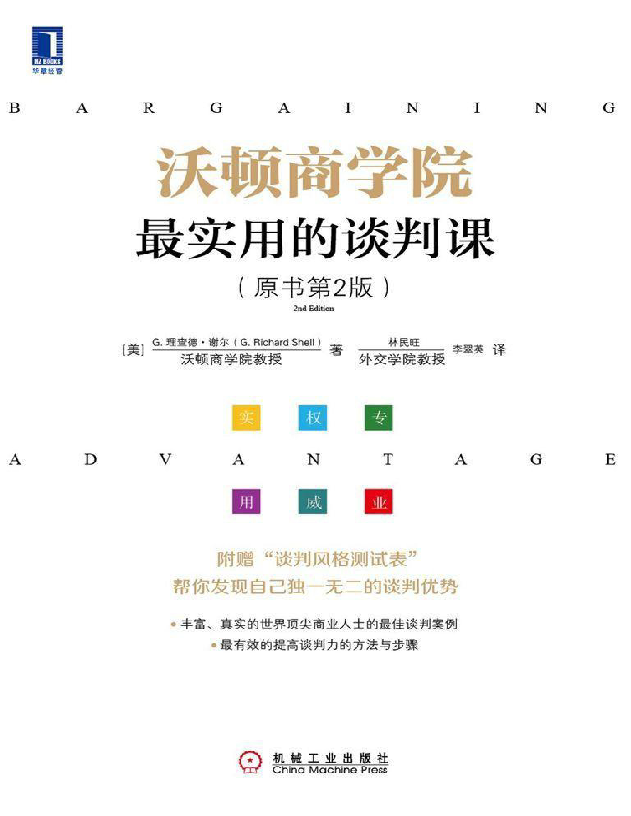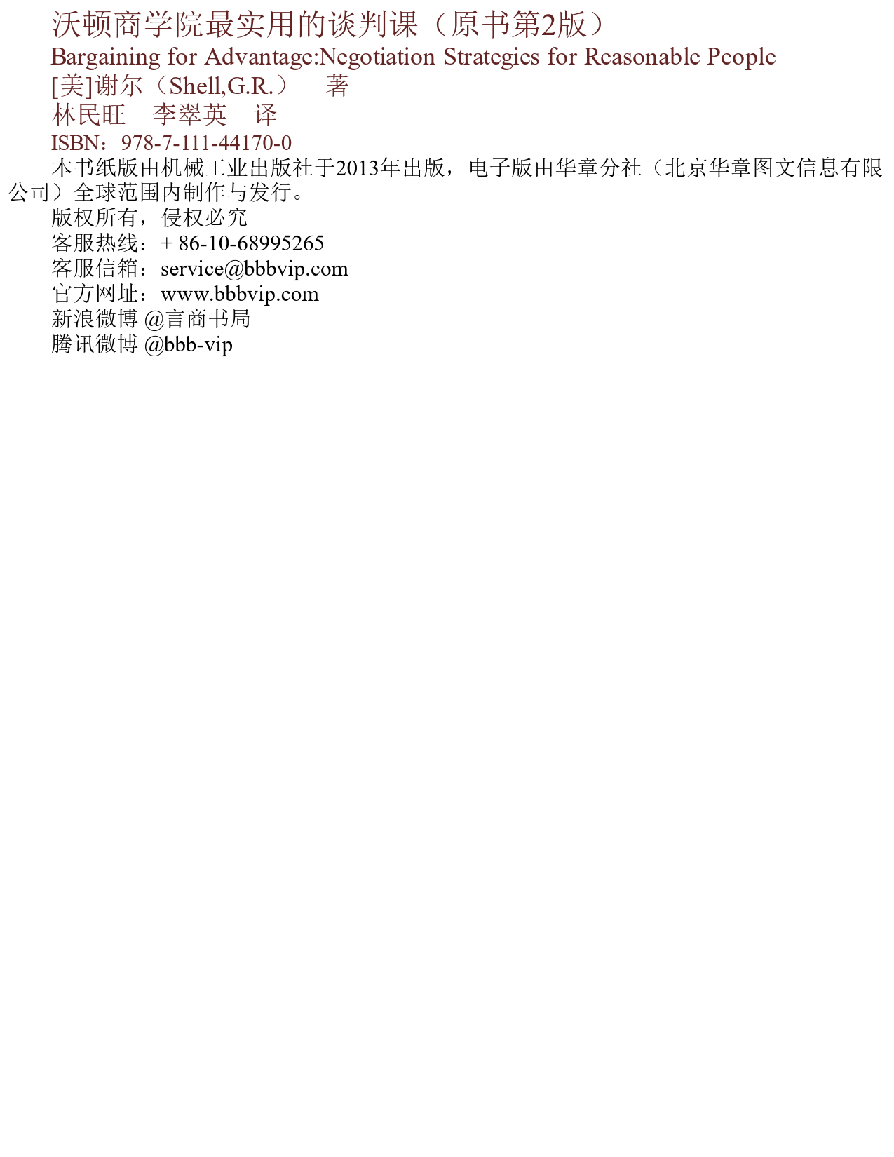 沃顿商学院最实用的谈判课(原书第2版)BargainingforAdvantage:NegotiationStrategiesforReasonablePeople[美]谢尔(Shell,G.R.)著林民旺李翠英译ISBN:978-7-111-44170-0本书纸版由机械工业出版社于2013年出版,电子版由华章分社(北京华章图文信息有限公司)全球范围内制作与发行。版权所有,侵权必究客服热线:+86-10-68995265客服信箱:service@bbbvip.com官方网址:www.bbbvip.com新浪微博@言商书局腾讯微博@bbb-vip目录译者序赞誉第2版序言导言看看你的工具箱:应该行动了方法:以信息为基础的谈判在实践中学习第一部分高效谈判的六个基本要素第1章第一个基本要素:谈判风格漫天要价谈判之路我们都是谈判者你的谈判风格是什么五种策略和谈判风格:一种观念实验合作风格与竞争风格性别与文化谈判中的性别差...