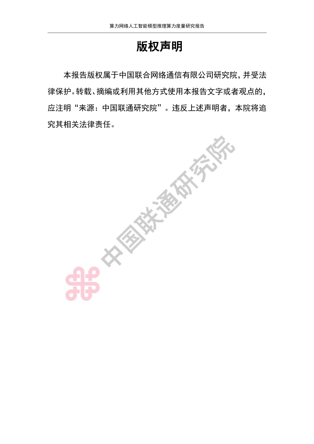 算力网络人工智能模型推理算力度量研究报告中国联通研究院中讯邮电咨询设计院联通数字科技有限公司2025年8月免责申明:行业报告资源群1.本资料来源于网络公开渠1.进群福利:进群即领万份行业研究、管理方案及其他道,版权归属版权方;学习资源,直接打包下载2.本资料仅限会员学习使用,2.每日分享:6+份行研精选、3个行业主题如他用请联系版权方;3.报告查找:群里直接咨询,免费协助查找4.严禁广告:仅限行业报告交流,禁止一切无关信息3.会员费用作为信息收集整理及运营之必须费用;4.如侵犯您的合法权益,请联系客服微信将及时删除。微信扫码长期有效微信扫码行研无忧知识星球行业与管理资源专业知识社群:每月分享10000+份行业研究报告、市场研究、企业运营及咨询管理方案等,涵盖科技、金融、教育、互联网、...