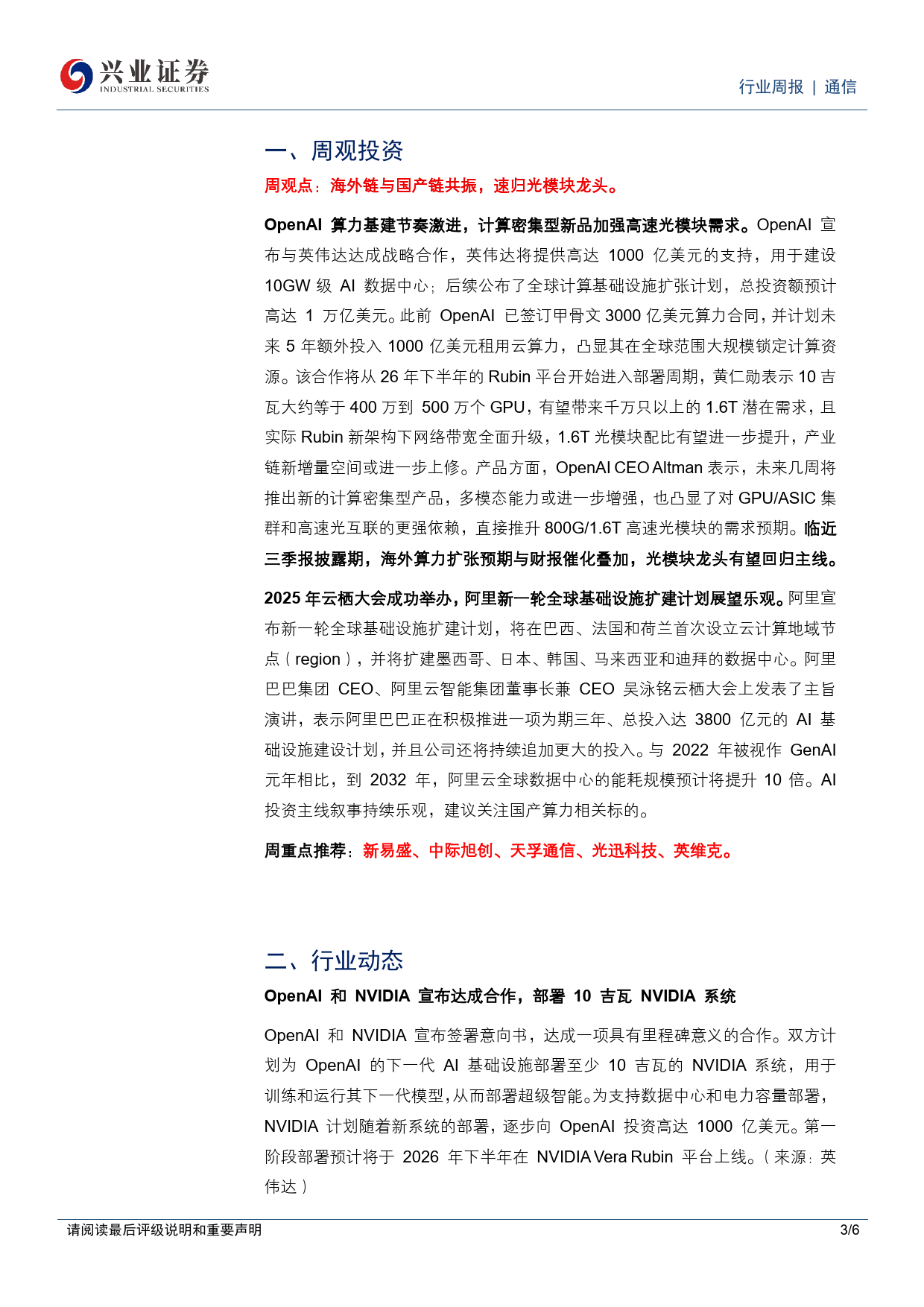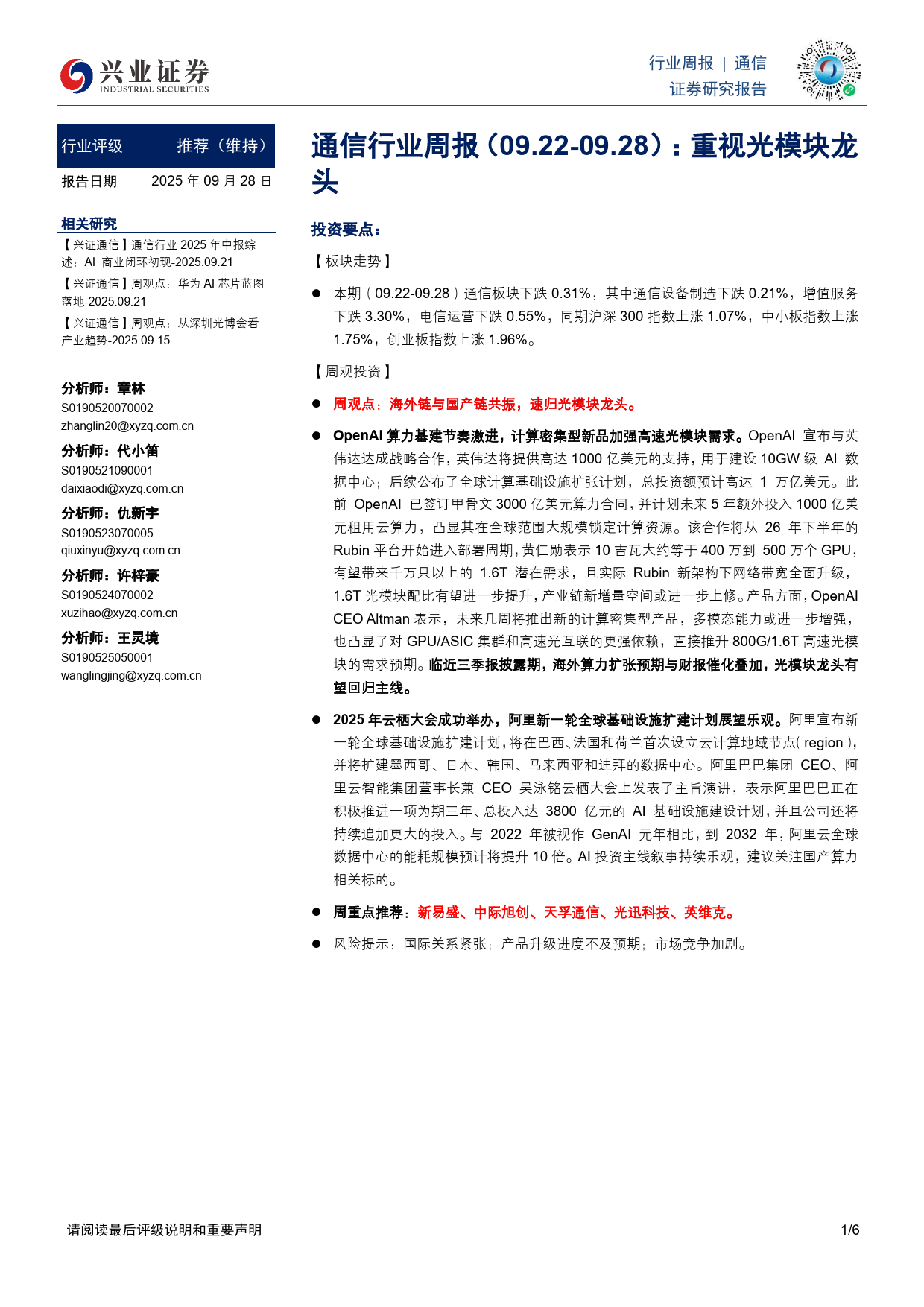 行业评级推荐(维持)行业周报通信报告日期证券研究报告2025年09月28日通信行业周报(09.22-09.28):重视光模块龙相关研究头【兴证通信】通信行业2025年中报综投资要点:述:AI商业闭环初现-2025.09.21【板块走势】【兴证通信】周观点:华为AI芯片蓝图落地-2025.09.21⚫本期(09.22-09.28)通信板块下跌0.31%,其中通信设备制造下跌0.21%,增值服务下跌3.30%,电信运营下跌0.55%,同期沪深300指数上涨1.07%,中小板指数上涨【兴证通信】周观点:从深圳光博会看1.75%,创业板指数上涨1.96%。产业趋势-2025.09.15【周观投资】分析师:章林⚫周观点:海外链与国产链共振,速归光模块龙头。S0190520070002zhanglin20@xyzq.com.cn⚫OpenAI算力基建节奏激进,计算密集型新品加强高速光模块需求。OpenAI宣布与英伟达达成...