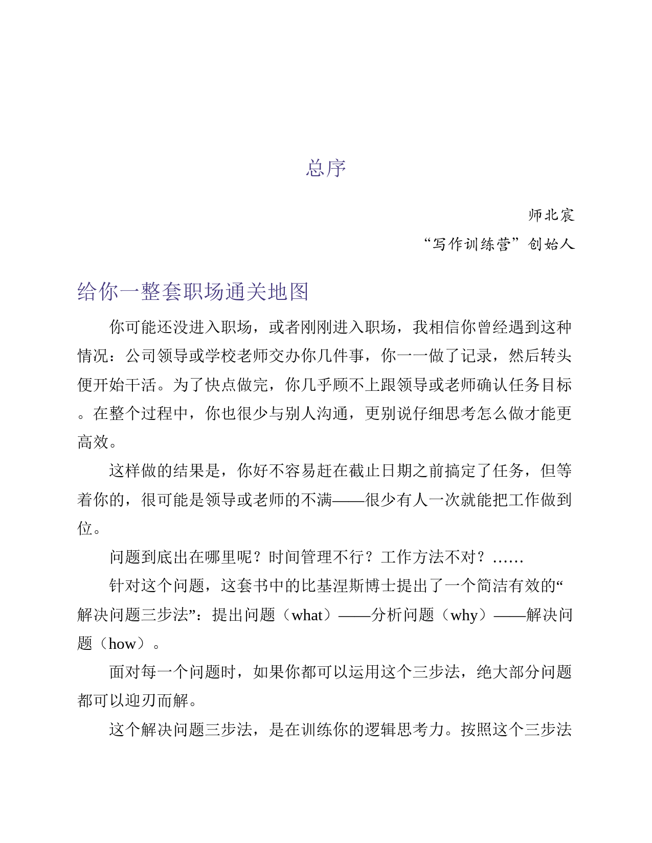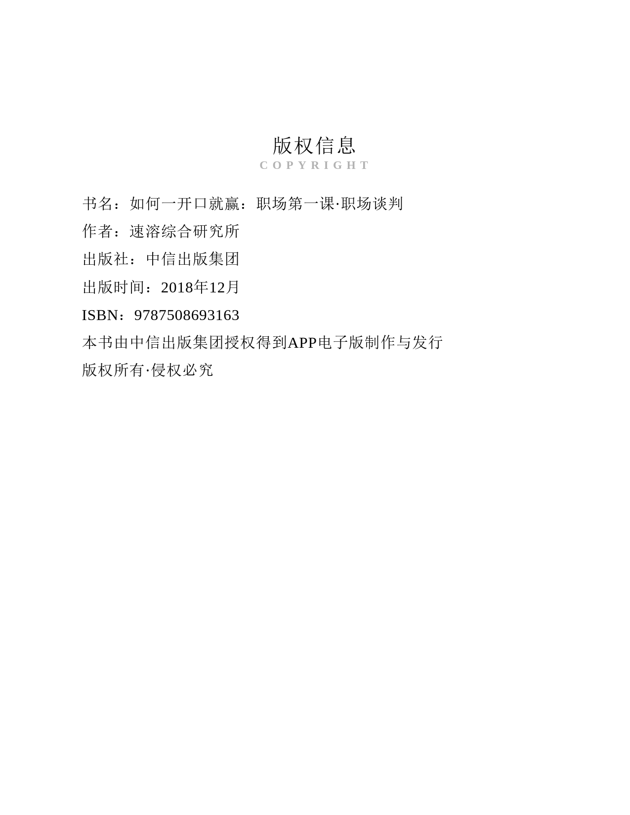 版权信息COPYRIGHT书名:如何一开口就赢:职场第一课·职场谈判作者:速溶综合研究所出版社:中信出版集团出版时间:2018年12月ISBN:9787508693163本书由中信出版集团授权得到APP电子版制作与发行版权所有·侵权必究总序师北宸“写作训练营”创始人给你一整套职场通关地图你可能还没进入职场,或者刚刚进入职场,我相信你曾经遇到这种情况:公司领导或学校老师交办你几件事,你一一做了记录,然后转头便开始干活。为了快点做完,你几乎顾不上跟领导或老师确认任务目标。在整个过程中,你也很少与别人沟通,更别说仔细思考怎么做才能更高效。这样做的结果是,你好不容易赶在截止日期之前搞定了任务,但等着你的,很可能是领导或老师的不满——很少有人一次就能把工作做到位。问题到底出在哪里呢?时间管理不行?工...