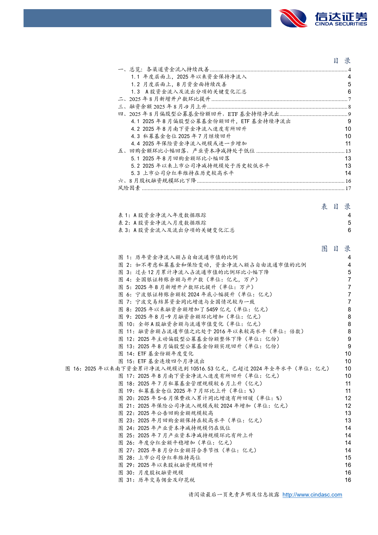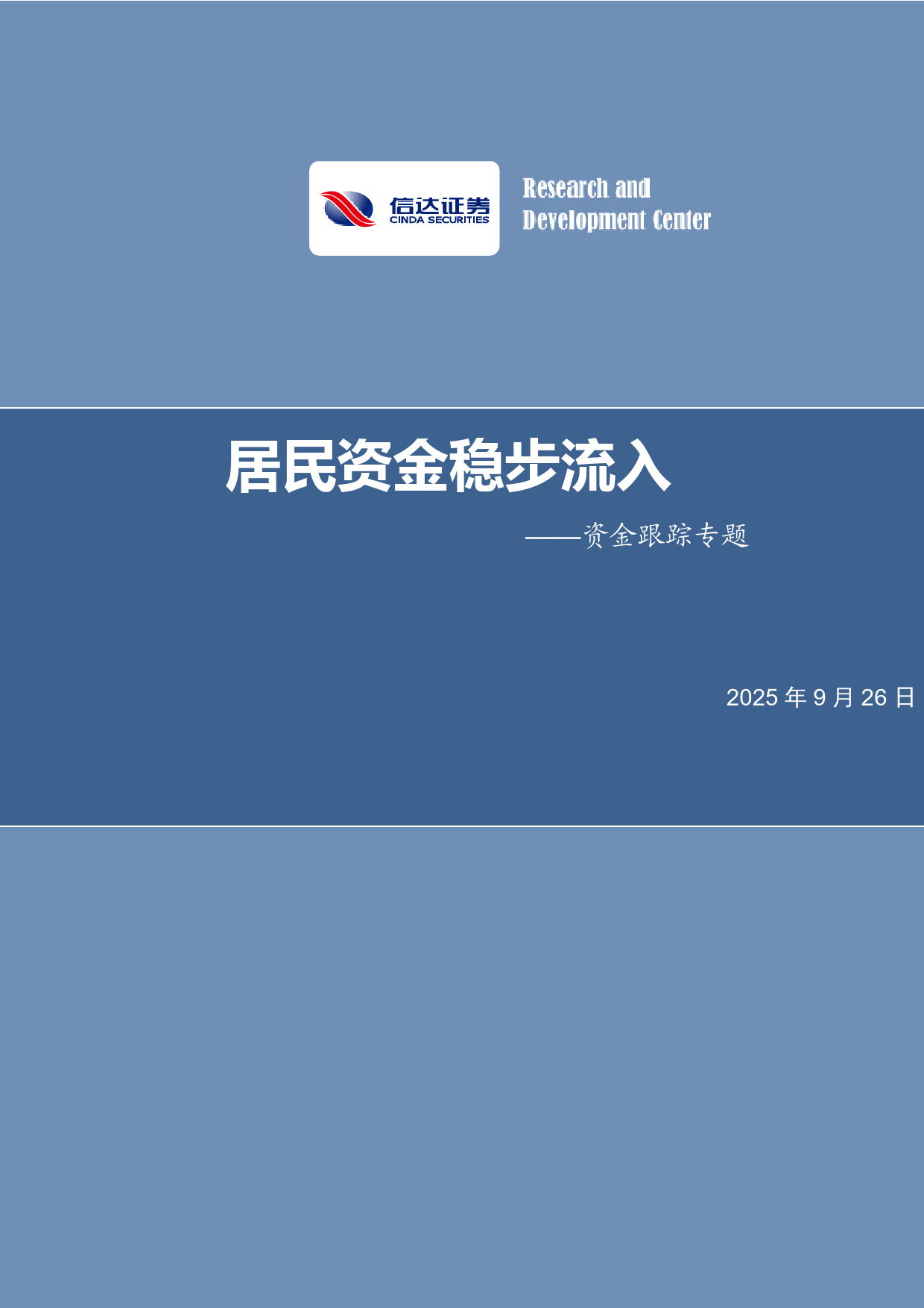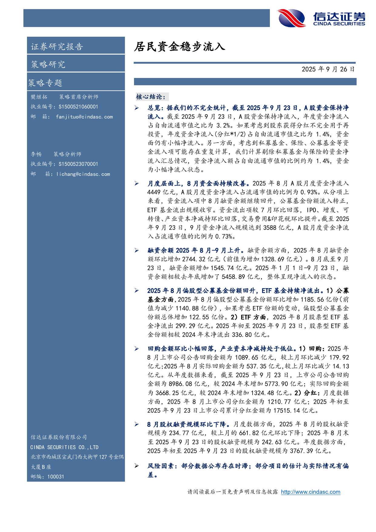 居民资金稳步流入——资金跟踪专题[Tabl2e_0Re2p5ort年Dat9e]月26日请阅读最后一页免责声明及信息披露http://www.cindasc.com1证券研究报告[居Tab民le_资Titl金e]稳步流入策略研究[Table_ReportDate]2025年9月26日[Table_ReportType][Table_Summary]策略专题核心结论:[T樊ab继le拓_Autho策r]略首席分析师➢总览:据我们的不完全统计,截至2025年9月23日,A股资金保持净执业编号:S1500521060001流入。截至2025年9月23日,A股资金保持净流入,年度资金净流入邮箱:fanjituo@cindasc.com占自由流通市值之比为3.2%。如果考虑到股东获得分红不完全用于再李畅策略分析师投资,年度资金净流入(分红1/2)占自由流通市值之比为1.4%,资金执业编号:S1500523070001面仍有小幅净流入。另一方面,考虑到私募基金、保险、公募...