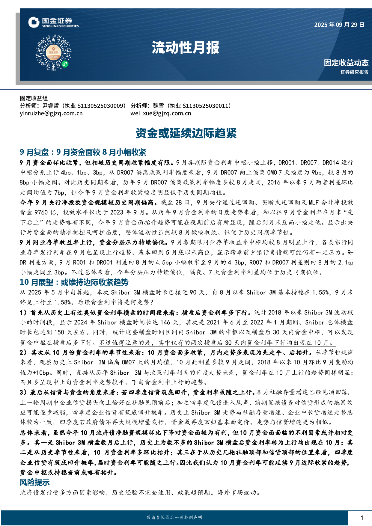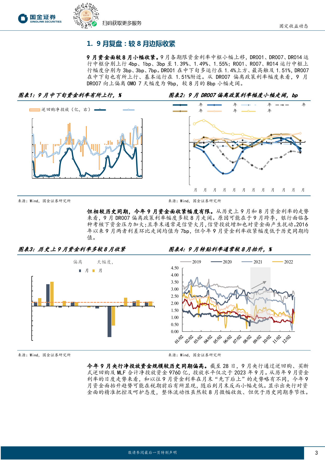 9月复盘:9月资金面较8月小幅收紧9月资金面环比收紧,但相较历史同期收紧幅度有限。9月各期限资金利率中枢小幅上移,DR001、DR007、DR014运行中枢分别上行4bp、1bp、3bp,从DR007偏离政策利率幅度来看,9月DR007向上偏离OMO7天幅度为9bp,较8月的8bp小幅走阔。对比历史同期来看,历年9月DR007偏离政策利率幅度多较8月走阔,2016年以来9月两者利差环比走阔均值为7bp,但今年9月资金利率收紧幅度明显低于历史同期均值。今年9月央行净投放资金规模较历史同期偏高。截至28日,9月央行通过逆回购、买断式逆回购及MLF合计净投放资金9760亿,投放水平仅次于2023年9月。从历年9月资金利率的日度走势来看,和以往9月资金利率在月末“先下后上”的走势略有不同,今年9月资金面抬升趋势可能在税期前后有所显现,随后到月末反...