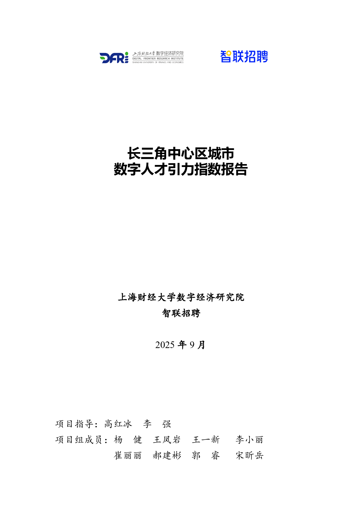 长三角中心区城市数字人才引力指数报告上海财经大学数字经济研究院智联招聘2025年9月项目指导:高红冰李强王一新李小丽项目组成员:杨健王凤岩郭睿宋昕岳崔丽丽郝建彬免责申明:行业报告资源群1.本资料来源于网络公开渠1.进群福利:进群即领万份行业研究、管理方案及其他道,版权归属版权方;学习资源,直接打包下载2.本资料仅限会员学习使用,2.每日分享:6+份行研精选、3个行业主题如他用请联系版权方;3.报告查找:群里直接咨询,免费协助查找4.严禁广告:仅限行业报告交流,禁止一切无关信息3.会员费用作为信息收集整理及运营之必须费用;4.如侵犯您的合法权益,请联系客服微信将及时删除。微信扫码长期有效微信扫码行研无忧知识星球行业与管理资源专业知识社群:每月分享10000+份行业研究报告、市场研究、企...
