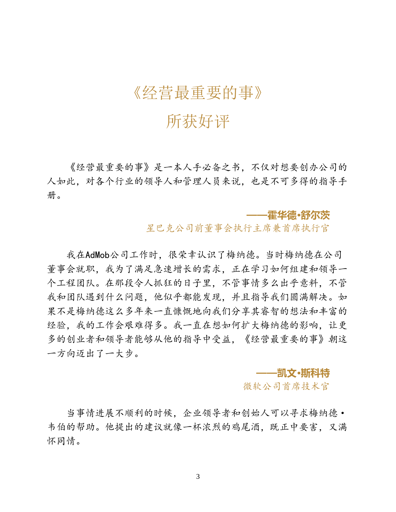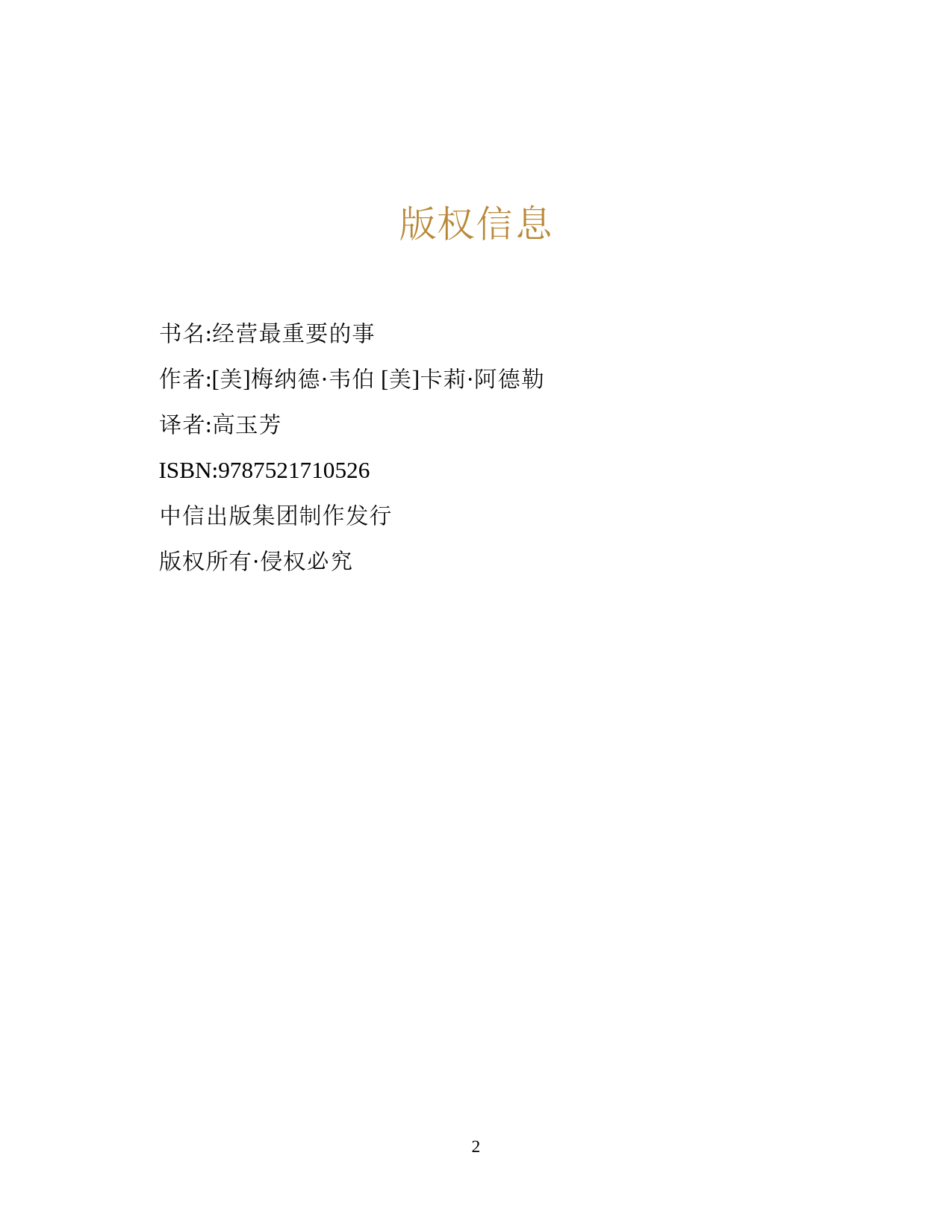 版权信息书名:经营最重要的事作者:[美]梅纳德·韦伯[美]卡莉·阿德勒译者:高玉芳ISBN:9787521710526中信出版集团制作发行版权所有·侵权必究2《经营最重要的事》所获好评《经营最重要的事》是一本人手必备之书,不仅对想要创办公司的人如此,对各个行业的领导人和管理人员来说,也是不可多得的指导手册。——霍华德·舒尔茨星巴克公司前董事会执行主席兼首席执行官我在AdMob公司工作时,很荣幸认识了梅纳德。当时梅纳德在公司董事会就职,我为了满足急速增长的需求,正在学习如何组建和领导一个工程团队。在那段令人抓狂的日子里,不管事情多么出乎意料,不管我和团队遇到什么问题,他似乎都能发现,并且指导我们圆满解决。如果不是梅纳德这么多年来一直慷慨地向我们分享其睿智的想法和丰富的经验,我的工作会艰难...