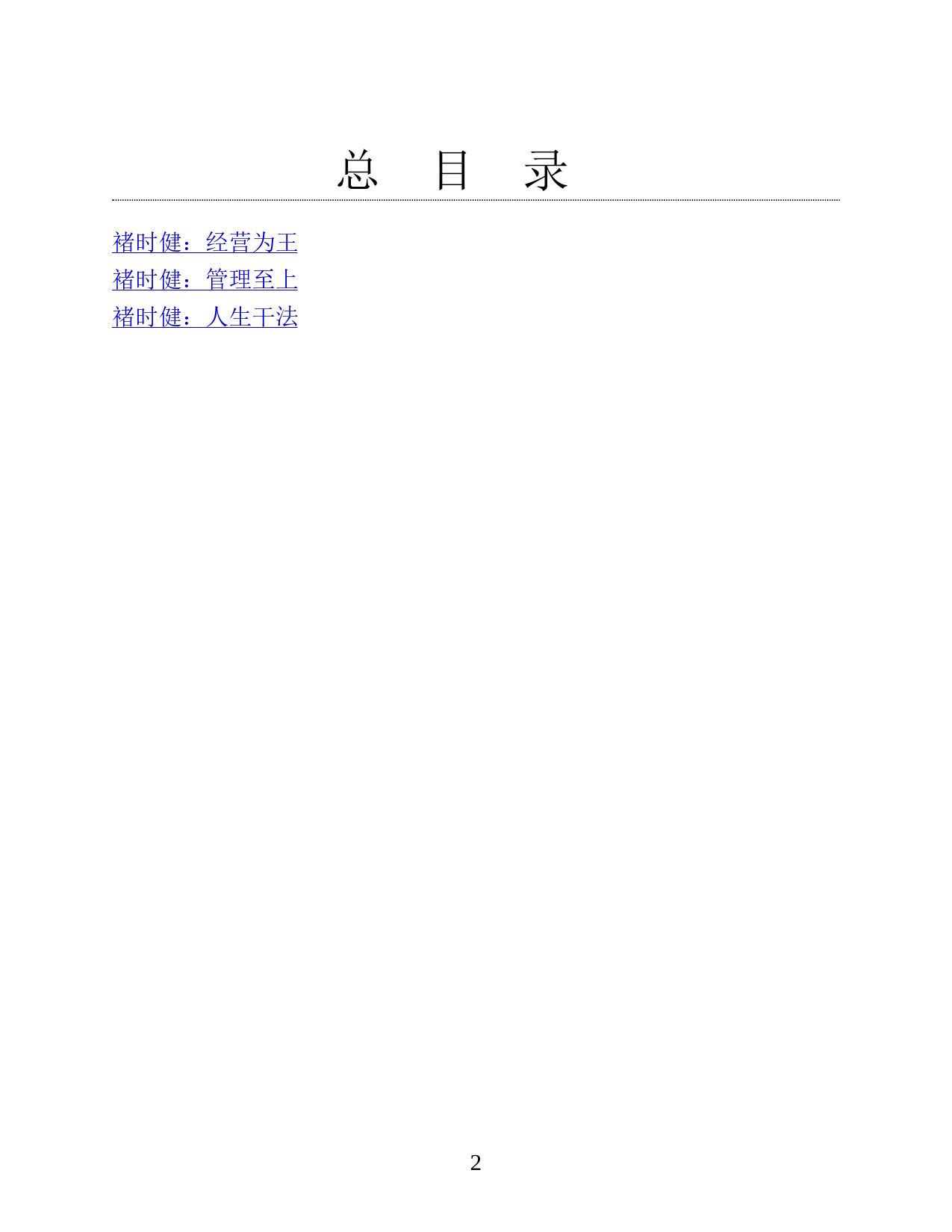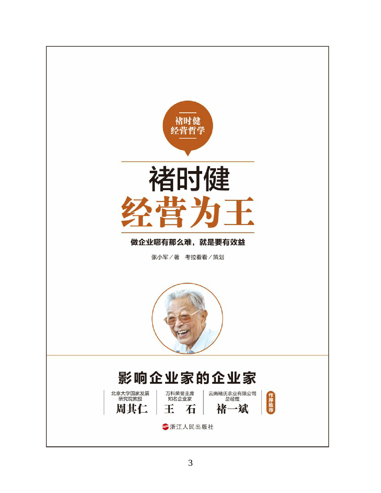 总目录褚时健:经营为王褚时健:管理至上褚时健:人生干法2345图书在版编目(CIP)数据褚时健:经营为王/张小军著.--杭州:浙江人民出版社,2019.9ISBN978-7-213-09374-6Ⅰ.①褚…Ⅱ.①张…Ⅲ.①企业管理—经验—中国Ⅳ.①F279.23中国版本图书馆CIP数据核字(2019)第156599号褚时健:经营为王张小军著出版发行:浙江人民出版社(杭州市体育场路347号邮编:310006)市场部电话:(0571)8506168285176516项目策划:考拉看看责任编辑:朱丽芳何英娇营销编辑:陈雯怡陈芊如责任校对:杨帆责任印务:聂绪东封面设计:元明设计6电脑制版:北京唐人佳悦文化传播有限公司印刷:北京阳光印易科技有限公司开本:710毫米×1000毫米1/16字数:146千字版次:2019年9月第1版书号:ISBN978-7-213-09374-6印张:16.5插页:2...