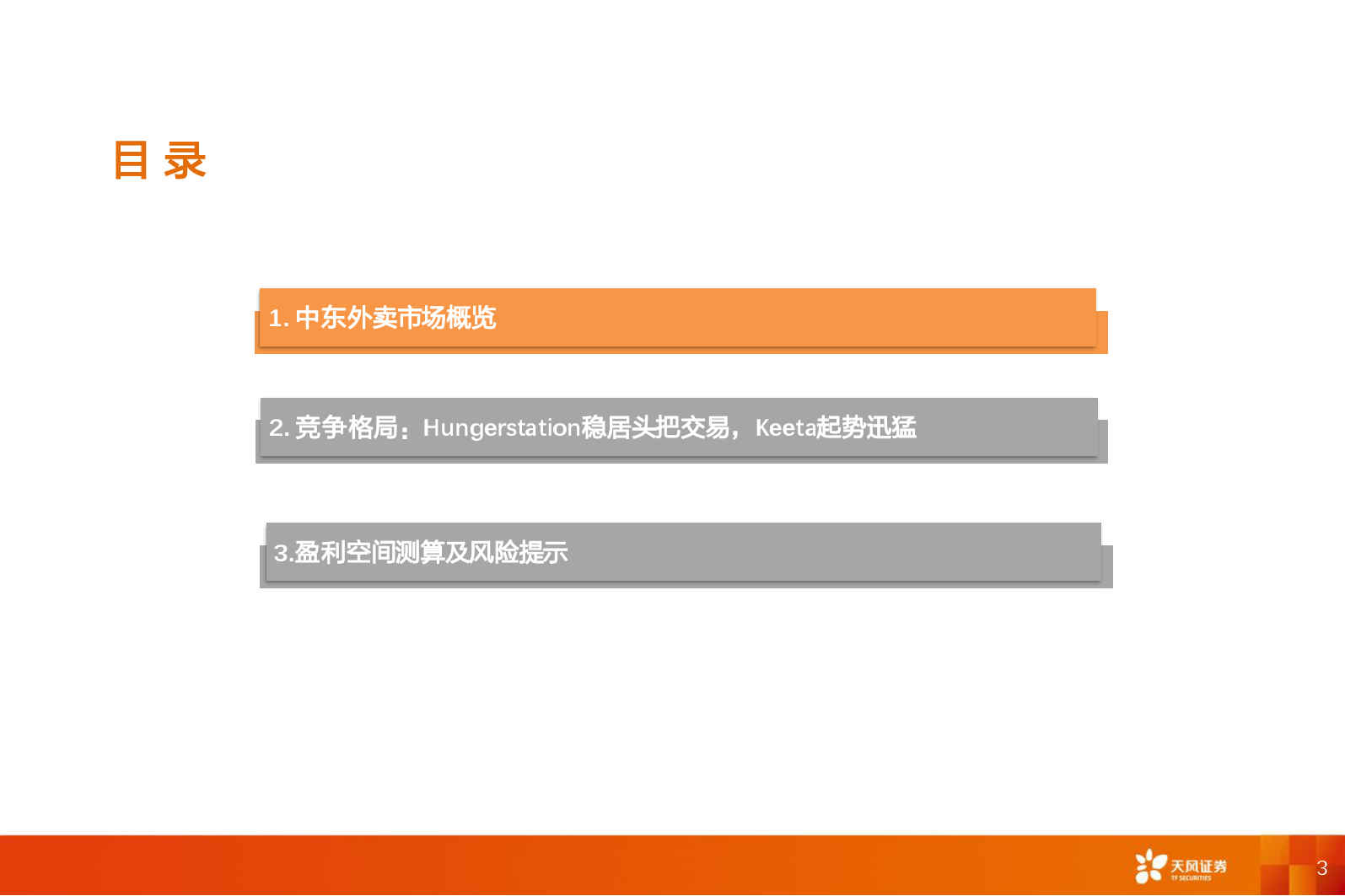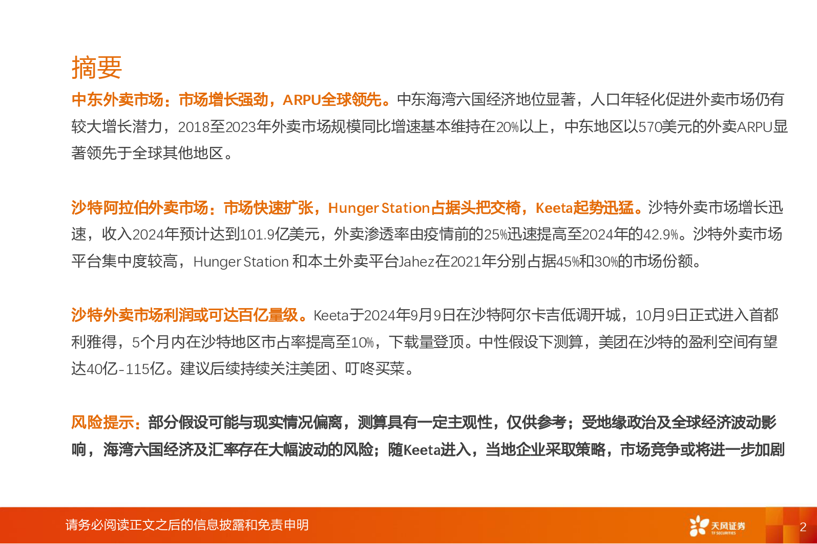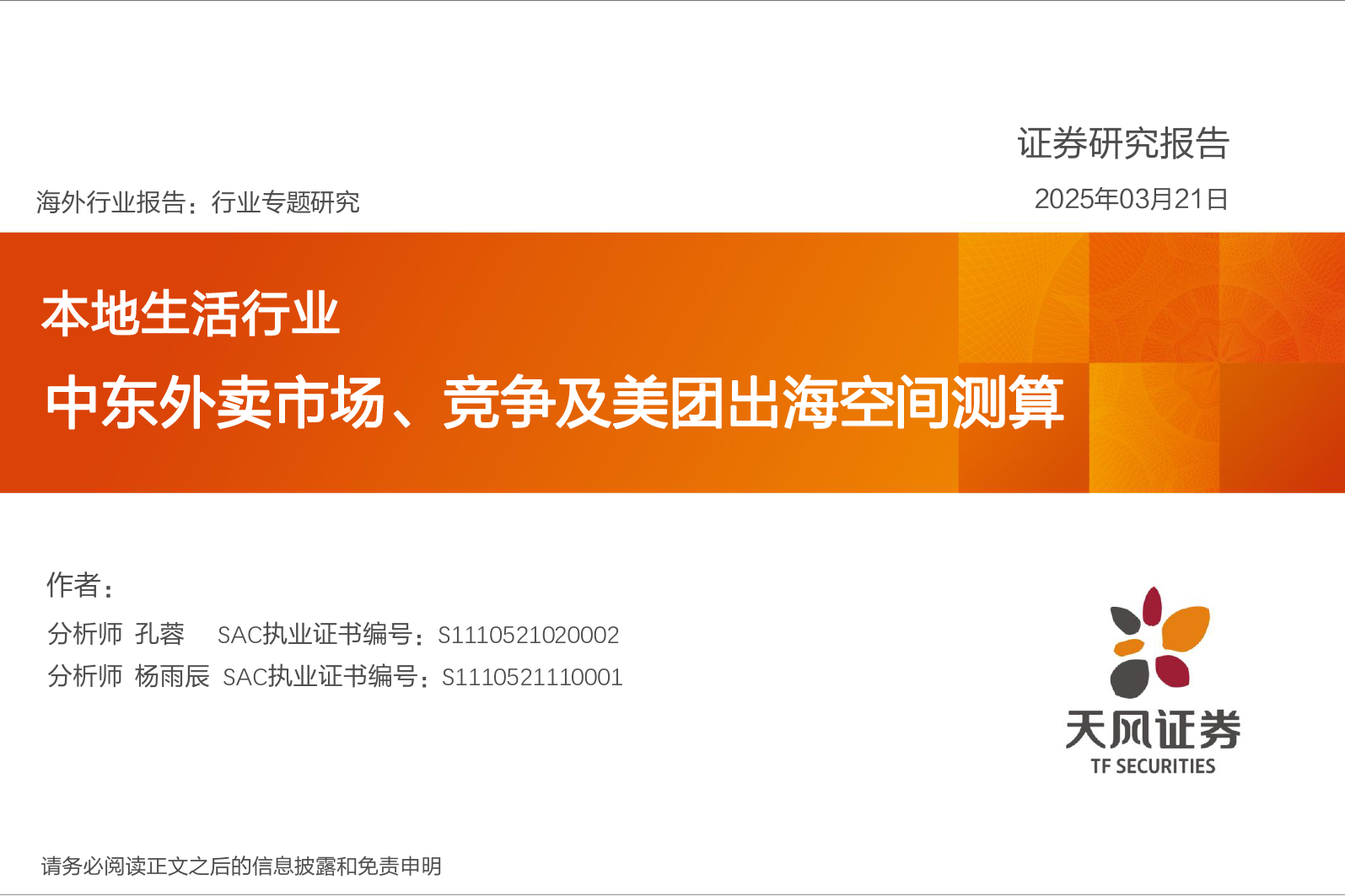 海外行业报告:行业专题研究证券研究报告2025年03月21日本地生活行业中东外卖市场、竞争及美团出海空间测算作者:分析师孔蓉SAC执业证书编号:S1110521020002分析师杨雨辰SAC执业证书编号:S1110521110001请务必阅读正文之后的信息披露和免责申明1摘要中东外卖市场:市场增长强劲,ARPU全球领先。中东海湾六国经济地位显著,人口年轻化促进外卖市场仍有较大增长潜力,2018至2023年外卖市场规模同比增速基本维持在20%以上,中东地区以570美元的外卖ARPU显著领先于全球其他地区。沙特阿拉伯外卖市场:市场快速扩张,HungerStation占据头把交椅,Keeta起势迅猛。沙特外卖市场增长迅速,收入2024年预计达到101.9亿美元,外卖渗透率由疫情前的25%迅速提高至2024年的42.9%。沙特外卖市场平台集中度较高,HungerStation和...