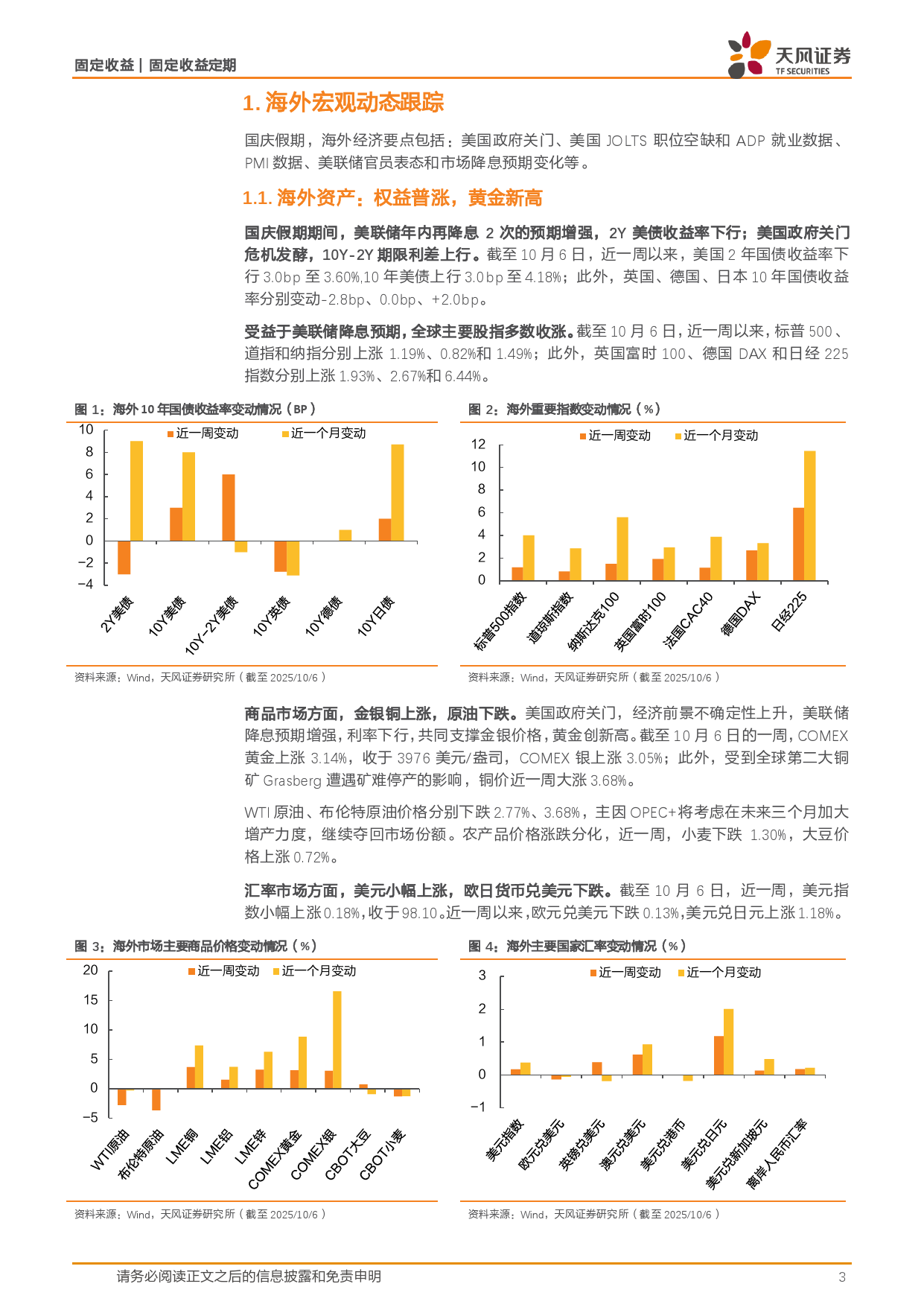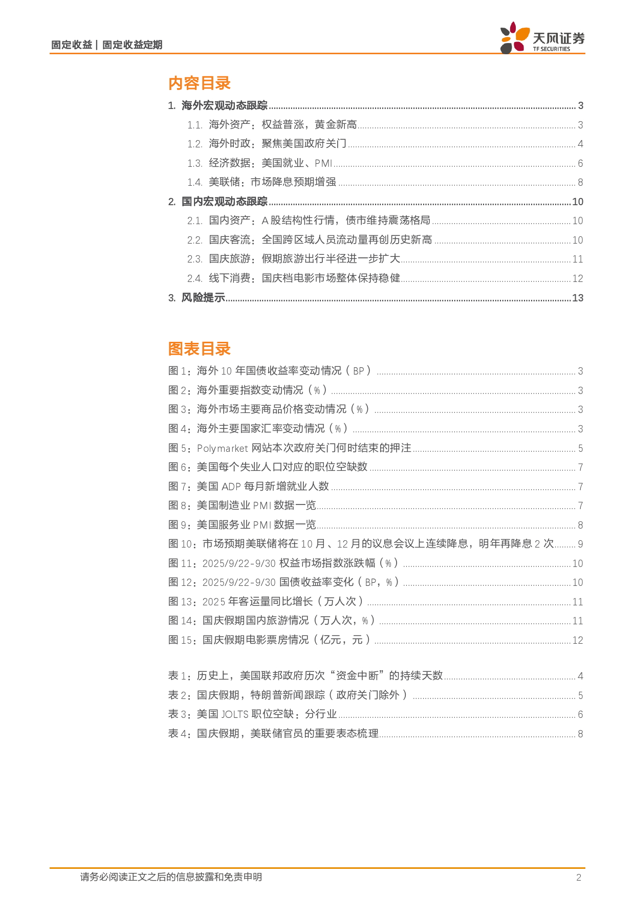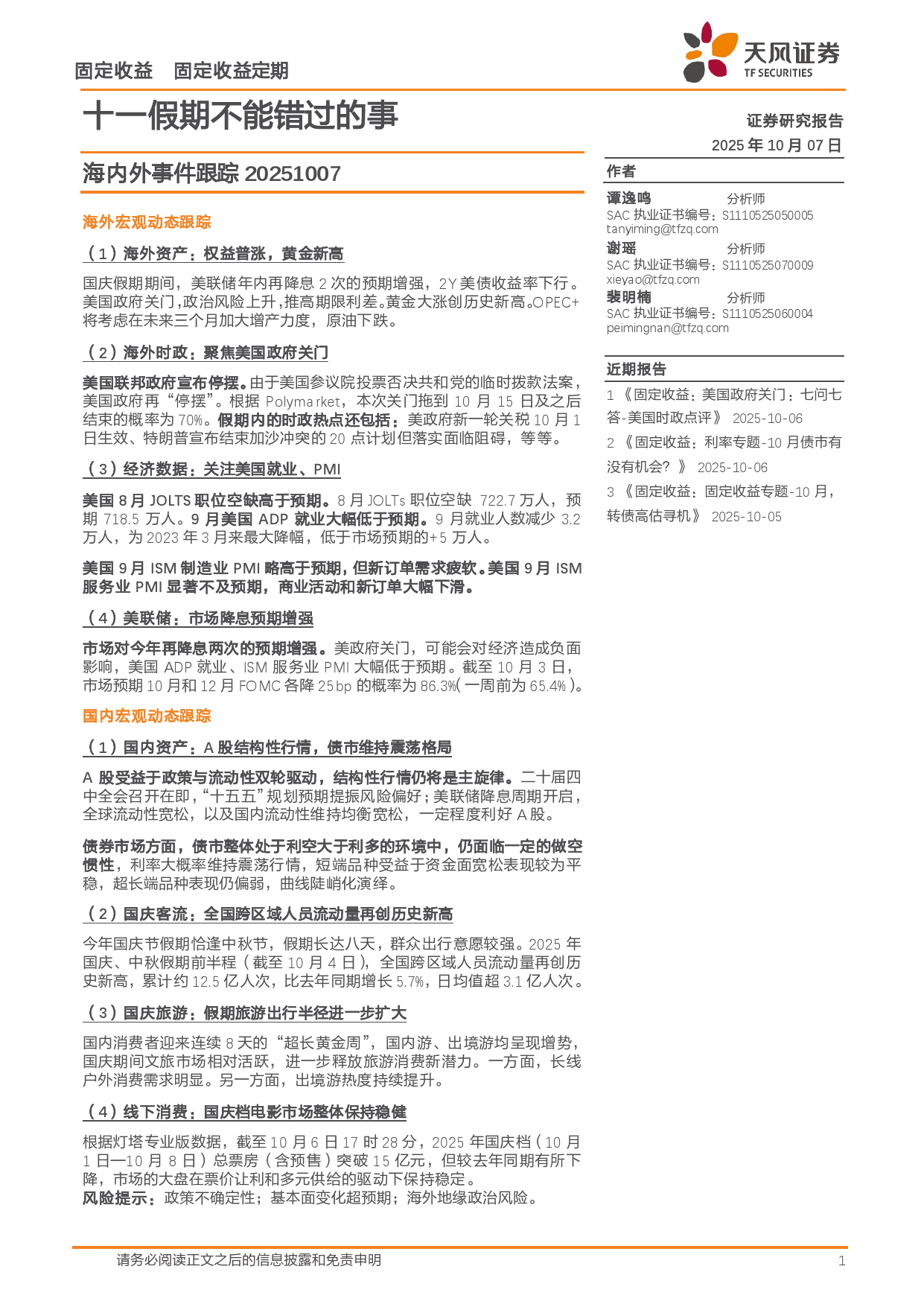 固定收益固定收益定期证券研究报告2025年10月07日十一假期不能错过的事作者海内外事件跟踪20251007谭逸鸣分析师海外宏观动态跟踪SAC执业证书编号:S1110525050005(1)海外资产:权益普涨,黄金新高tanyiming@tfzq.com国庆假期期间,美联储年内再降息2次的预期增强,2Y美债收益率下行。美国政府关门,政治风险上升,推高期限利差。黄金大涨创历史新高。OPEC+谢瑶分析师将考虑在未来三个月加大增产力度,原油下跌。SAC执业证书编号:S1110525070009(2)海外时政:聚焦美国政府关门xieyao@tfzq.com美国联邦政府宣布停摆。由于美国参议院投票否决共和党的临时拨款法案,美国政府再“停摆”。根据Polymarket,本次关门拖到10月15日及之后裴明楠分析师结束的概率为70%。假期内的时政热点还包括:美政府新一轮关税10月1...