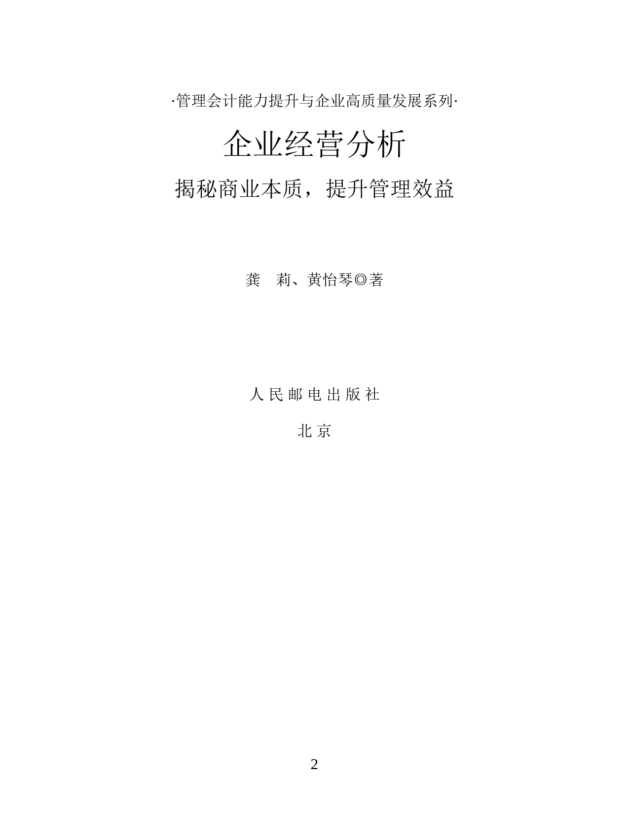 ·管理会计能力提升与企业高质量发展系列·企业经营分析揭秘商业本质,提升管理效益龚莉、黄怡琴◎著人民邮电出版社北京2图书在版编目(CIP)数据企业经营分析:揭秘商业本质,提升管理效益/龚莉,黄怡琴著.--北京:人民邮电出版社,2022.5ISBN978-7-115-58729-9Ⅰ.①企…Ⅱ.①龚…②黄…Ⅲ.①企业经营管理Ⅳ.①F272.3中国版本图书馆CIP数据核字(2022)第032893号著龚莉黄怡琴责任编辑刘晓莹责任印制周昇亮人民邮电出版社出版发行北京市丰台区成寿寺路11号邮编100164电子邮件315@ptpress.com.cn网址https://www.ptpress.com.cn开本:700x10001/16印张:182022年5月第1版字数:259千字2022年5月北京第1次印刷定价:79.80元读者服务热线:(010)81055296印装质量热线:(010)81055316反盗版热线:(010)8105531...
