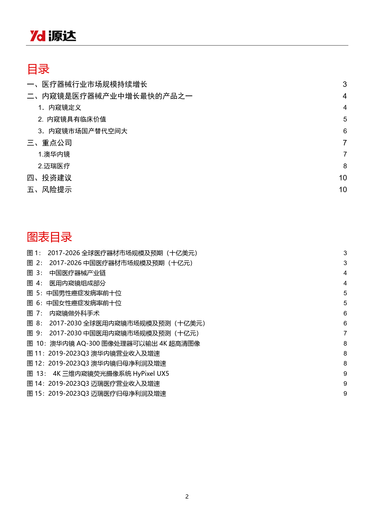 证券研究报告/行业研究我国医用内窥镜行业规模逐年增大,国产替代空间广阔投资评级:看好(首次)——医用内窥镜行业专题研究系列一投资要点➢多元化临床需求推动医疗器械市场规模持续增长分析师:史伟龙受到老龄化加速的影响,慢性病患病率不断增加,临床需求推动全球医疗器械执业登记编号:A0190523050007市场规模不断扩大。据弗诺斯特沙利文《医学影像彩超设备独立市场研究报告》shiweilong@yd.com.cn数据预测,到2026年全球医疗器械市场规模将超过7400亿美元。目前,国内医疗器械市场仍是国际跨国企业占据主导地位,但随着市场需求的提升、国家对医疗产业的扶持以及医疗器械行业技术发展带来的产业升级,逐渐实现国产替代,预计2026年,我国医疗器械市场规模将达到13300亿元。➢内窥镜是全球医疗器械产业中增长最...