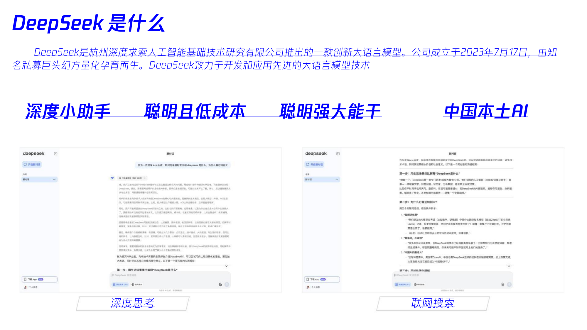 DeepSeek是什么DeepSeek是杭州深度求索人工智能基础技术研究有限公司推出的一款创新大语言模型。公司成立于2023年7月17日,由知名私募巨头幻方量化孕育而生。DeepSeek致力于开发和应用先进的大语言模型技术深度小助手聪明且低成本聪明强大能干中国本土AI深度思考联网搜索企业家社群❆覆盖过万政府机构人员、事业单位负责人、社团组织者、各行业专家学者以及中外优秀企业家等❆涉及建筑、能源、环保、制造业、互联网、教育、人力、零售、美业、食品酒水、电商、服装、餐饮等行业❆会员已覆盖全球六大洲加入社群后,您可获得:1、全球各地10万老板人脉深度对接2、精选行业报告、热点内容、线上大咖导师分享课3、政企对接和北交所投融资以及助力企业全国优惠落地政策等咨询服务4、企业1V1政策资金申报咨询5、不定期线...