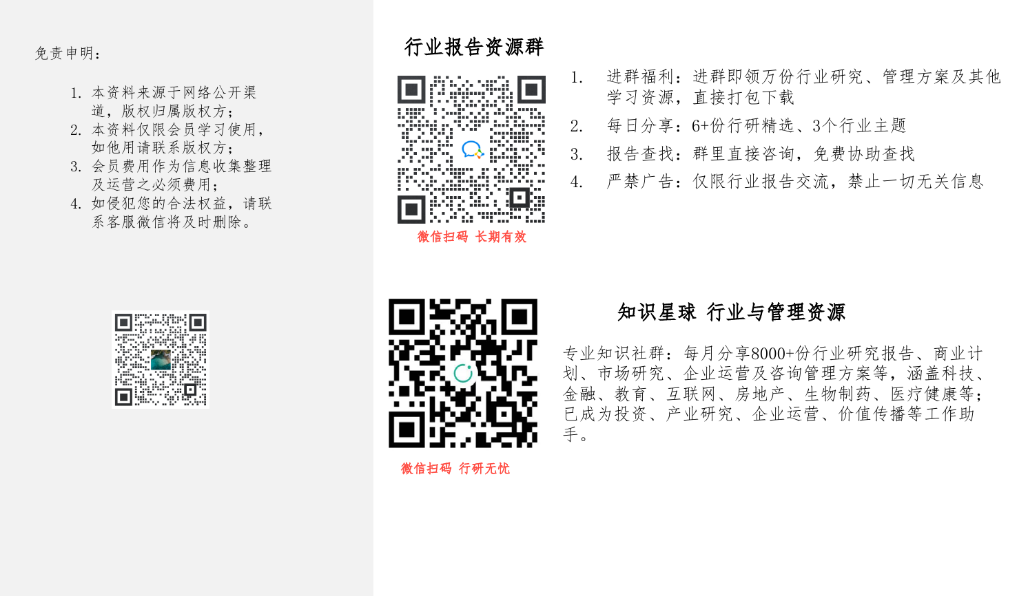 免责申明:行业报告资源群1.本资料来源于网络公开渠1.进群福利:进群即领万份行业研究、管理方案及其他道,版权归属版权方;学习资源,直接打包下载2.本资料仅限会员学习使用,2.每日分享:6+份行研精选、3个行业主题如他用请联系版权方;3.报告查找:群里直接咨询,免费协助查找4.严禁广告:仅限行业报告交流,禁止一切无关信息3.会员费用作为信息收集整理及运营之必须费用;4.如侵犯您的合法权益,请联系客服微信将及时删除。微信扫码长期有效知识星球行业与管理资源专业知识社群:每月分享8000+份行业研究报告、商业计划、市场研究、企业运营及咨询管理方案等,涵盖科技、金融、教育、互联网、房地产、生物制药、医疗健康等;已成为投资、产业研究、企业运营、价值传播等工作助手。微信扫码行研无忧2023-2024年...
