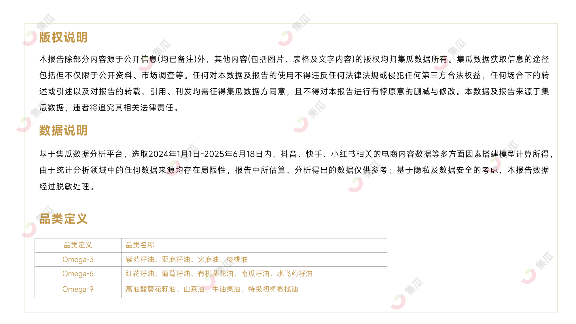 研究分析:抖音、快手、小红书2025半年报Omega系列食用油分析市场概览竞争格局用户洞察品牌启示2025-07果集集瓜团队版权说明本报告除部分内容源于公开信息(均已备注)外,其他内容(包括图片、表格及文字内容)的版权均归集瓜数据所有。集瓜数据获取信息的途径包括但不仅限于公开资料、市场调查等。任何对本数据及报告的使用不得违反任何法律法规或侵犯任何第三方合法权益,任何场合下的转述或引述以及对报告的转载、引用、刊发均需征得集瓜数据方同意,且不得对本报告进行有悖原意的删减与修改。本数据及报告来源于集瓜数据,违者将追究其相关法律责任。数据说明基于集瓜数据分析平台,选取2024年1月1日-2025年6月18日内,抖音、快手、小红书相关的电商内容数据等多方面因素搭建模型计算所得,由于统计分析领域中的...