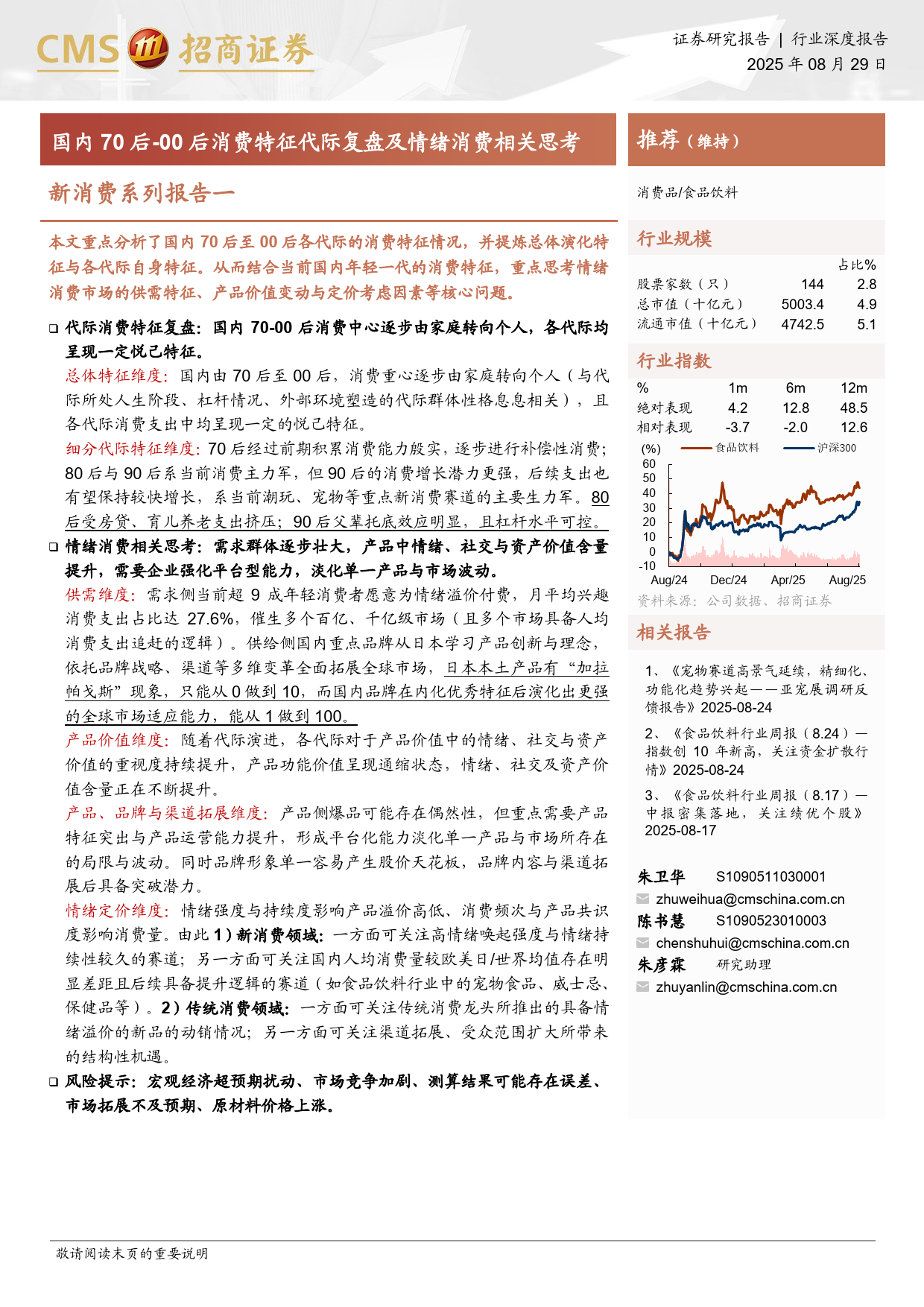 证券研究报告行业深度报告2025年08月29日国内70后-00后消费特征代际复盘及情绪消费相关思考推荐(维持)新消费系列报告一消费品/食品饮料本文重点分析了国内70后至00后各代际的消费特征情况,并提炼总体演化特行业规模144占比%征与各代际自身特征。从而结合当前国内年轻一代的消费特征,重点思考情绪5003.42.8消费市场的供需特征、产品价值变动与定价考虑因素等核心问题。股票家数(只)4742.54.9总市值(十亿元)5.1❑代际消费特征复盘:国内70-00后消费中心逐步由家庭转向个人,各代际均流通市值(十亿元)呈现一定悦己特征。总体特征维度:国内由70后至00后,消费重心逐步由家庭转向个人(与代行业指数际所处人生阶段、杠杆情况、外部环境塑造的代际群体性格息息相关),且各代际消费支出中均呈现一定的悦己特...