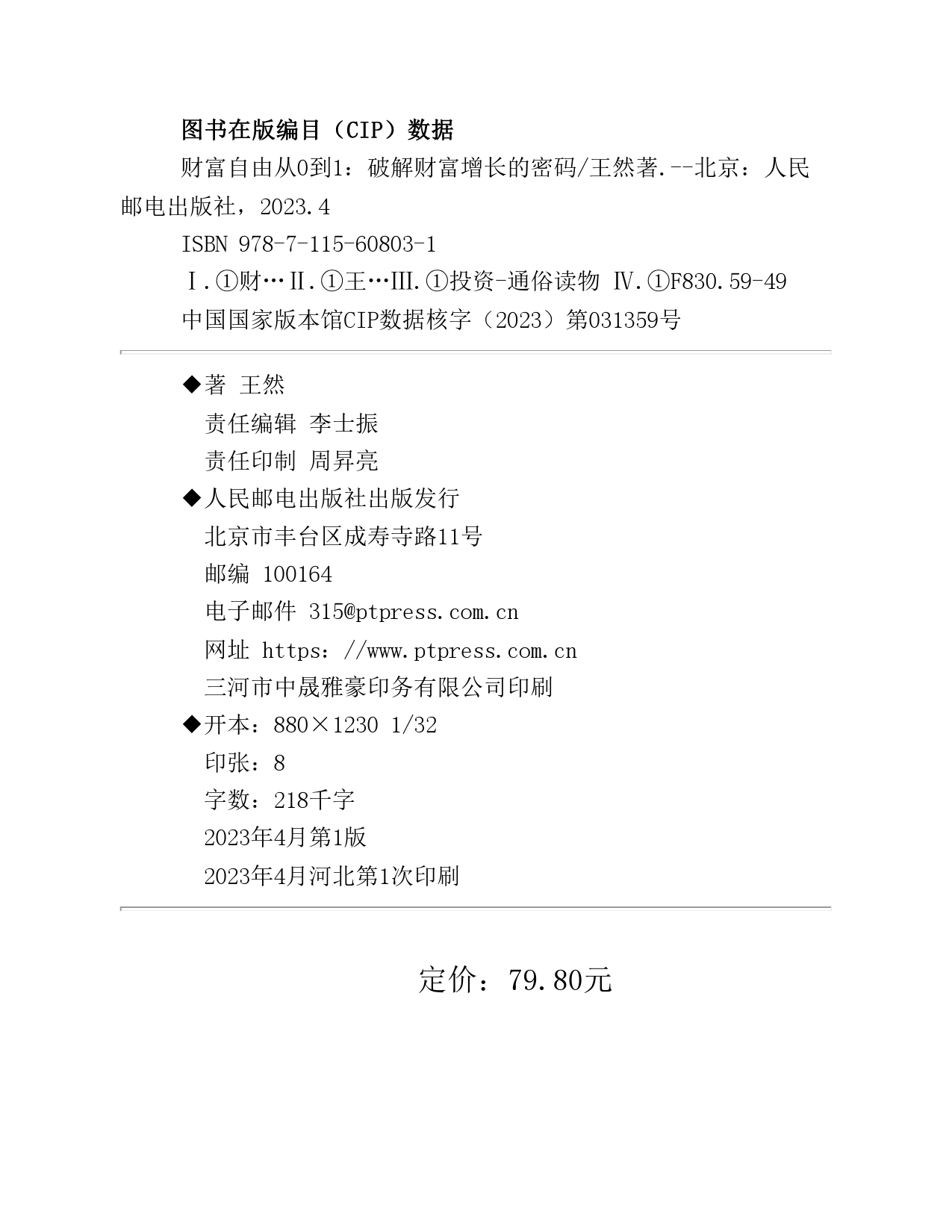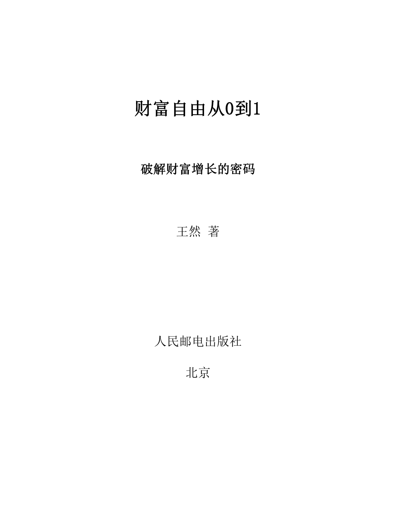 财富自由从0到1破解财富增长的密码王然著人民邮电出版社北京图书在版编目(CIP)数据财富自由从0到1:破解财富增长的密码/王然著.--北京:人民邮电出版社,2023.4ISBN978-7-115-60803-1Ⅰ.①财…Ⅱ.①王…Ⅲ.①投资-通俗读物Ⅳ.①F830.59-49中国国家版本馆CIP数据核字(2023)第031359号◆著王然责任编辑李士振责任印制周昇亮◆人民邮电出版社出版发行北京市丰台区成寿寺路11号邮编100164电子邮件315@ptpress.com.cn网址https://www.ptpress.com.cn三河市中晟雅豪印务有限公司印刷◆开本:880×12301/32印张:8字数:218千字2023年4月第1版2023年4月河北第1次印刷定价:79.80元读者服务热线:(010)81055296印装质量热线:(010)81055316反盗版热线:(010)81055315广告经营许可证:京东市监广登字20170147号...
