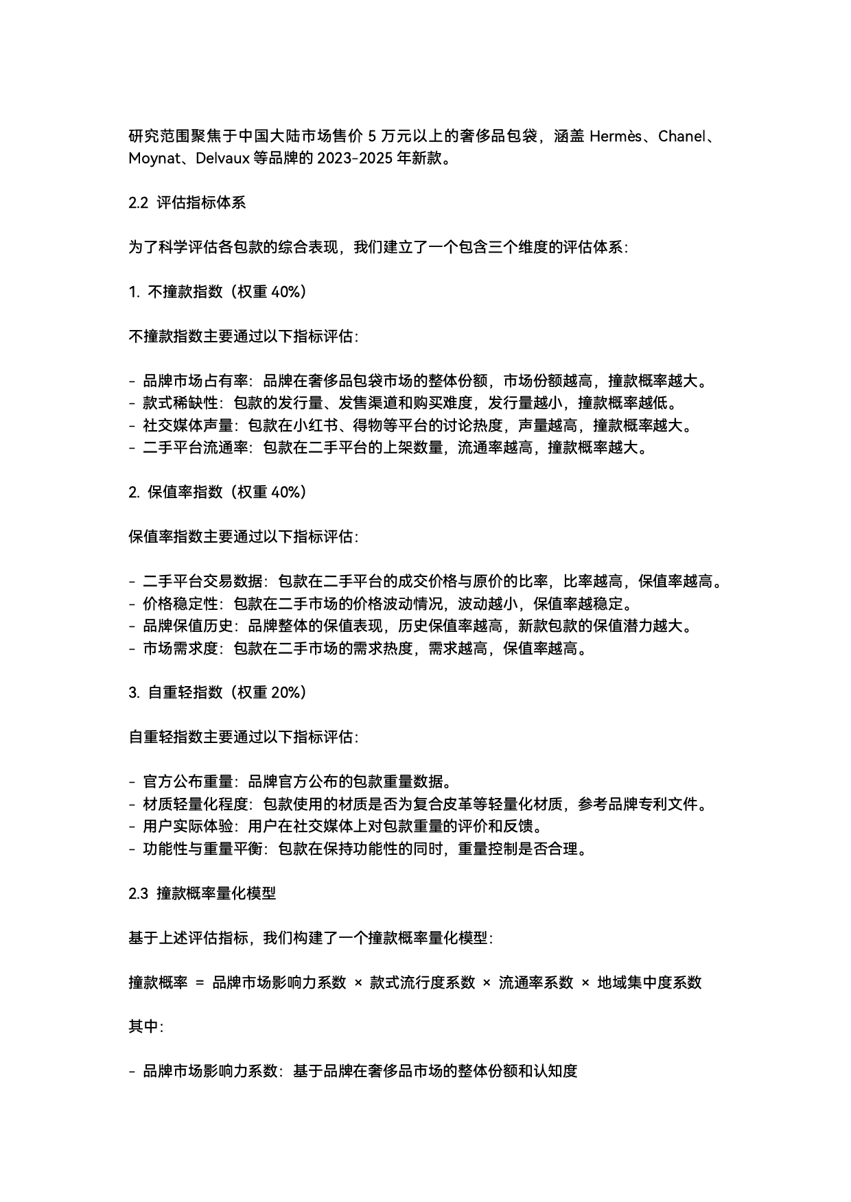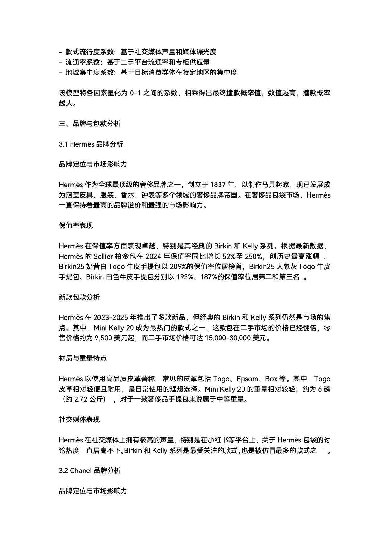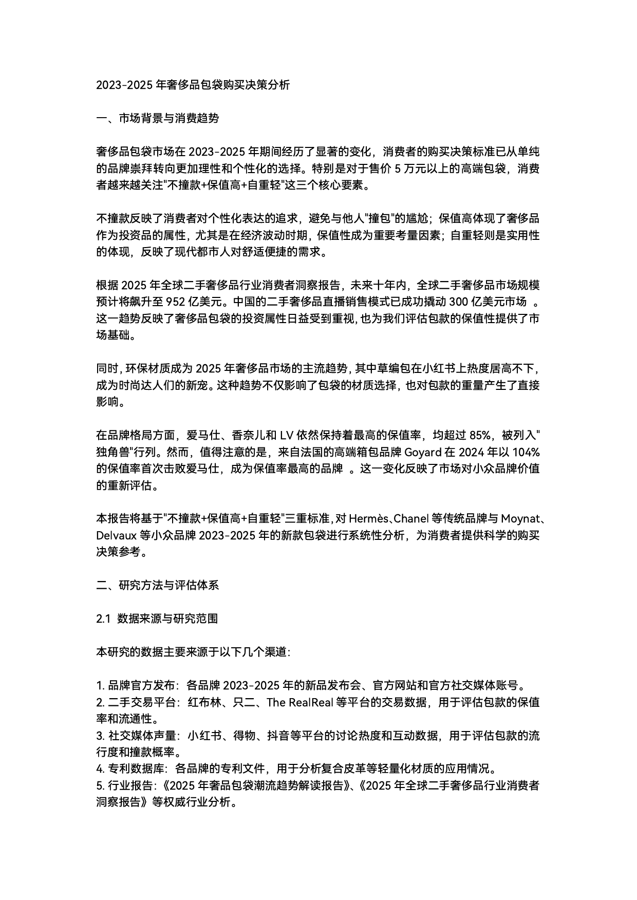 2023-2025年奢侈品包袋购买决策分析一市场背景与消费趋势奢侈品包袋市场在2023-2025年期间经历了显著的变化消费者的购买决策标准已从单纯的品牌崇拜转向更加理性和个性化的选择特别是对于售价5万元以上的高端包袋消费者越来越关注"不撞款+保值高+自重轻"这三个核心要素不撞款反映了消费者对个性化表达的追求避免与他人"撞包"的尴尬保值高体现了奢侈品作为投资品的属性尤其是在经济波动时期保值性成为重要考量因素自重轻则是实用性的体现反映了现代都市人对舒适便捷的需求根据2025年全球二手奢侈品行业消费者洞察报告未来十年内全球二手奢侈品市场规模预计将飙升至952亿美元中国的二手奢侈品直播销售模式已成功撬动300亿美元市场这一趋势反映了奢侈品包袋的投资属性日益受到重视也为我们评估包款的保值性提供了市场...