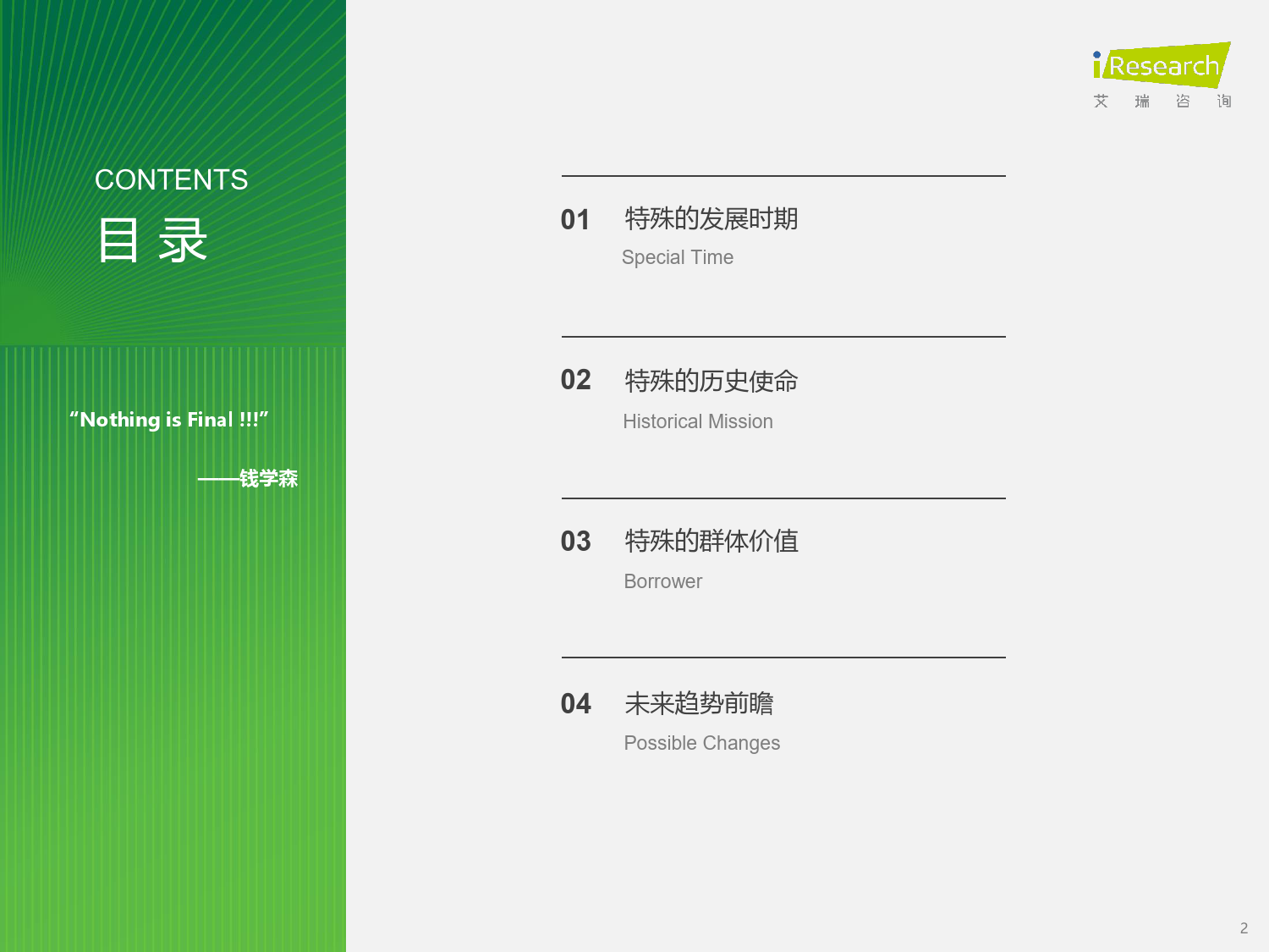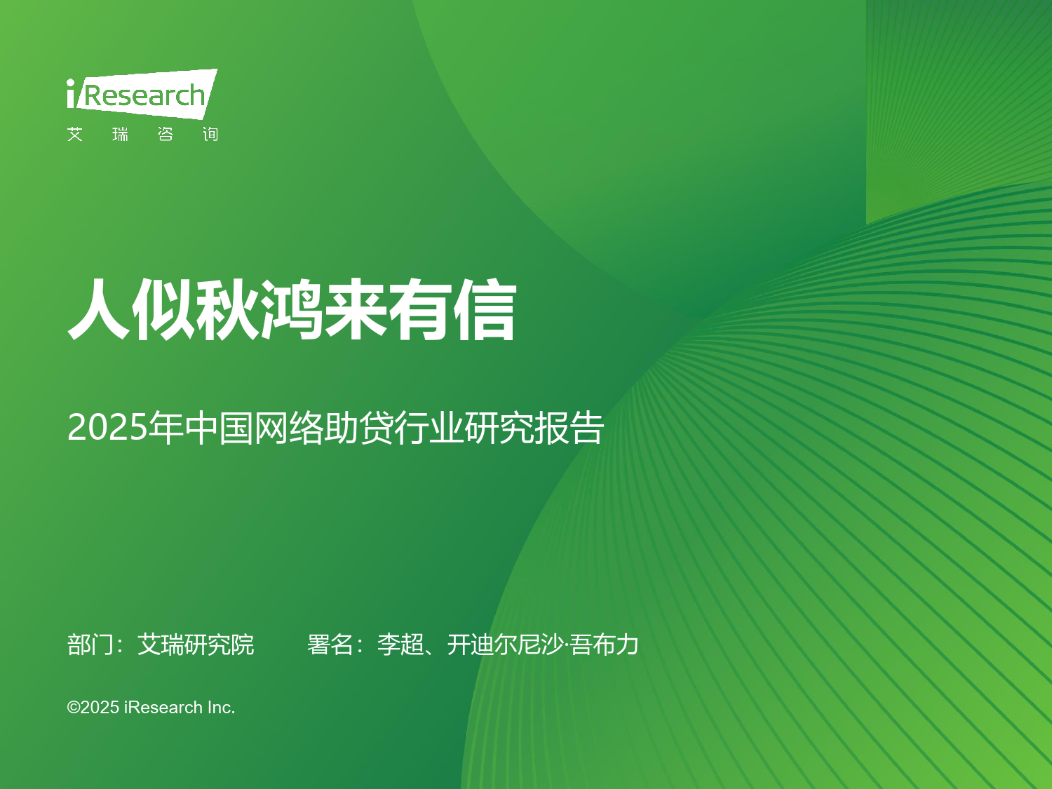 人似秋鸿来有信2025年中国网络助贷行业研究报告部门:艾瑞研究院署名:李超、开迪尔尼沙·吾布力©2025iResearchInc.每日免费获取报告1、每日微信群内分享8+最新重磅报告;2、每日分享当日华尔街日报、金融时报;3、每周分享经济学人4、行研报告均为公开版,权利归原作者所有,小马财经仅分发做内部学习。扫一扫二维码关注公众号回复:研究报告加入“小马财经”微信群。CONTENTS01特殊的发展时期目录SpecialTime“NothingisFinal!!!”02特殊的历史使命——钱学森HistoricalMission03特殊的群体价值Borrower04未来趋势前瞻PossibleChanges201特殊的发展时期SpecialTime3不可阻挡之势数字的生产资料属性被夯实,科技无意间开启的社会迭代根据国家互联网中心的统计数据,2004年中国网民总数不足1亿,但是截至2025年这...