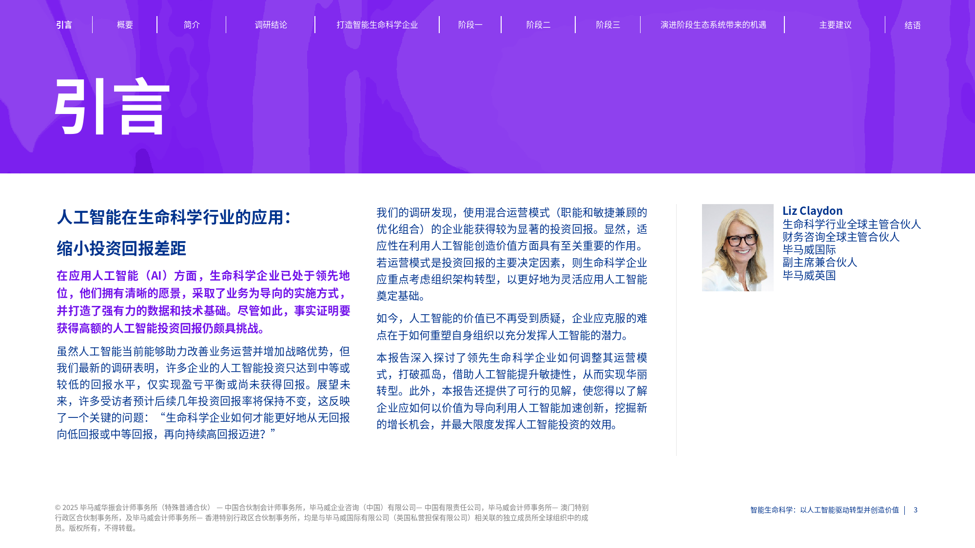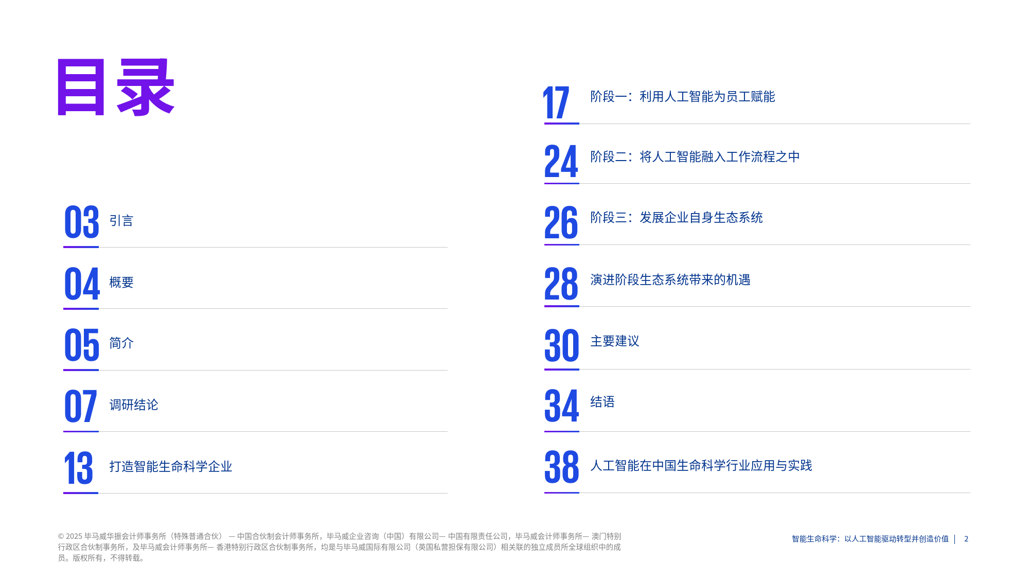 智能生命科学以人工智能驱动转型并创造价值毕马威创见不同·智启未来kpmg.com/intelligentlifesciences目录17阶段一:利用人工智能为员工赋能24阶段二:将人工智能融入工作流程之中03引言26阶段三:发展企业自身生态系统04概要28演进阶段生态系统带来的机遇05简介30主要建议07调研结论34结语13打造智能生命科学企业38人工智能在中国生命科学行业应用与实践©2025毕马威华振会计师事务所(特殊普通合伙)—中国合伙制会计师事务所,毕马威企业咨询(中国)有限公司—中国有限责任公司,毕马威会计师事务所—澳门特别智能生命科学:以人工智能驱动转型并创造价值2行政区合伙制事务所,及毕马威会计师事务所—香港特别行政区合伙制事务所,均是与毕马威国际有限公司(英国私营担保有限公司)相关联的独立成员所全球组...