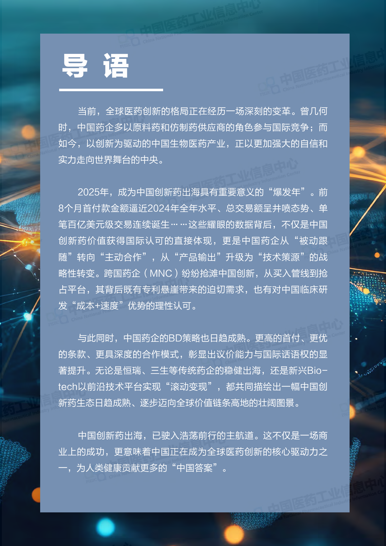 2025年中国创新药出海正当时目录一、出海交易量价齐升,热点赛道持续涌现01二、MNC加速扫货:专利悬崖与研发效率驱动购买需求101.肿瘤管线:竞逐下一代IO疗法,头部MNC多维布局122.自免管线:新兴靶点与跨界应用,开辟百亿美元新战场18三、生态日趋成熟:从“产品出海”迈向“价值出海”24更多医药咨讯请关注“医药地理数据库”导语当前,全球医药创新的格局正在经历一场深刻的变革。曾几何时,中国药企多以原料药和仿制药供应商的角色参与国际竞争;而如今,以创新为驱动的中国生物医药产业,正以更加强大的自信和实力走向世界舞台的中央。2025年,成为中国创新药出海具有重要意义的“爆发年”。前8个月首付款金额逼近2024年全年水平、总交易额呈井喷态势、单笔百亿美元级交易连续诞生……这些耀眼的数据背后,不...