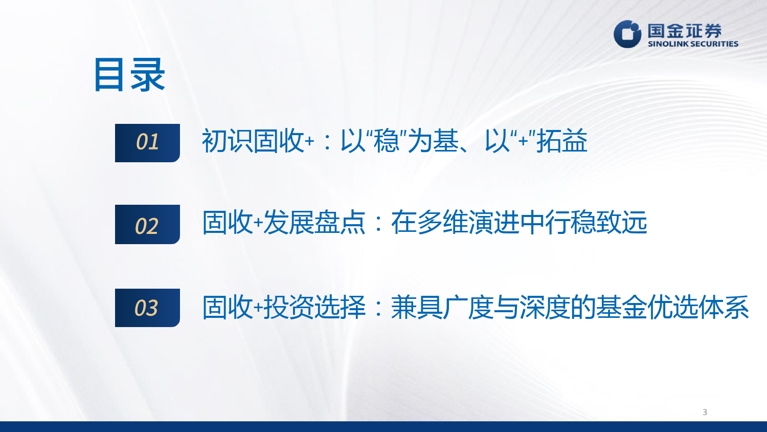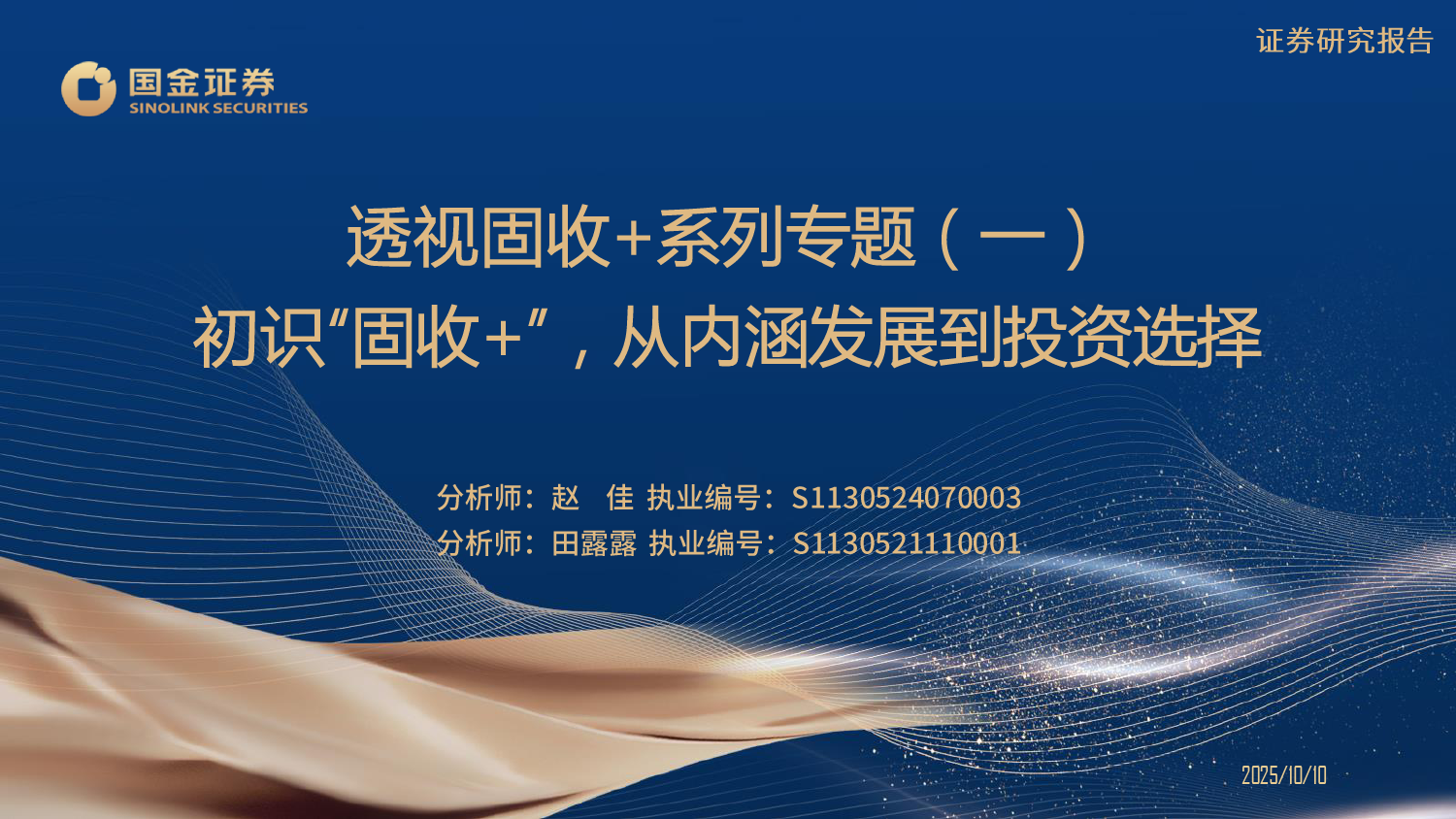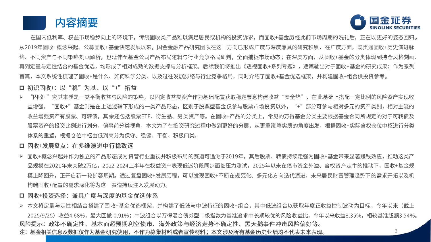 透视固收+系列专题(一)初识“固收+”,从内涵发展到投资选择2025/10/102初识固收+:以“稳”为基、以“+”拓益固收+发展盘点:在多维演进中行稳致远固收+投资选择:兼具广度与深度的基金优选体系301初识固收+:以“稳”为基、以“+”拓益4资料来源:国金证券研究所5-股票-定增-二级投资数据来源:Wind,国金证券研究所;注:业绩统计截至2025/6/30602固收+发展盘点:在多维演进中行稳致远78数据来源:Wind,国金证券研究所;注:规模统计截至2025/6/309数据来源:Wind,国金证券研究所;注:规模统计截至2025/6/3010数据来源:Wind,国金证券研究所;注:规模及持有份额统计截至2025/6/3011数据来源:Wind,国金证券研究所;注:规模统计截至2025/6/3012数据来源...