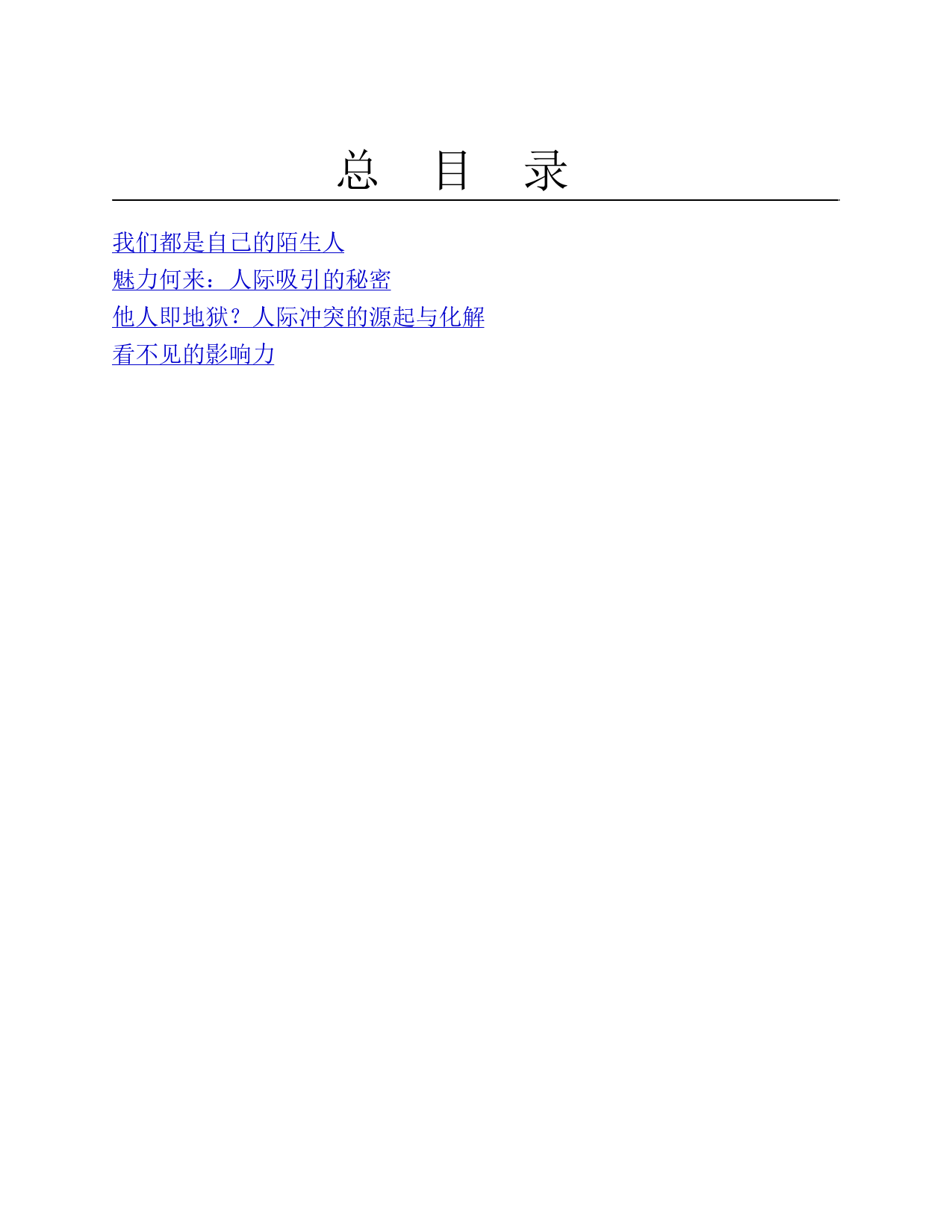 总目录我们都是自己的陌生人魅力何来:人际吸引的秘密他人即地狱?人际冲突的源起与化解看不见的影响力目录内容提要引言1自我概念:我是谁2有意识的自我控制3自尊4自我服务偏见5自我表现作者后记:傲慢的危险与积极思维的力量——一对相反的事实编者后记返回总目录内容提要“自我”是当代心理学研究中最为热门的一个主题,也是普通读者最感兴趣的话题之一。人们常常认为自己是最了解自己的人,可是殊不知,我们对于自己的感觉和预测经常是错误的,我们无意之间成了自己最熟悉的陌生人。人们最渴望认识的是自我,而最难认识的往往也是自我。本书改编自戴维·迈尔斯的超级畅销书《社会心理学》。为了更贴近读者,让更多的人接触到优秀的心理学成果,我们剔除了原著中过于学术性的内容和元素,撷取了读者感兴趣的有意...