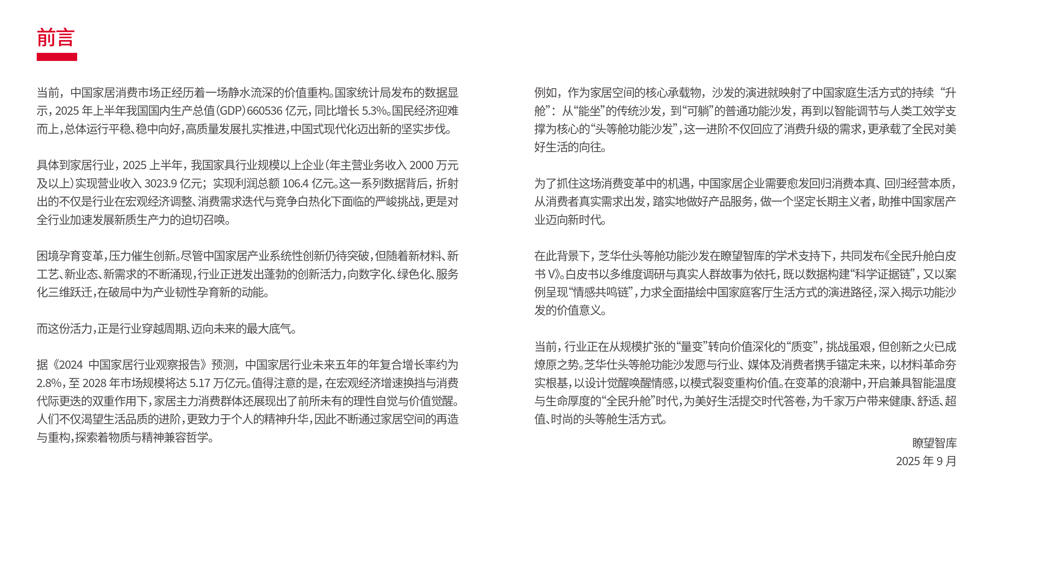 白皮书Ⅴ功能沙发高质量发展白皮书每日免费获取报告1、每日微信群内分享8+最新重磅报告;2、每日分享当日华尔街日报、金融时报;3、每周分享经济学人4、行研报告均为公开版,权利归原作者所有,小马财经仅分发做内部学习。扫一扫二维码关注公众号回复:研究报告加入“小马财经”微信群。前言例如,作为家居空间的核心承载物,沙发的演进就映射了中国家庭生活方式的持续“升舱”:从“能坐”的传统沙发,到“可躺”的普通功能沙发,再到以智能调节与人类工效学支当前,中国家居消费市场正经历着一场静水流深的价值重构。国家统计局发布的数据显撑为核心的“头等舱功能沙发”,这一进阶不仅回应了消费升级的需求,更承载了全民对美示,����年上半年我国国内生产总值(GDP)������亿元,同比增长�.�%。国...