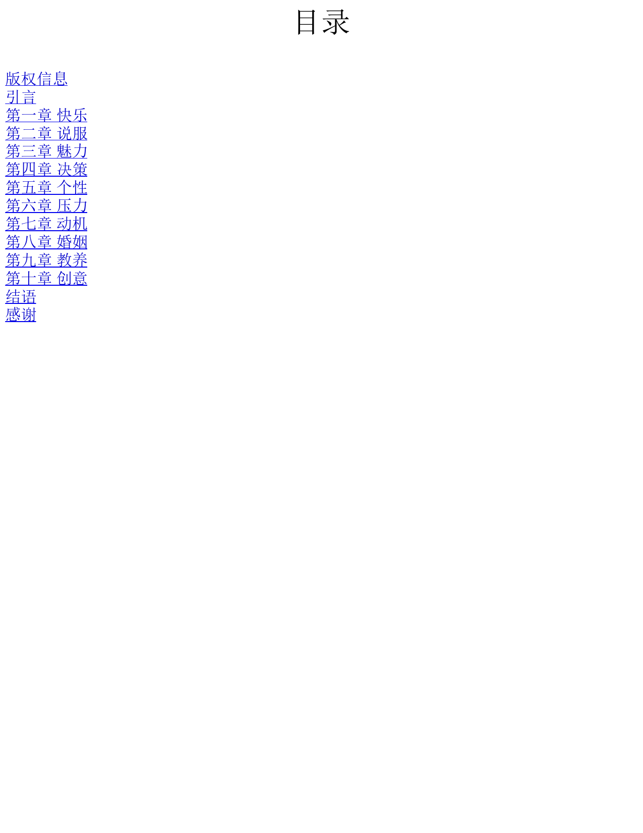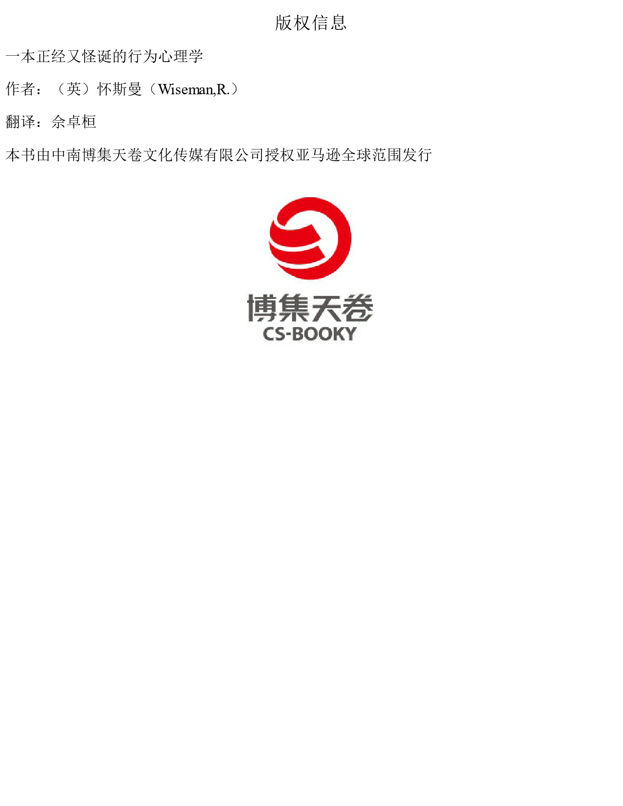 版权信息一本正经又怪诞的行为心理学作者:(英)怀斯曼(Wiseman,R.)翻译:佘卓桓本书由中南博集天卷文化传媒有限公司授权亚马逊全球范围发行目录版权信息引言第一章快乐第二章说服第三章魅力第四章决策第五章个性第六章压力第七章动机第八章婚姻第九章教养第十章创意结语感谢引言你有没有想过让自己的人生变得更完美?比如减肥成功、找到完美的人生伴侣、得到一份梦寐以求的工作,或是活得更快乐一点?你可以简单地做如下尝试:闭上眼睛,想象一个全新的你。想象满身名牌的你是多么有魅力,想象你身居公司高层,正跟布拉德·皮特或是安吉丽娜·朱莉坐在舒适的皮椅上,或是想象自己正在加勒比海边品尝一杯勾兑上佳的朗姆酒,海水轻轻拍打着你的双脚,这感觉是多么的美妙!在当前的高压环境里,一些自我激励行业...